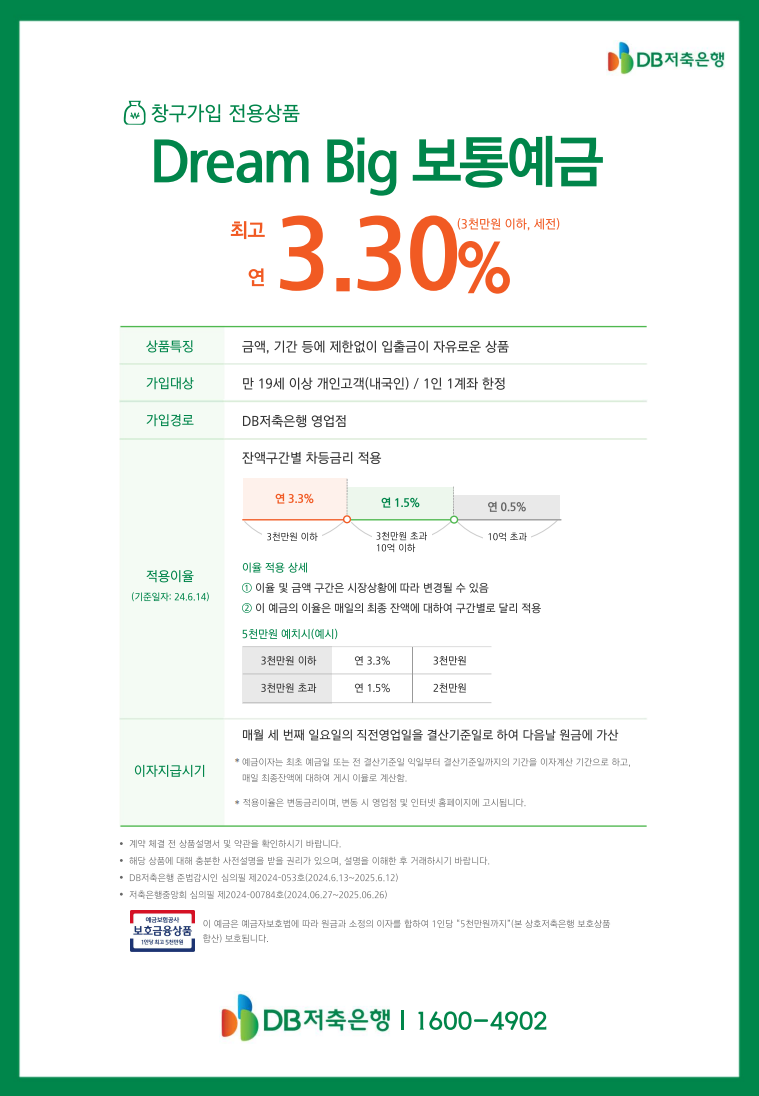 ② 드림빅보통예금(3.3%)가입 (관리부점 “다동” 필수)