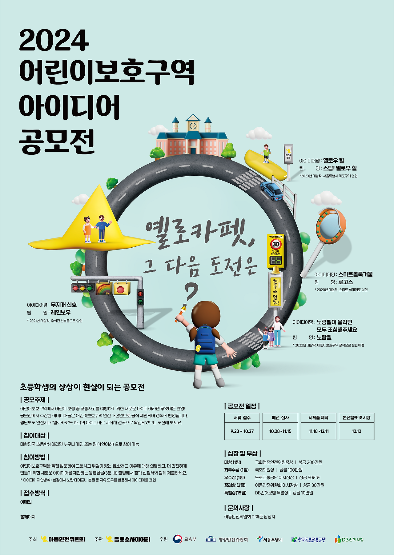 DB손해보험(대표 정종표)은 아동안전위원회(이사장 이제복)와 교육부, 국회 행정안전위원회, 서울특별시, 도로교통공단, 옐로소사이어티와 함께 9월 23일부터 10월 27일까지 ‘2024 어린이보호구역 아이디어 공모전’을 개최한다고 9월 20일 밝혔다.
