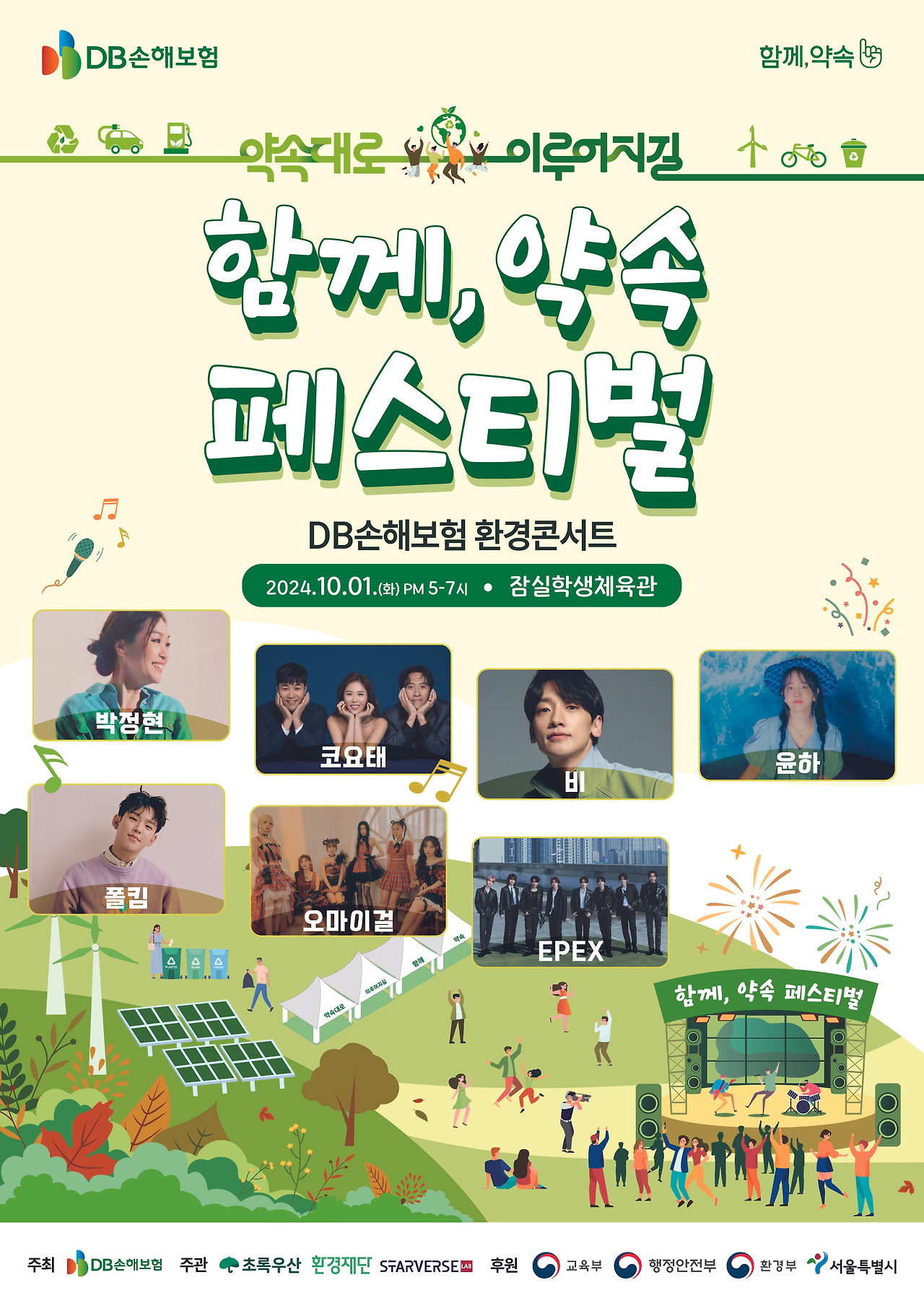 먼저 DB손해보험 환경콘서트 '2024 함께, 약속 페스티벌'은 "약속대로 이루어지길"이라는 슬로건으로 10월 1일 화요일 오후 5시부터 7시까지 잠실학생체육관에서 진행된다.