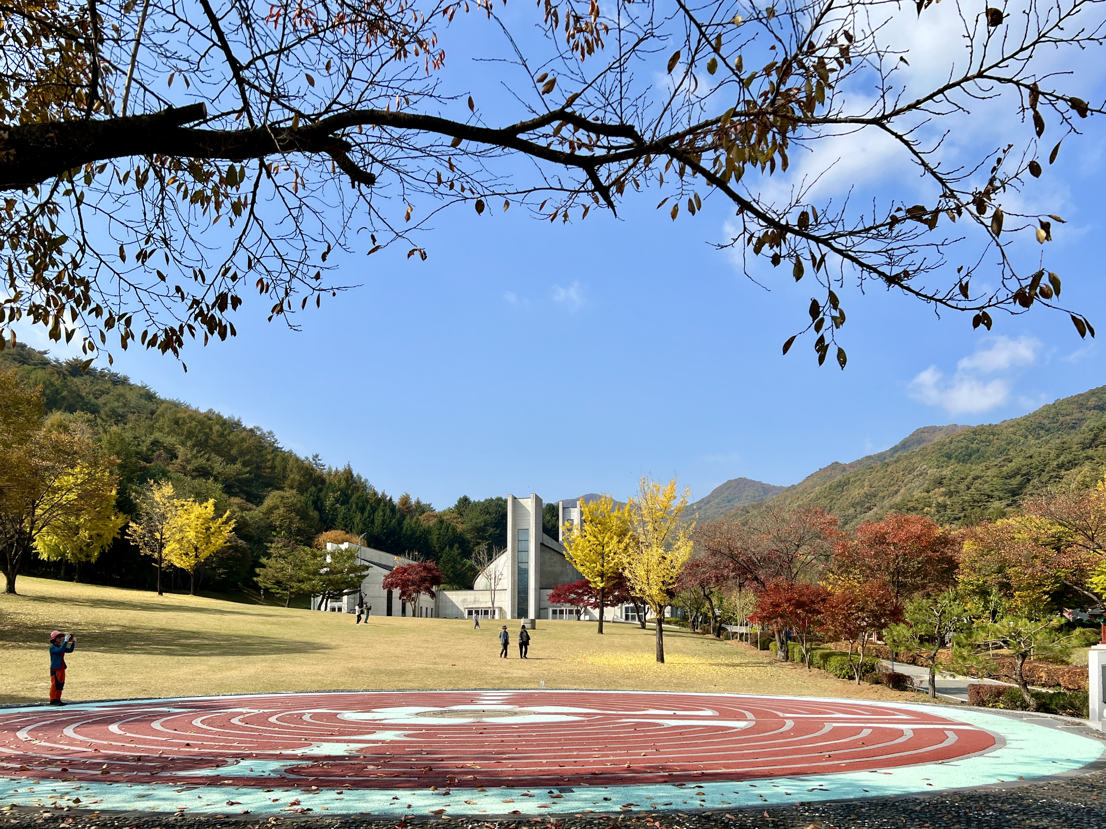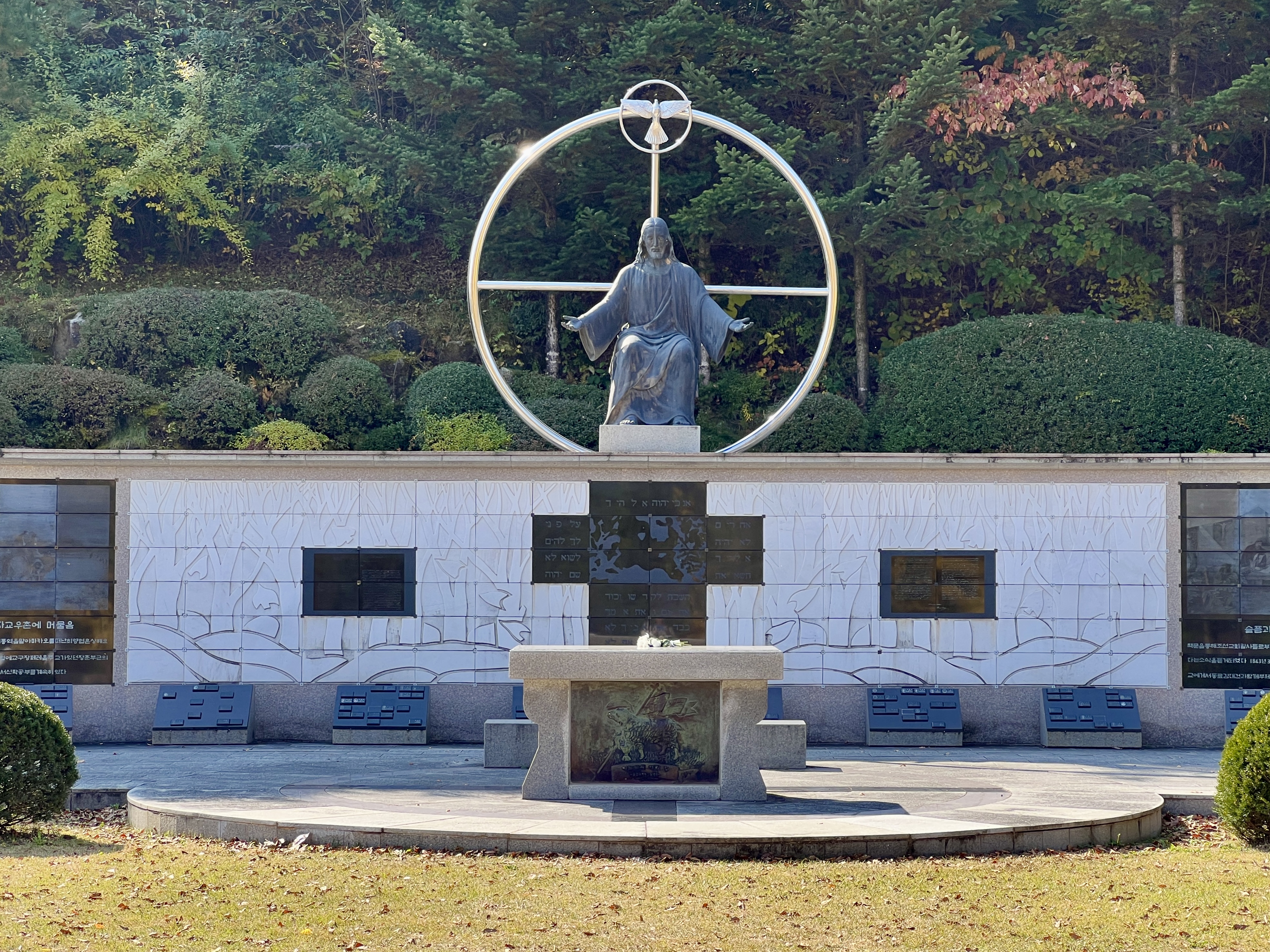 영내로 들어서면 가장 먼저 짙은 연못과 두 팔 벌린 예수상이 방문객을 맞이해요. 각기 다른 빛깔로 물든 단풍나무와 은행나무, 느티나무가 연못 주변을 감싸고 있어서 가을 정취가 물씬 느껴져요. 연못을 가로지르는 구름다리 위에 올라서면 한 폭의 풍경화 속에 들어와 있는 것 같답니다.