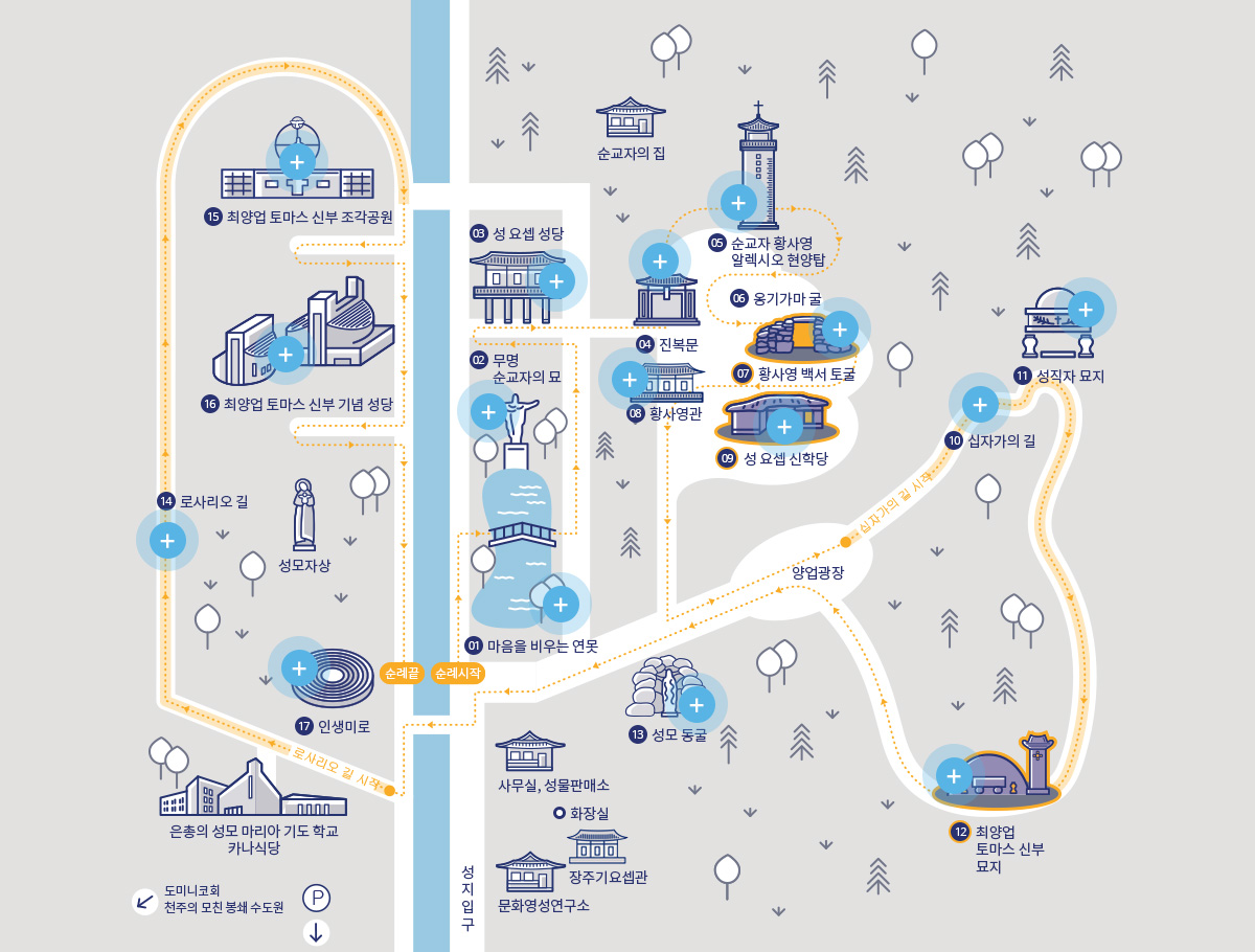이곳 산골짝 지형이 ‘배 밑창’을 닮아서 ‘배론(舟論)’이라 불렀는데요. 여기가 우리나라 천주교 역사의 중요한 장을 채우고 있는 '배론성지'입니다. 2020년 완공된 '은총의 성모마리아 기도학교'를 거쳐 제천천의 상류인 두학천을 건너면서 열일곱 구역으로 이어진 순례길이 시작돼요.