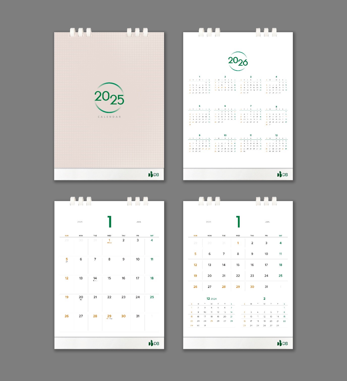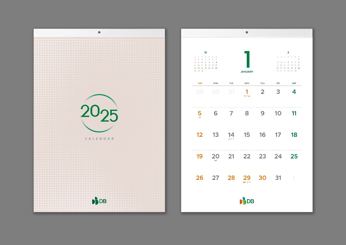 벽걸이 캘린더는 DB그린을 메인 컬러로, 오렌지를 보조 컬러로 활용하여 고급스러우면서도 경쾌한 분위기를 동시에 담아냈습니다. 심플한 고딕 폰트를 사용한 디자인은 간결하고 직관적으로 정보를 전달하며, 세련된 느낌을 강조합니다.