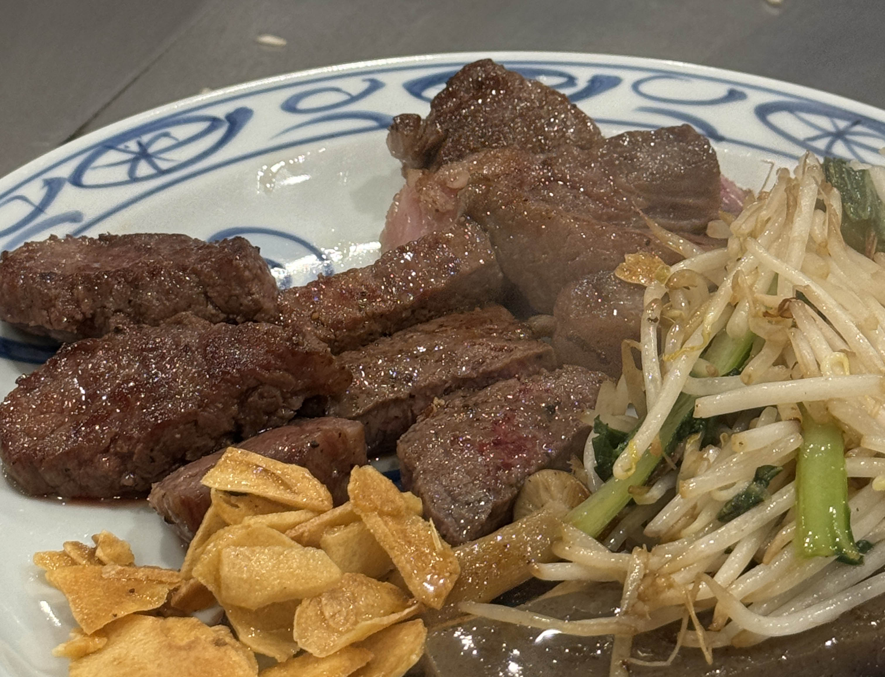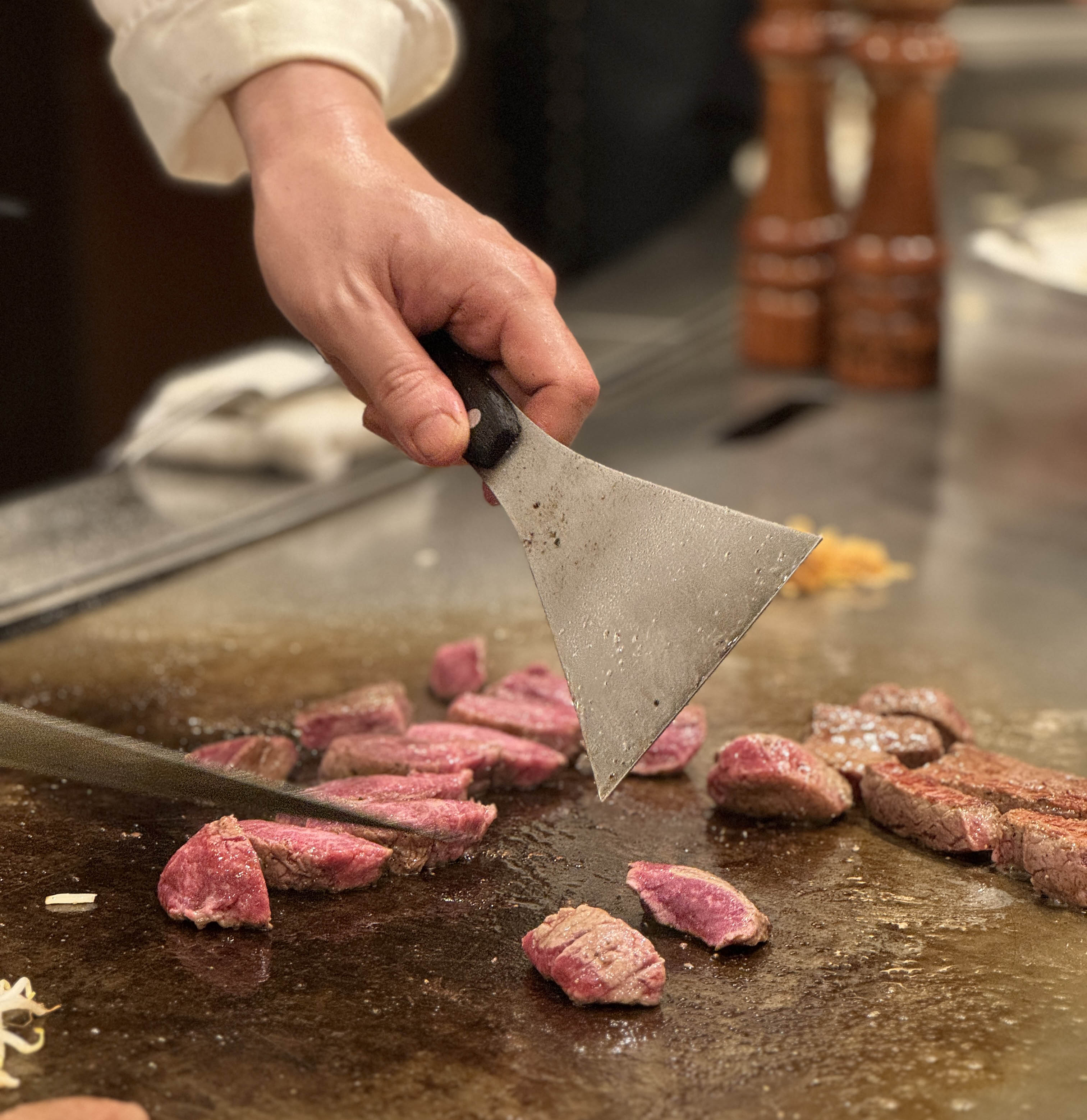 또한 스테이크랜드는 런치타임에 방문했을 때 인당 3-4만 원으로 식사를 즐길 수 있을 만큼 가성비가 좋은 곳으로도 유명하답니다. 저는 고베의 야경을 보러 방문했기 때문에 디너로 이용했는데요. 디너 역시 인당 7만 원 내외에서 식사를 할 수 있어 몹시 합리적인 가격이라고 생각합니다. 원하는 스테이크 부위를 고르면 구이 채소들과 갈릭칩이 함께 즉석에서 철판으로 요리를 해 주는 모습을 볼 수 있습니다.