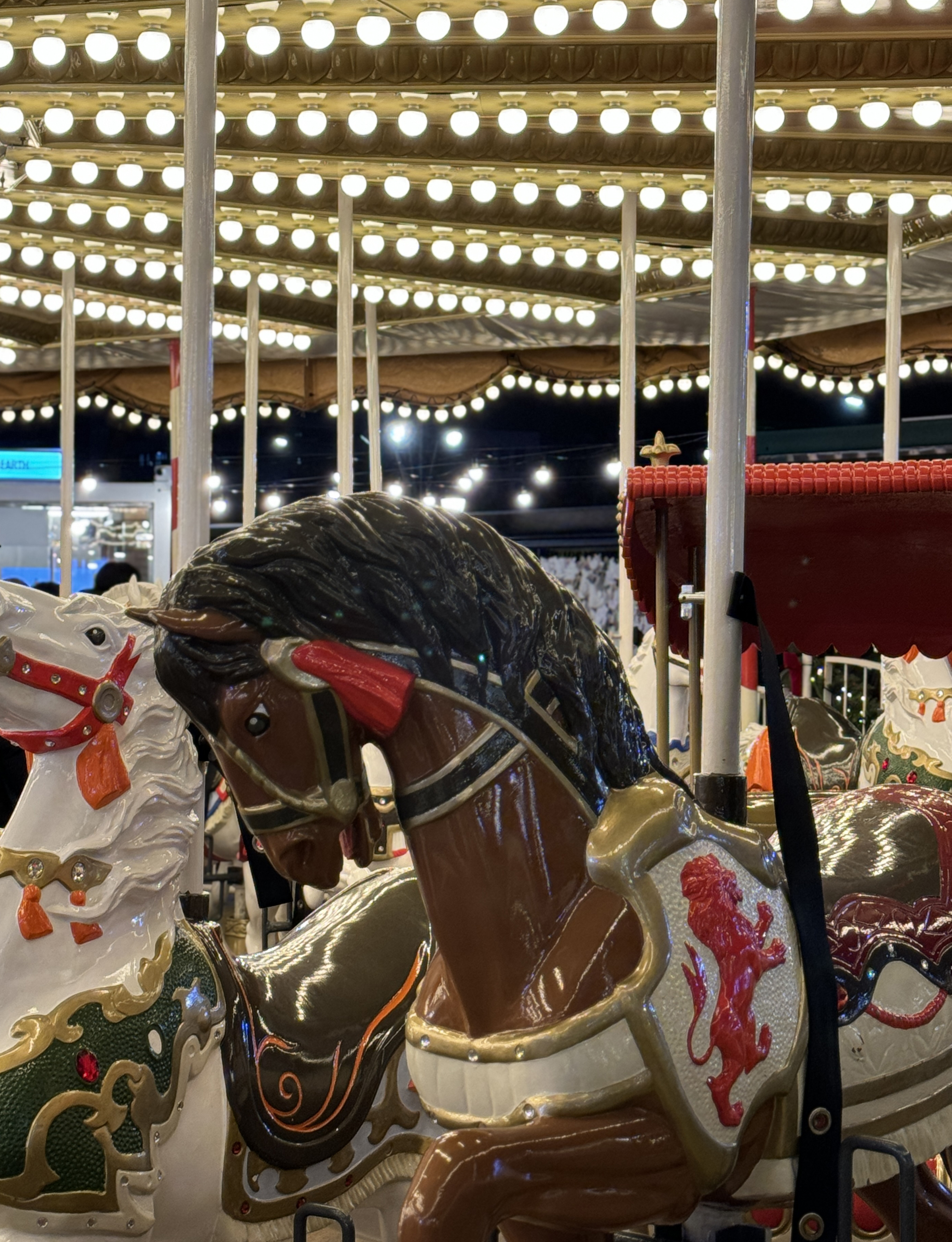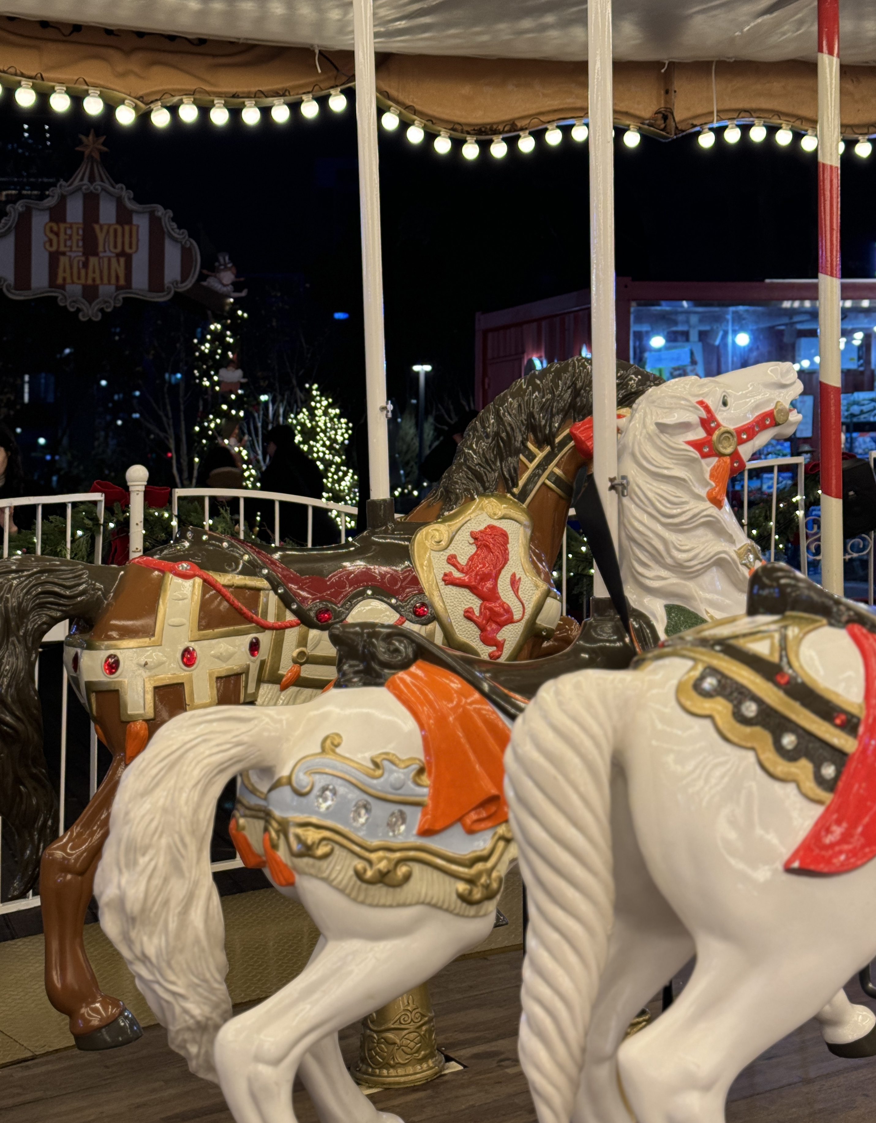 존재 자체로 동심으로 돌아가게 해주는 놀이 기구죠, 회전목마 역시 입장 고객이라면 누구나 무료 이용이 가능합니다. 작년까지는 롯데월드몰 내에서 일정 금액 이상 구매한 영수증이 있어야 이용이 가능했던 회전목마, 올해 크리스마스 마켓은 유료로 판매됨과 동시에 입장객이라면 누구든 무료로 횟수 제한 없이 회전목마에 탑승할 수 있습니다. 사람이 많아 대기시간이 필요하지만, 짧은 시간 운영하기도 하고 한 번에 많은 인원이 탑승할 수 있어 생각보다 금방 차례가 다가오니 회전목마에서 예쁜 사진을 남겨 보시는걸 추천합니다.