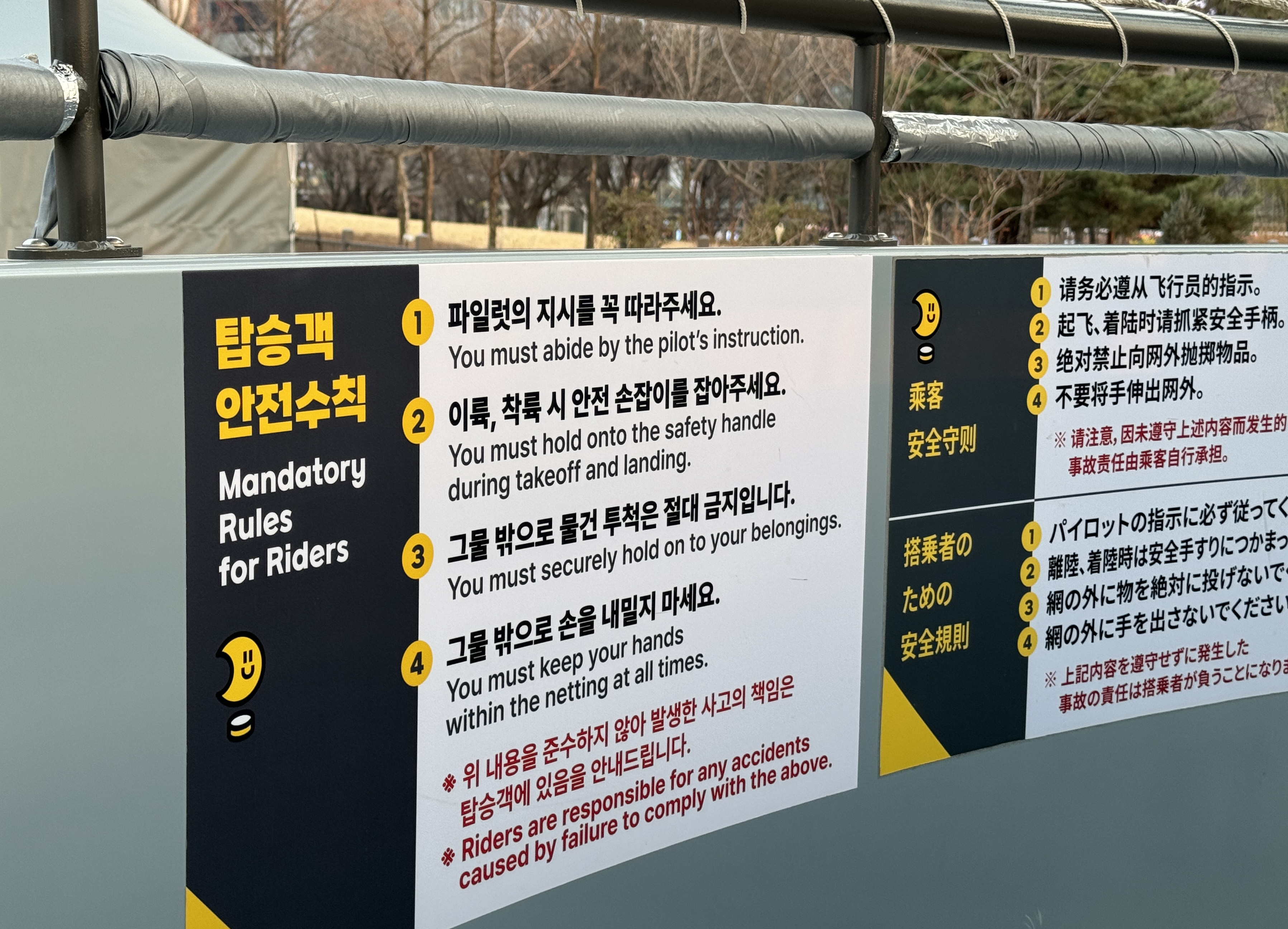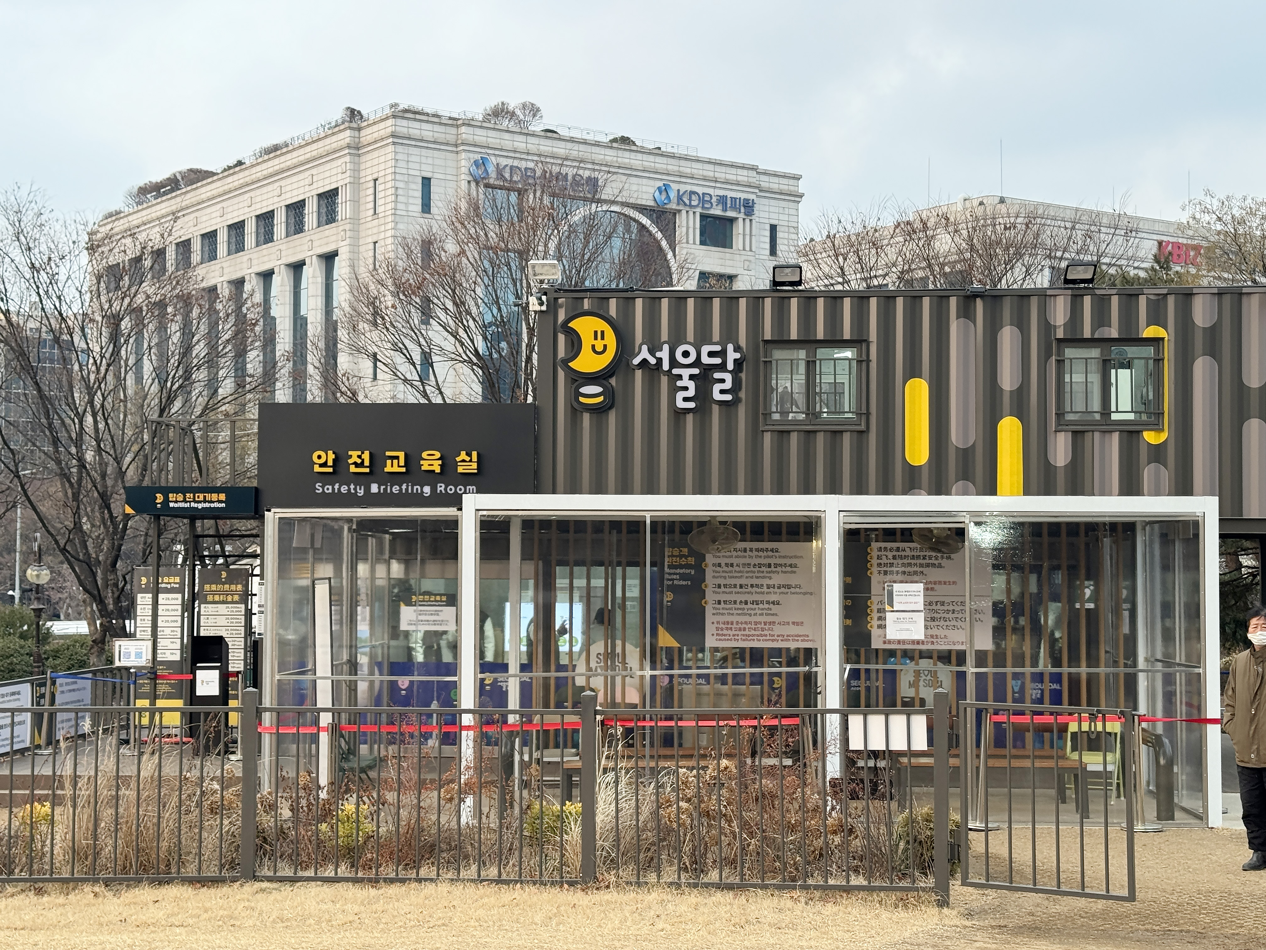 서울달은 130m 상공까지 올라가기 때문에 탑승 전 안전 수칙을 단단히 숙지한 후 탑승해야 합니다. 가장 중요한 점은 좌우 균형을 맞추어 위치해야 하는데요. 위치에 따라 한강뷰와 시티뷰가 나뉘지만, 상공에 올라가고 나서는 잠시 머무르다 서로 자리를 바꾸어 관람할 수 있도록 도와주시니 파일럿님의 안내가 있을 때까지 임의로 위치를 이동하지 않는 것이 중요합니다. 서울달은 시민이 함께 하는 여의도 공원 내에서 운행되기 때문에 그물 밖으로 카메라나 휴대폰 등 물체를 밖으로 내밀 경우 떨어뜨렸을 때 큰 사고가 있을 수 있으니 조심해 주세요!