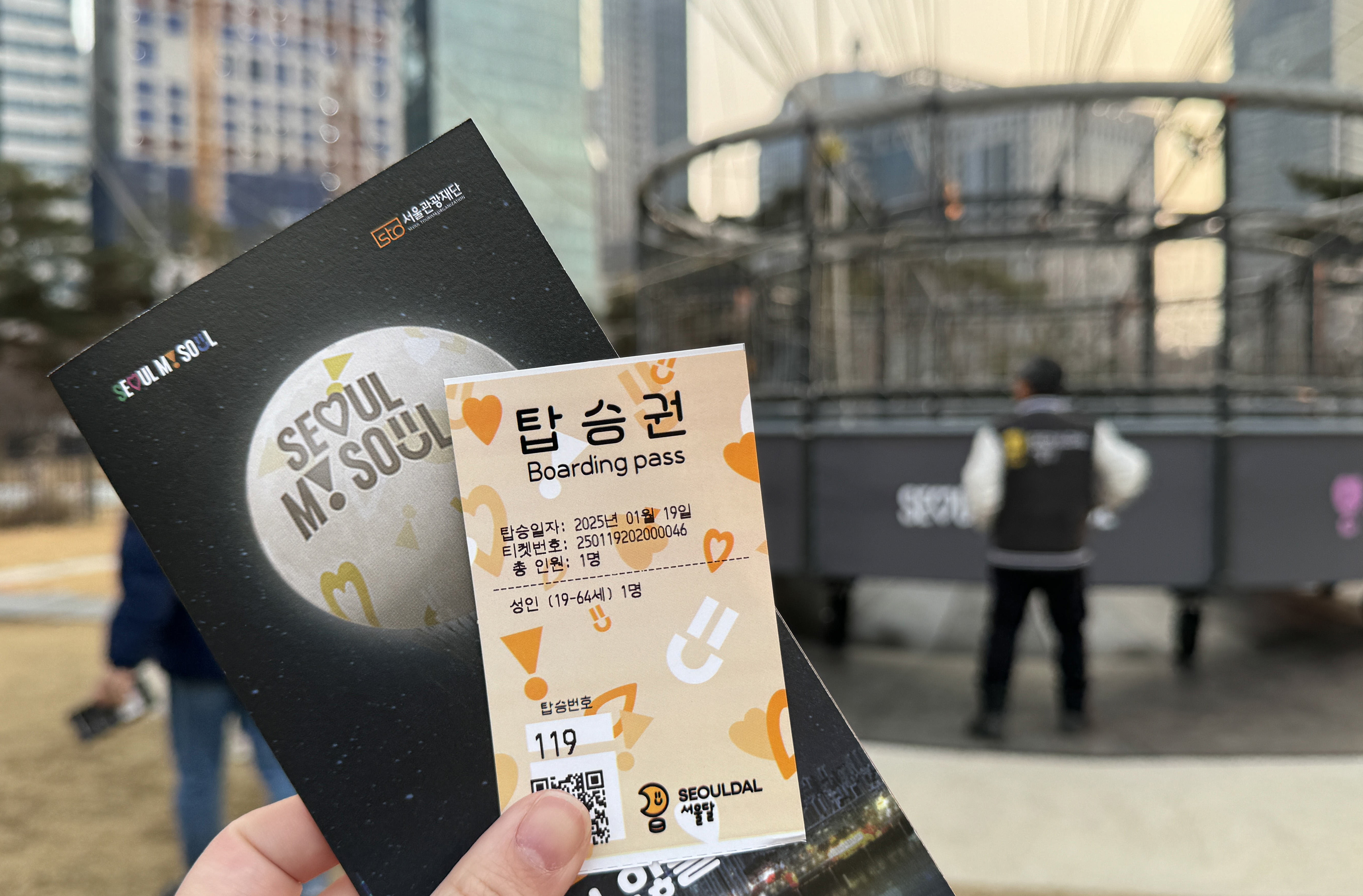 키오스크에서 탑승권 구매하셨다면 기다리는 동안 안전한 이용을 위한 안내를 듣고, QR코드를 이용해 이용 동의서 작성 후 잠시 대기해 주세요. 대기하는 동안 마련되어 있는 서울 굿즈 홍보존을 구경하거나 주말, 연휴를 맞아 웨이팅이 오래 걸린다면 문자로 탑승 안내를 받을 수 있으니 인근 IFC 몰 등에서 시간을 보내는 것도 좋습니다.