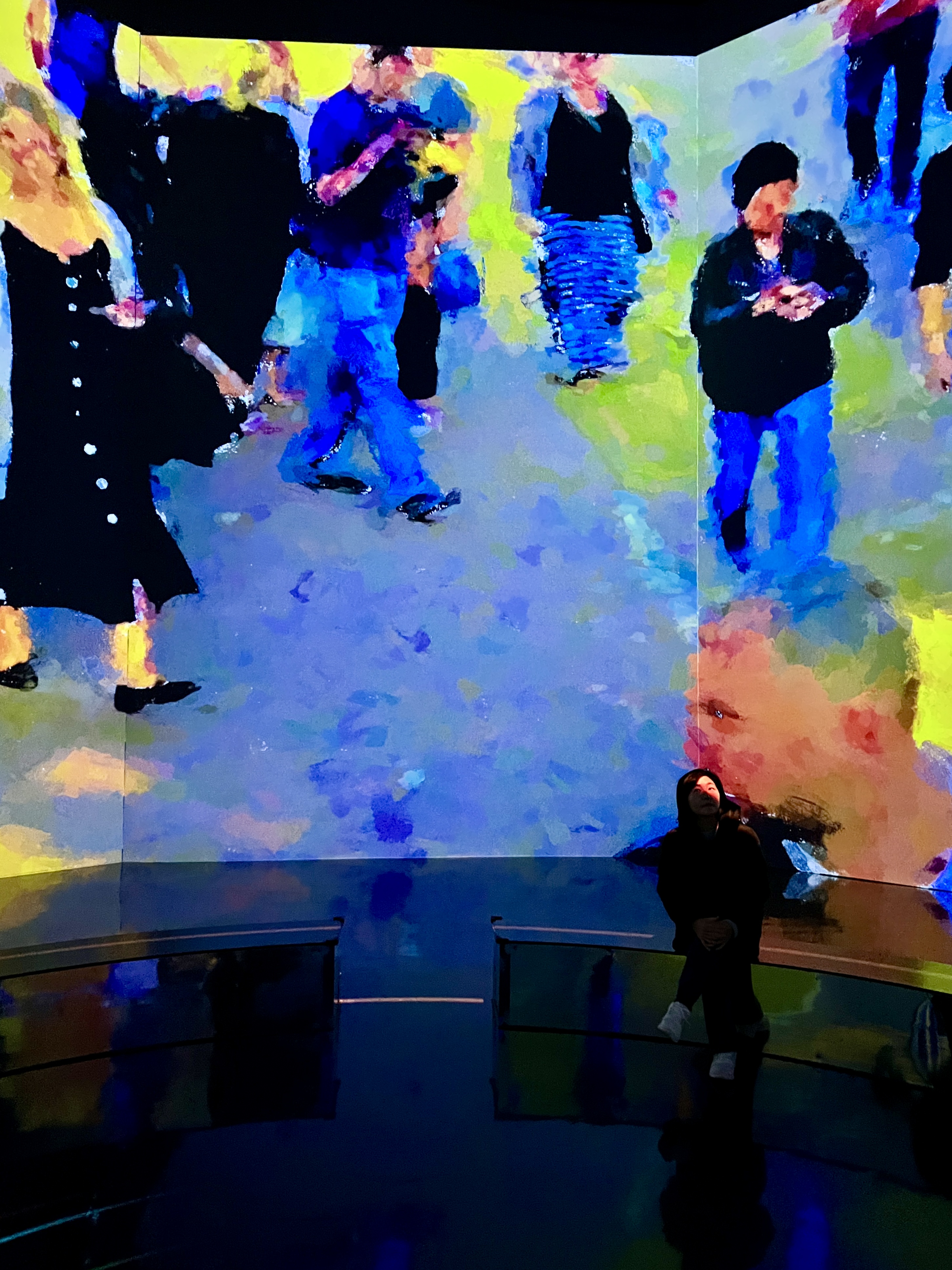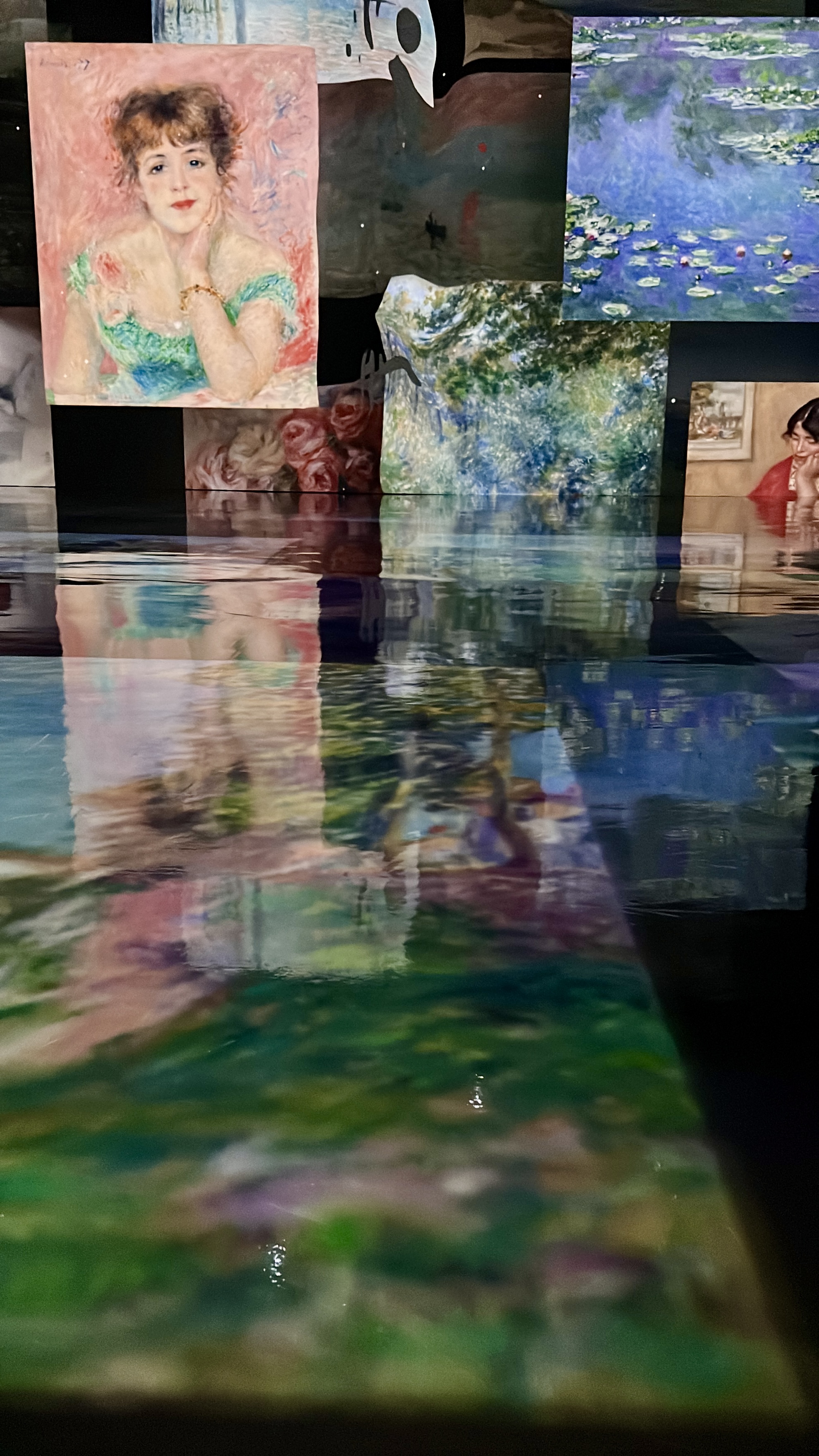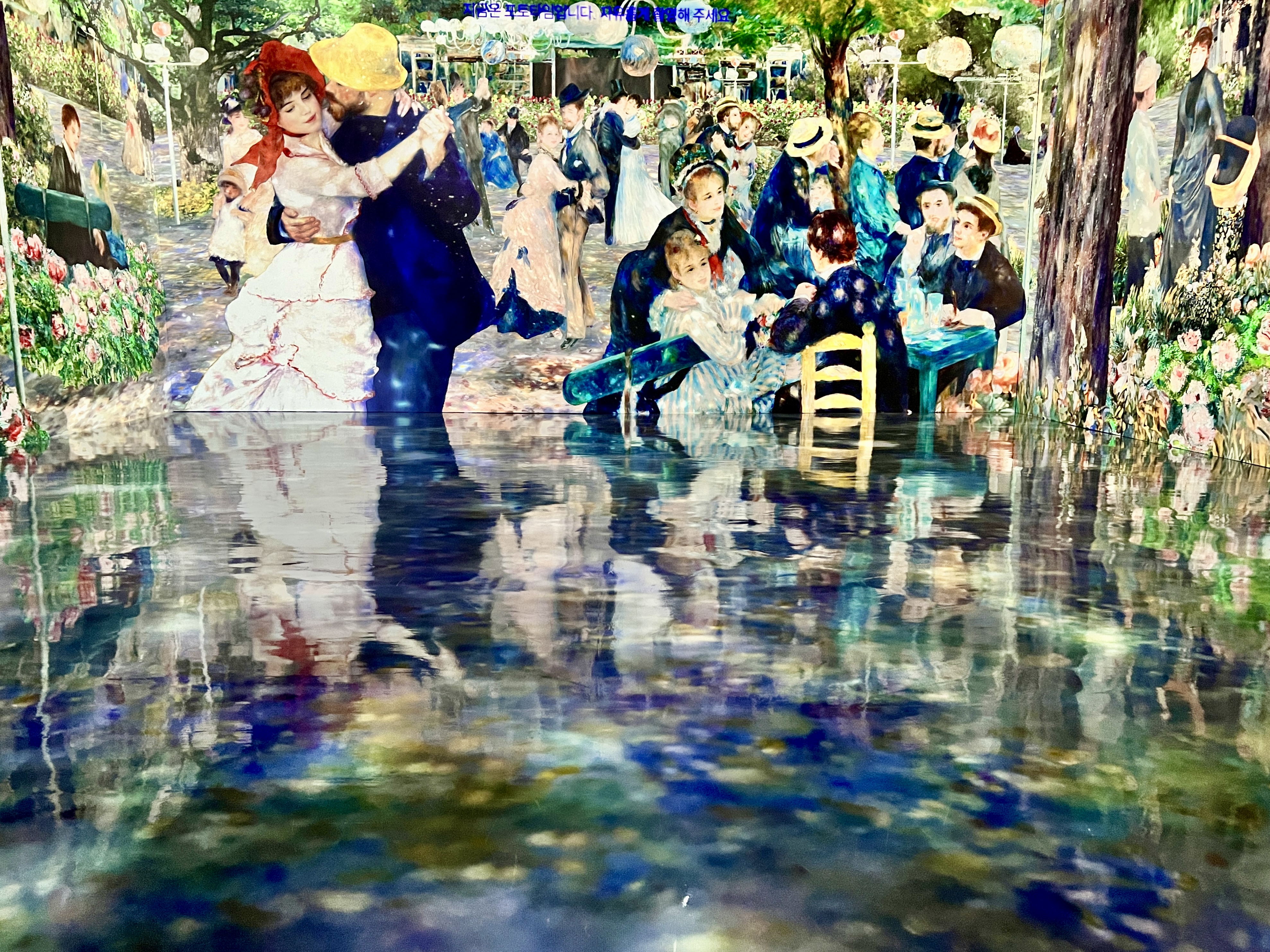 프로젝션 맵핑 방식으로 제작된 이 작품은 1층과 2층에서 즐길 수 있도록 넓은 공간에 투사되어 관람객의 시야 전체를 뒤덮는데요. 거대한 명화 속의 주인공이 되어 르누아르의 인생을 바라보고 느낄 수 있어요.