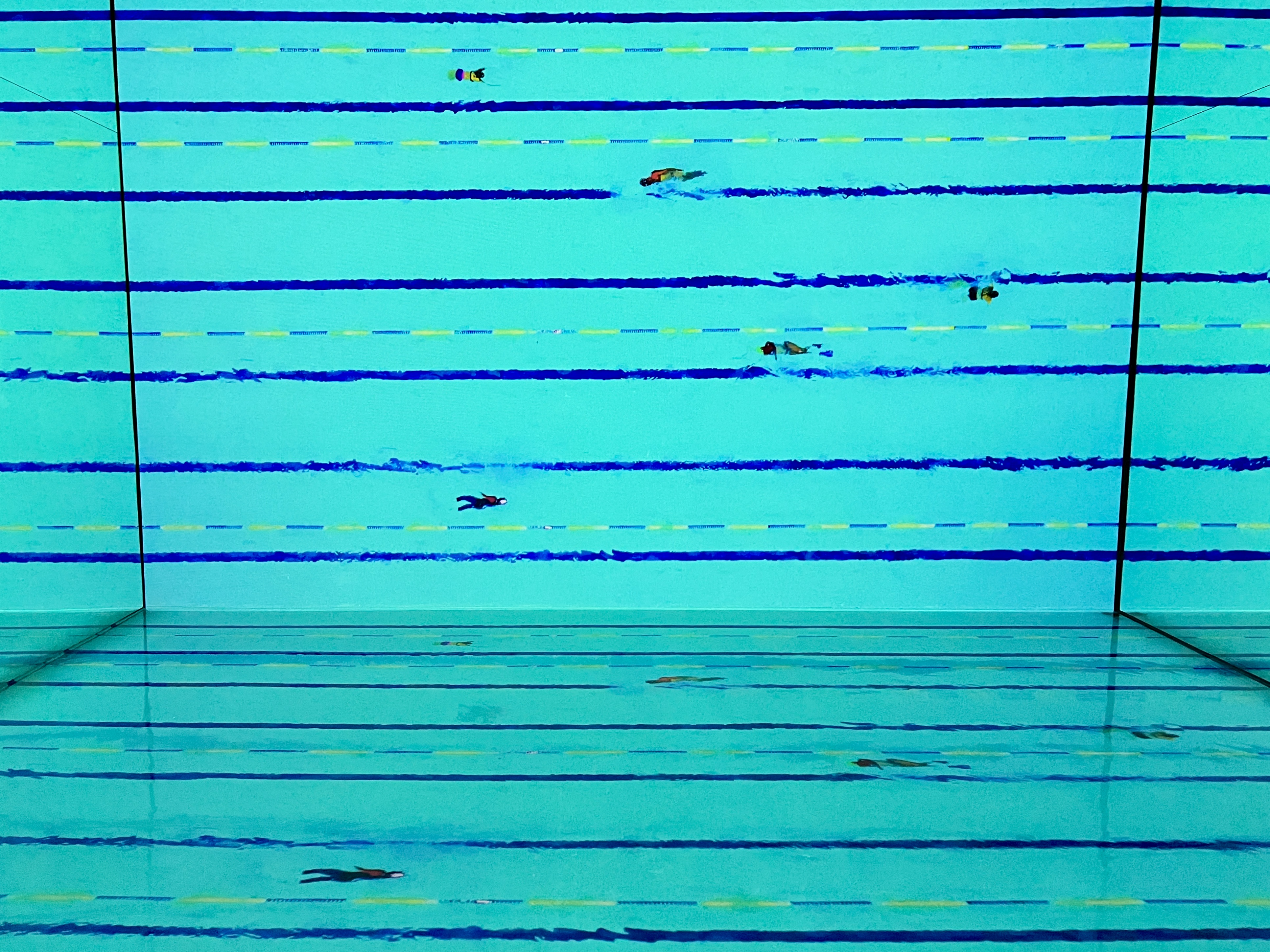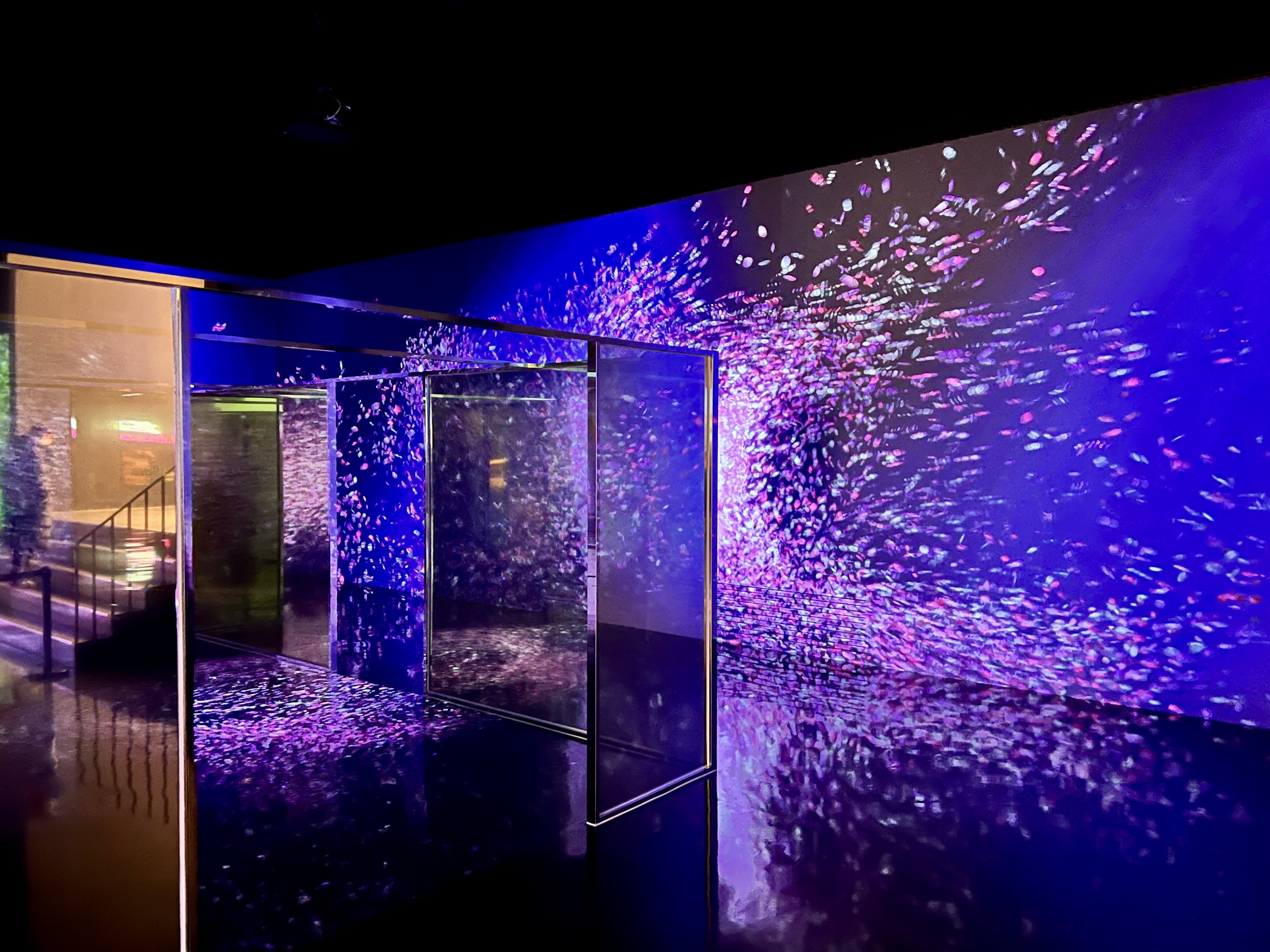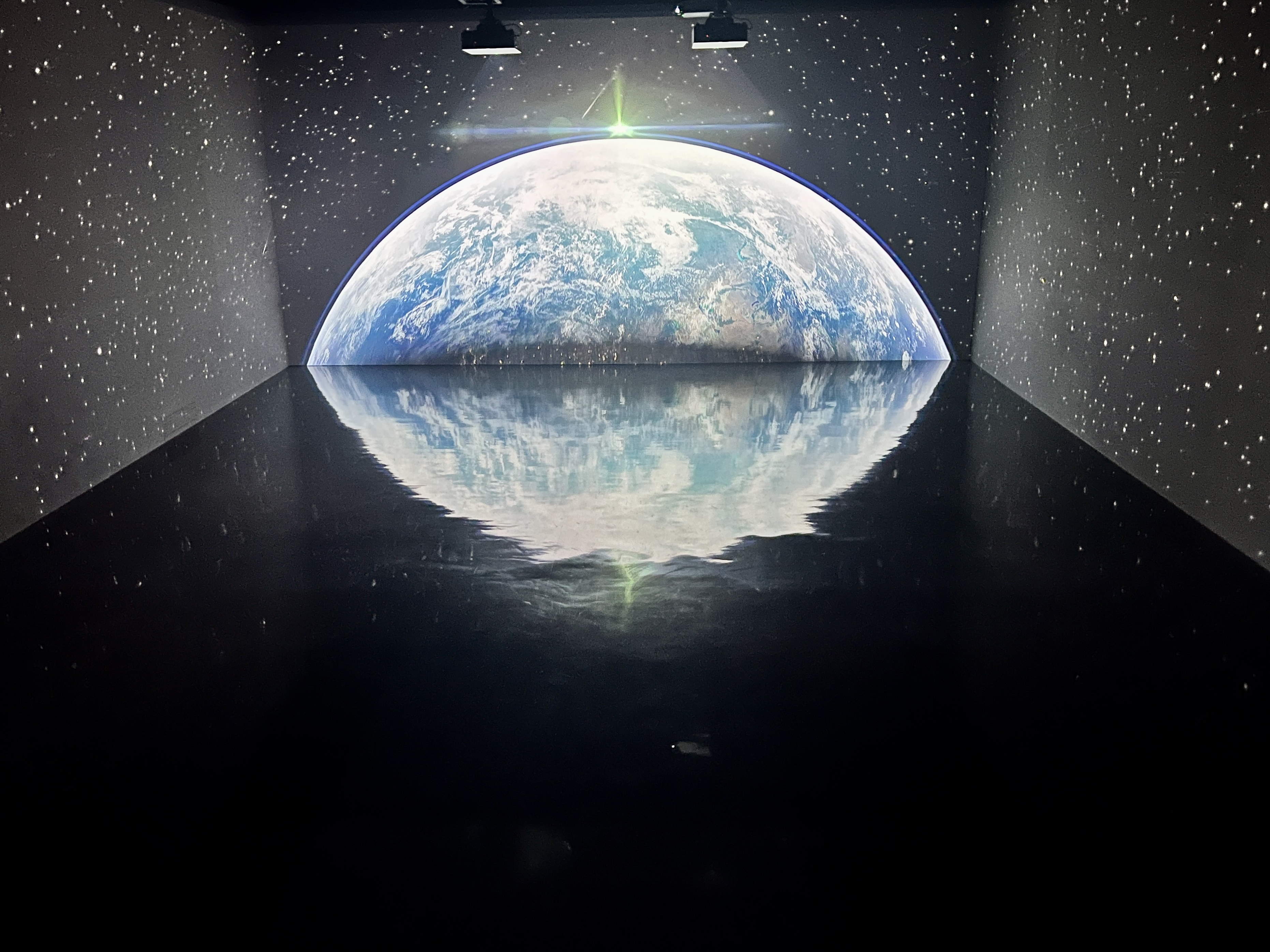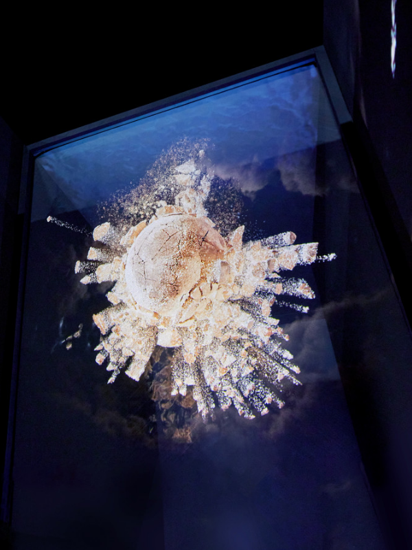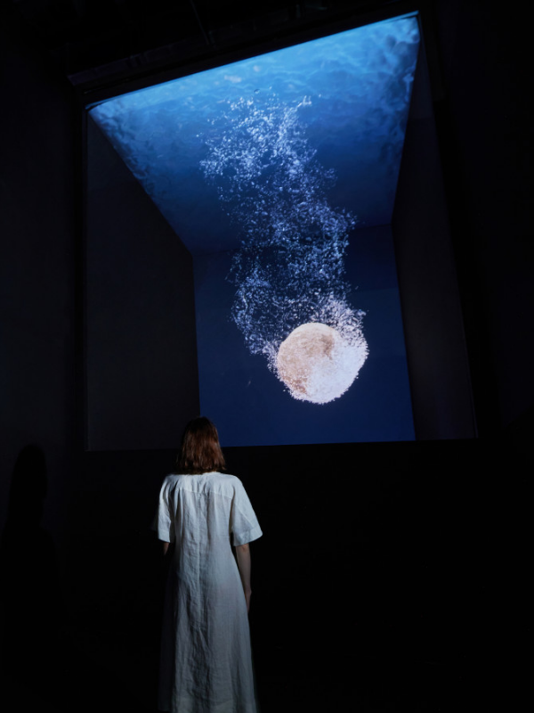 큐브 형태의 공간에 천장까지 가득 찬 물 으로 달이 풍덩 빠지는 모습과 함께 눈앞까지 튀어나올 듯 날아오는 달이 빛을 뿜으며 부서지면서 공간감과 입체감을 동시에 느낄 수 있는 작품이죠.
