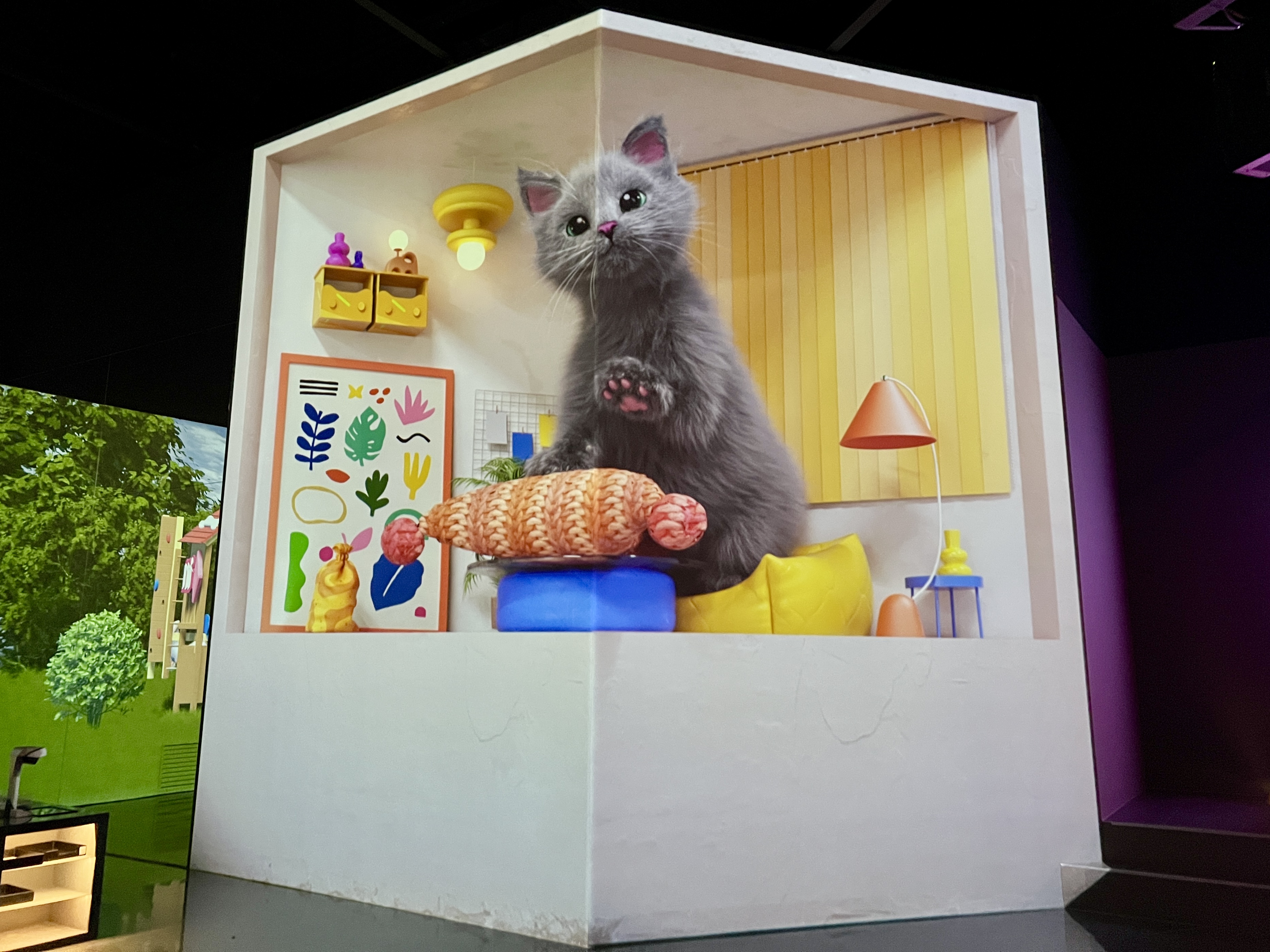 꾹꾹이와 하품을 하며 잘 준비를 하는 고양이의 리얼한 모습을 평면에 착시효과를 통해 입체감을 느낄 수 있는 아나몰픽 기법을 활용하여 몰입형 미디어아트로 구현했어요.