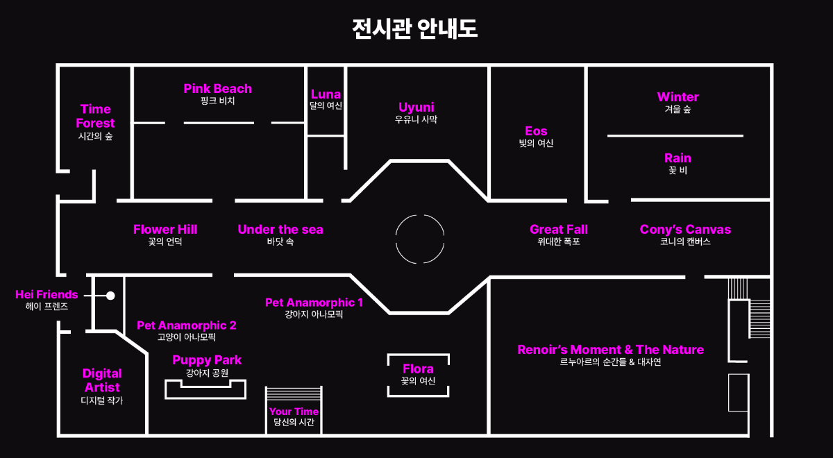 작품 '행복을 그리는 화가, 르누아르'와 '대자연'은 매시간 30분 동안 상영되며 단순한 그림 감상이 아니라 또 다른 초현실적인 세계로 관람객을 초대합니다.