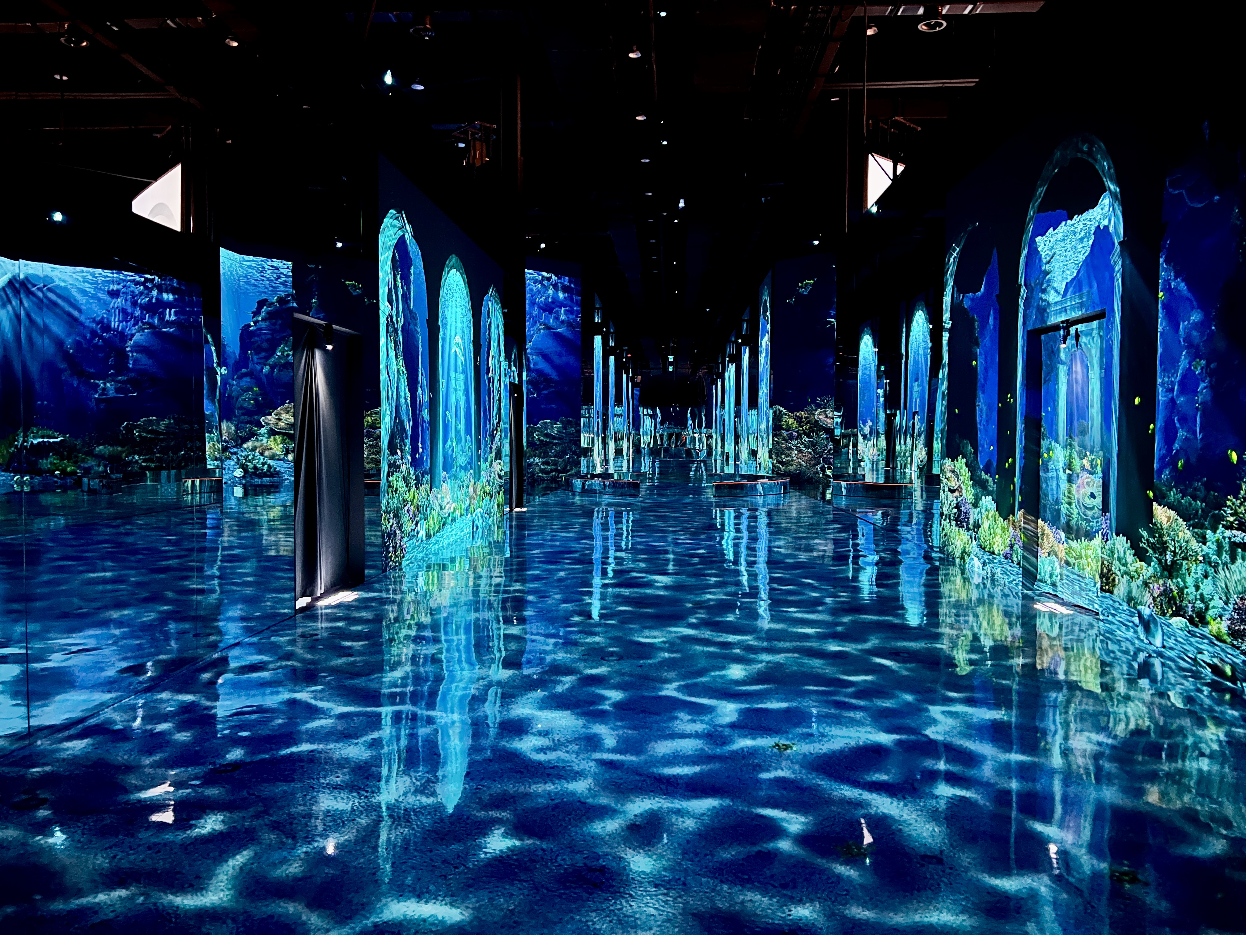 아름다운 유적의 아치 너머로 푸른 바다의 물결이 끝없이 펼쳐져 마치 바닷속에 들어와 있는 듯한 착각을 불러일으키는 몰입형 미디어아트 작품이었어요.