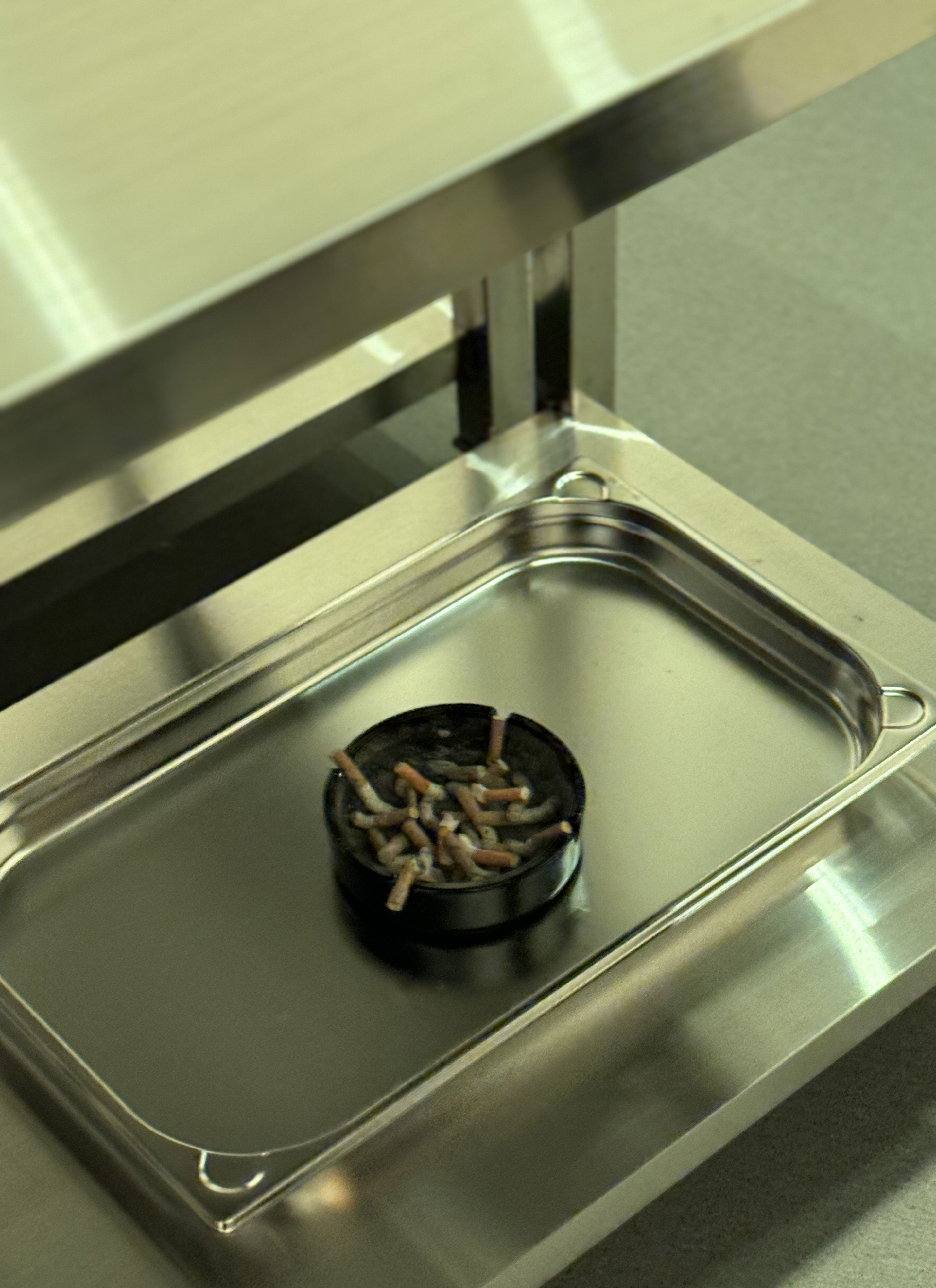 분명 주방임이 분명해 보이는데, 음식은 안 보이고 냉장고에 있는 커다란 알과 주방엔 어울리지 않는 재떨와 같이 뜬금없는 요소들을 발견할 수 있습니다. 일견 관련 없어 보이는 이 두 장소의 대조는 기후 변화, 인구 증가, 천연자원의 감소 속에서 식재료 역시 실험실 학에 더욱 의존하게 되는 현 세태를 단편적으로 보여주고자 했다고 합니다. 곳곳에 녹아 있는 작가의 단서들을 찾아 작가가 어떤 이야기를 하고 싶었는지 생각해 보세요.