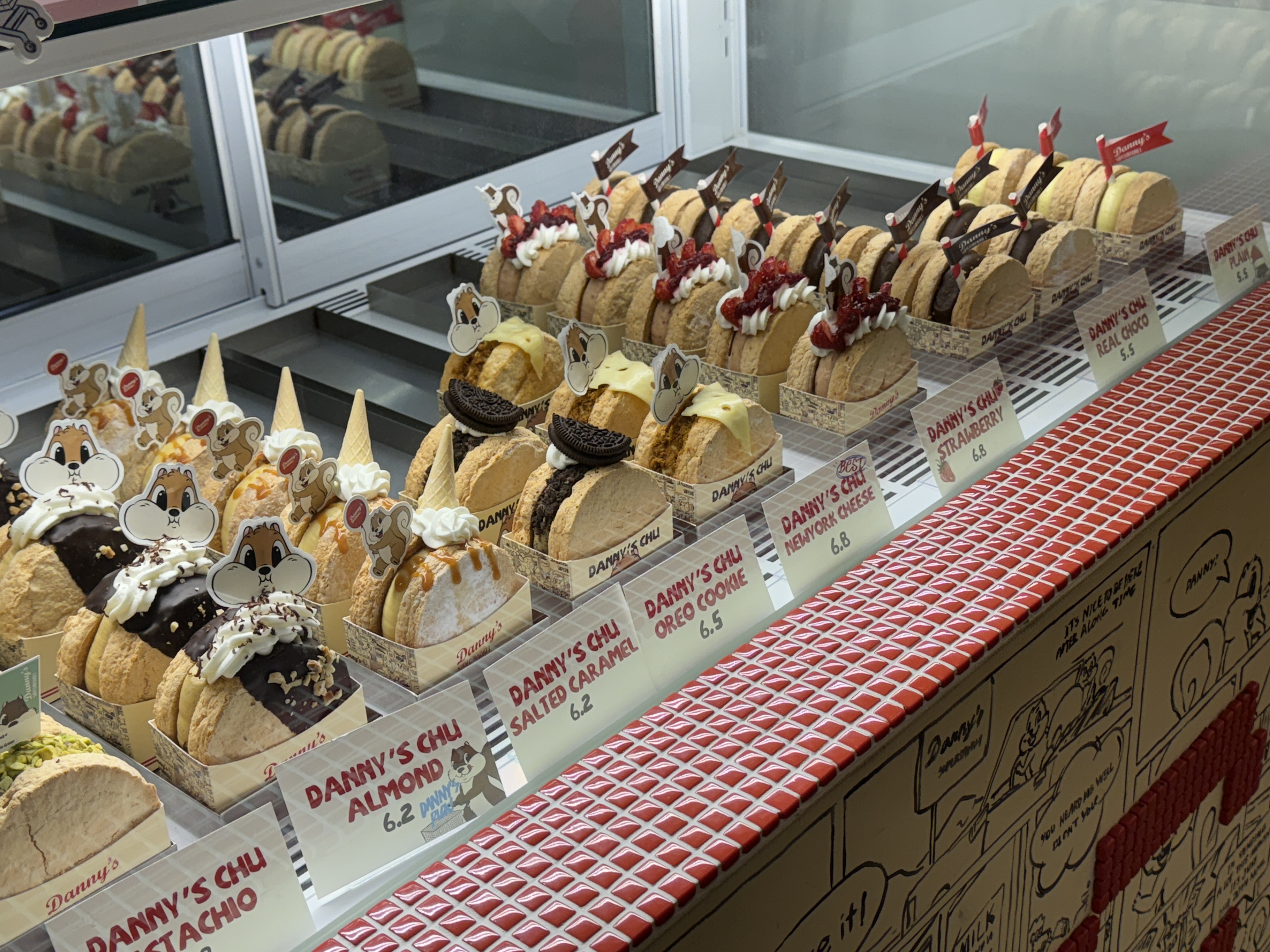 미국의 슈퍼마켓에 잠시 들른 것 같은 재미있는 경험을 해주는 장소는 또 하나의 성수동 ‘대니스 수퍼 마켓’입니다. 이케아 속 푸드코트처럼 귀여운 굿즈들과 빨간색 카트, 마트에 마련된 조그만 테이블들이 눈에 띄는데요. 대표적인 메뉴로는 츄러스를 포함해 도넛과 파이류들 그리고 티셔츠 같은 제법 퀄리티가 좋은 굿즈를 구매할 수 있습니다. 카트부터 시리얼 박스까지 손님들이 자유롭게 컨셉 사진을 연출하기 좋게 공간의 구석구석을 알뜰하게 꾸며둔 것이 눈에 띕니다. 친구, 연인 뿐 아니라 우리 반려동물과도 동반이 가능한 공간이니 참고하시길 바랍니다.