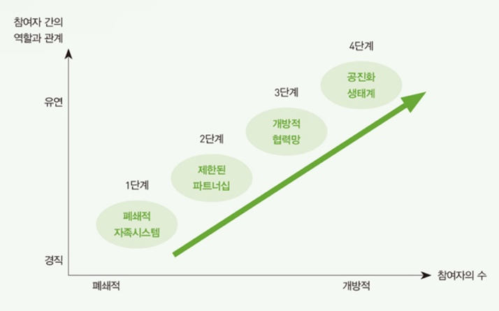 비즈니스의 주체들이 열린 생태계를 지향하며 공동 성장하는 공진화는 참여자의 수가 얼마나 많고 개방적인지에 따라 폐쇄적-개방적 공진화, 참여자들의 역할과 상호 관계가 얼마나 탄력적인가에 따라 경직된-유연한 공진화로 나눌 수 있고, 이 두 요소를 기준으로 온전한 공진화의 개념에 가까워지는 4단계 발달단계로 구분할 수 있어요.