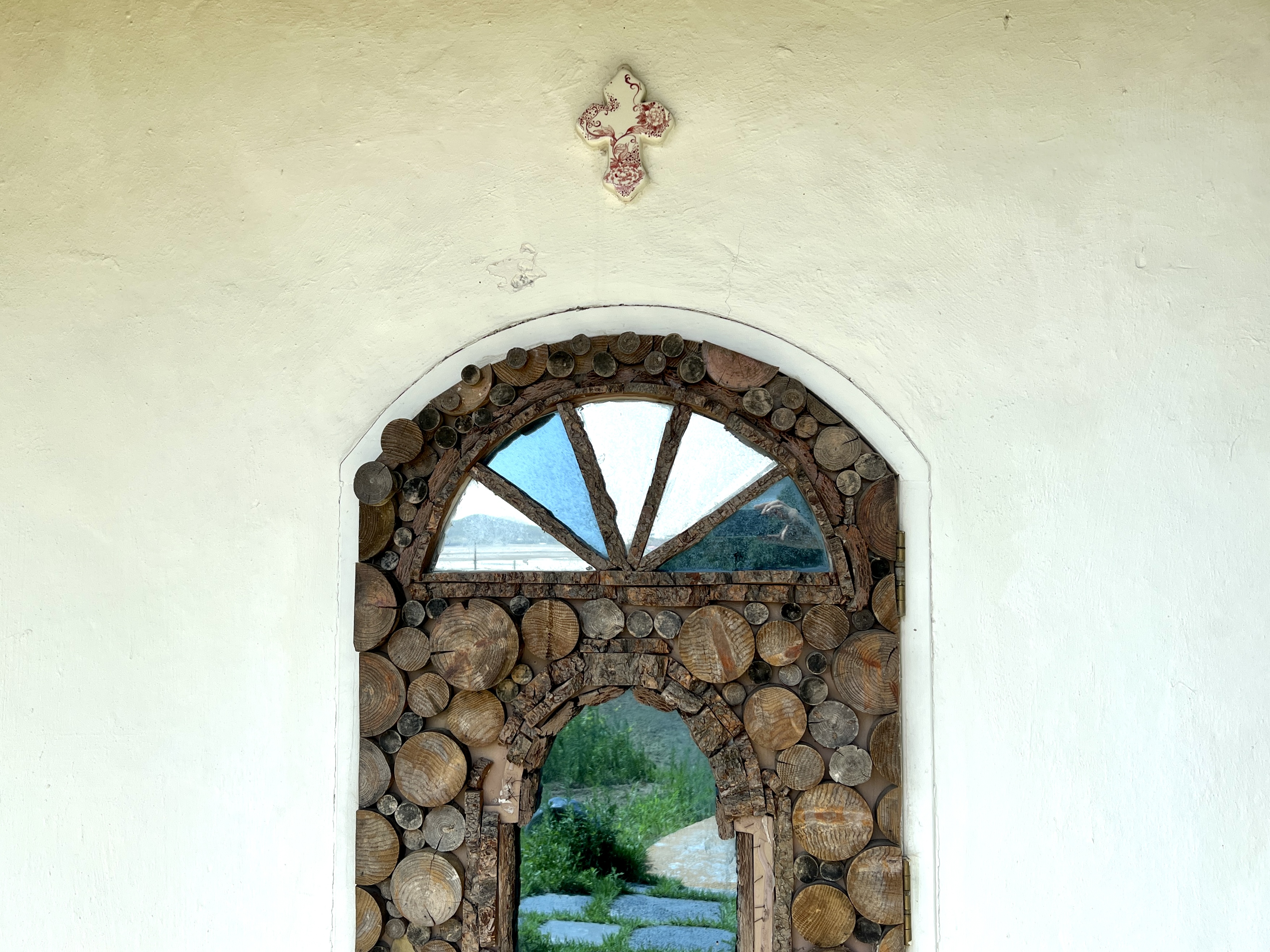 예배당 앞 꽃을 심은 작은 화단, 입구의 도리아식 하얀 기둥, 나무 조각을 모아 만든 출입문은 주변 자연과 잘 어울려요. 뒷벽에는 분홍색 음각 십자가가 반전 매력입니다