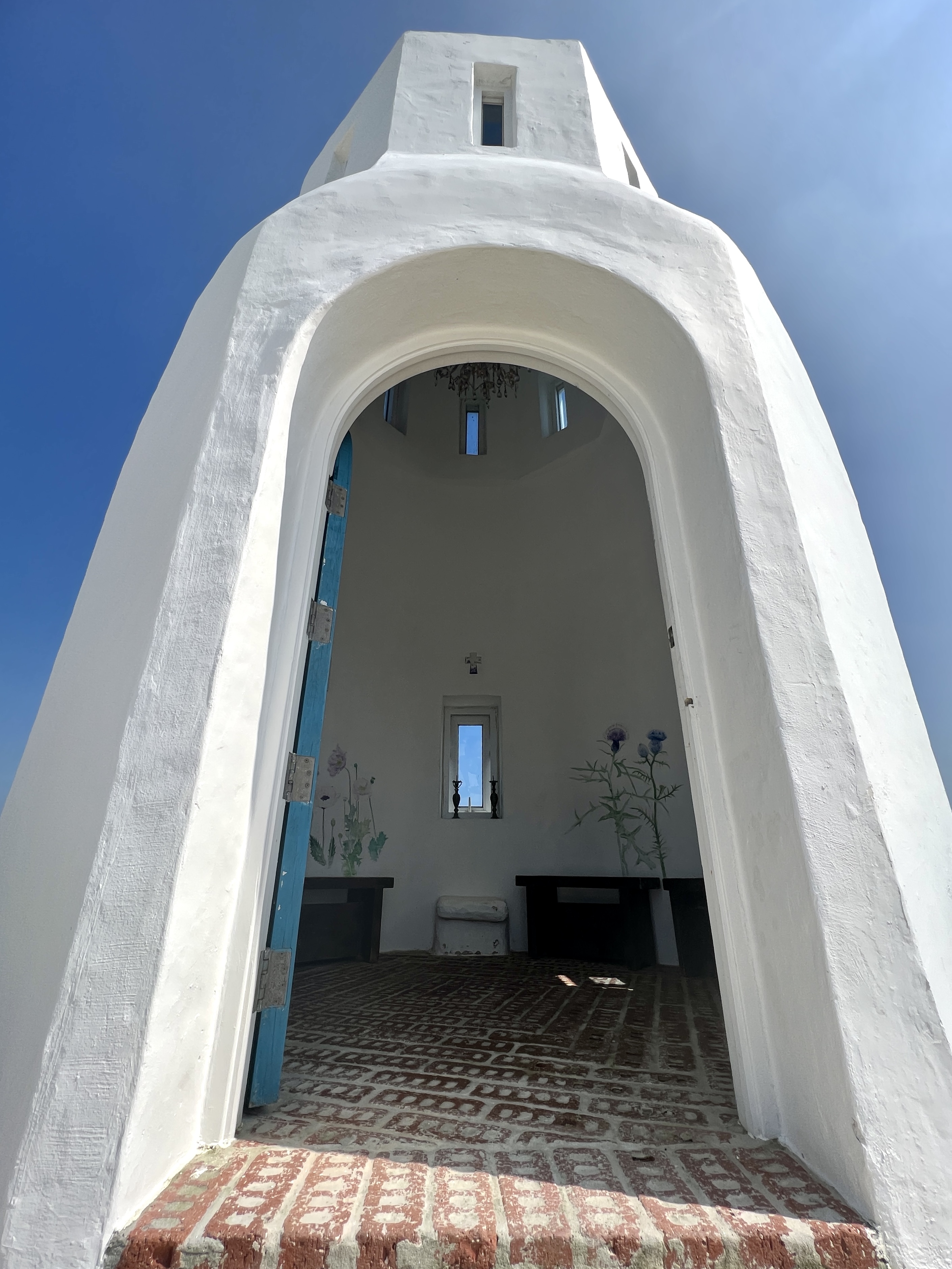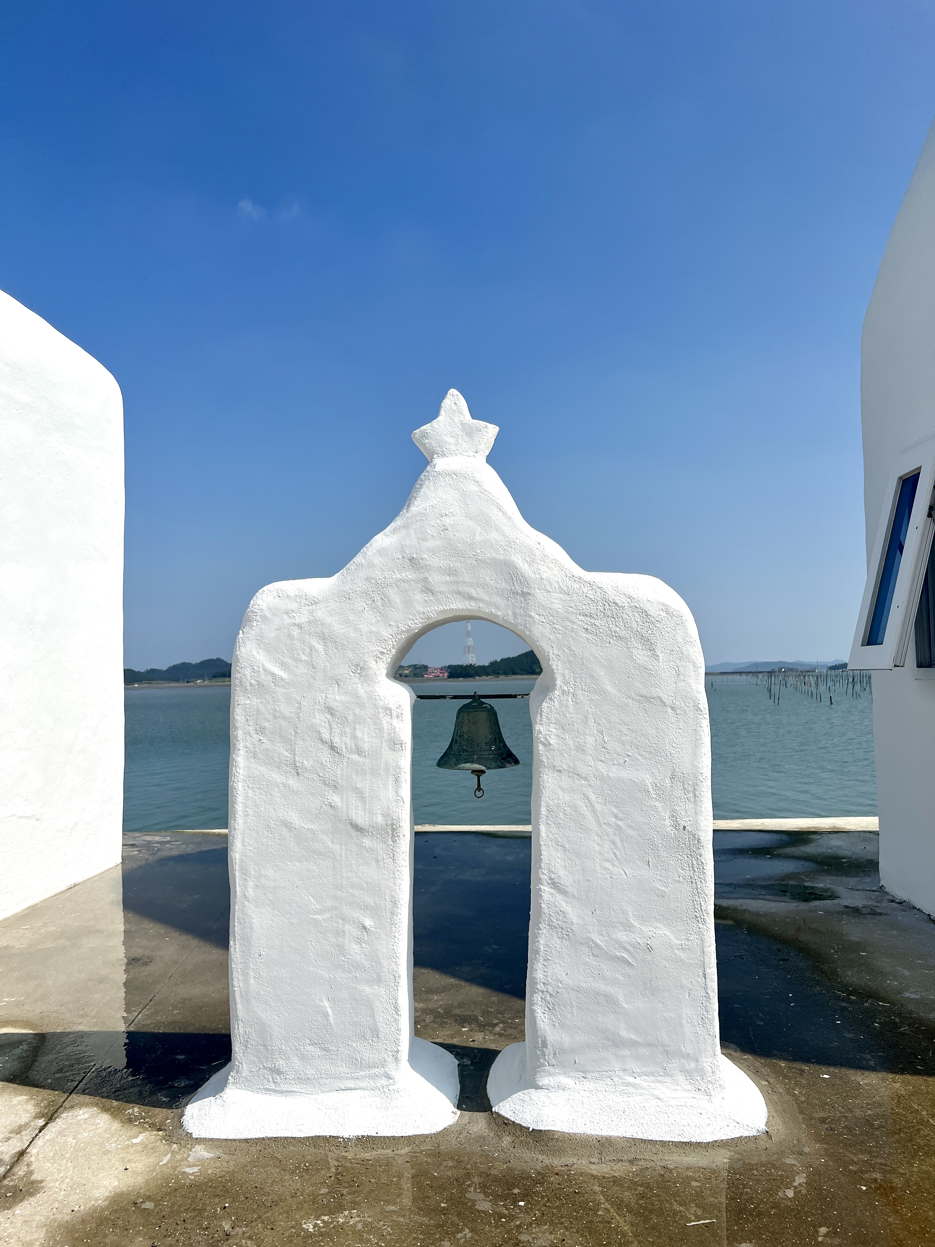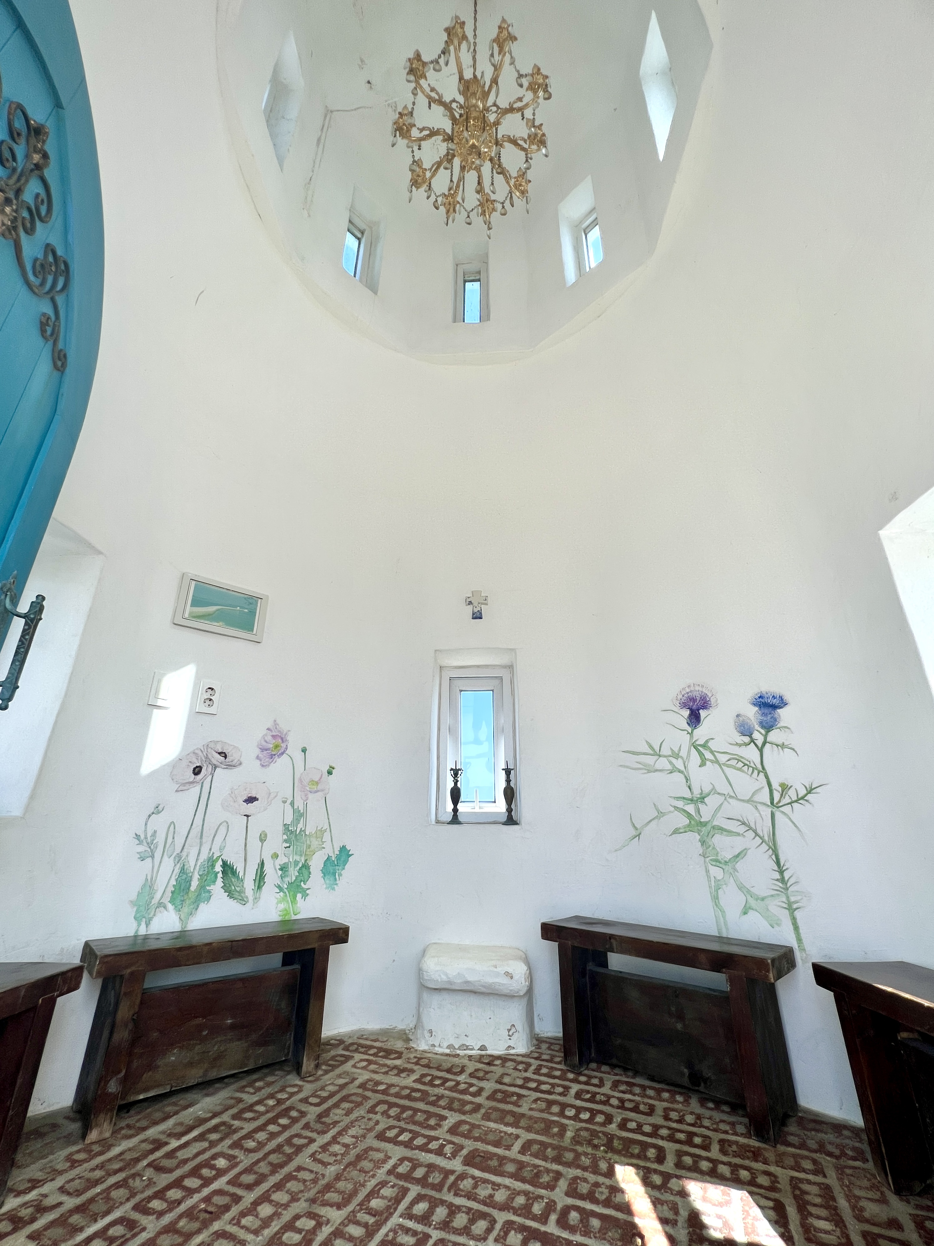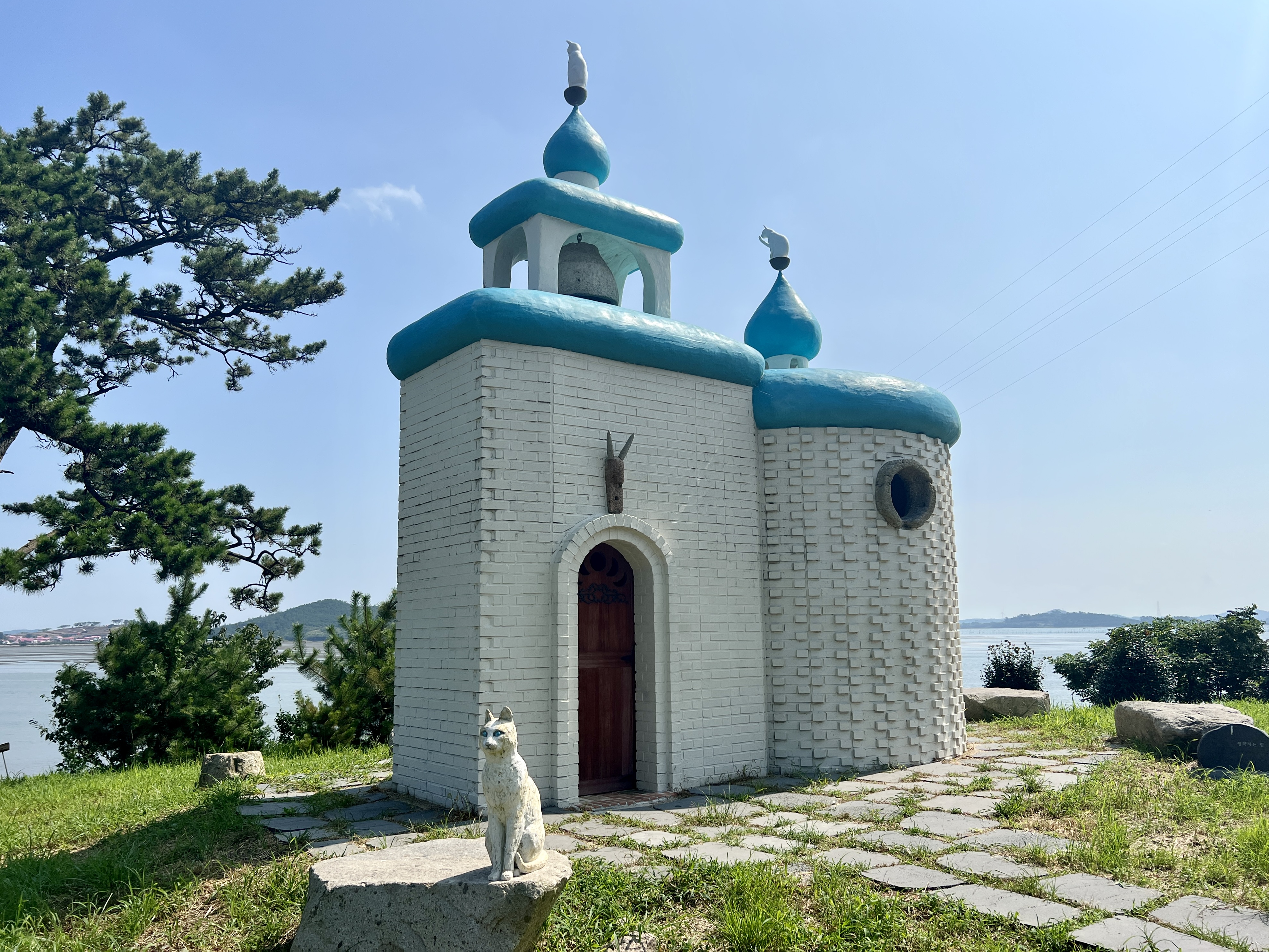 두 개의 돔 모양 지붕 꼭대기에는 십자가 대신 하얀 고양이 두 마리가 바다를 바라보고 있어요. 마을 곳곳에서 만날 수 있는 길고양이를 섬의 수호신으로 상징화 한 거예요. 예배당 곳곳에 섬 이야기가 배어 있는 셈입니다.