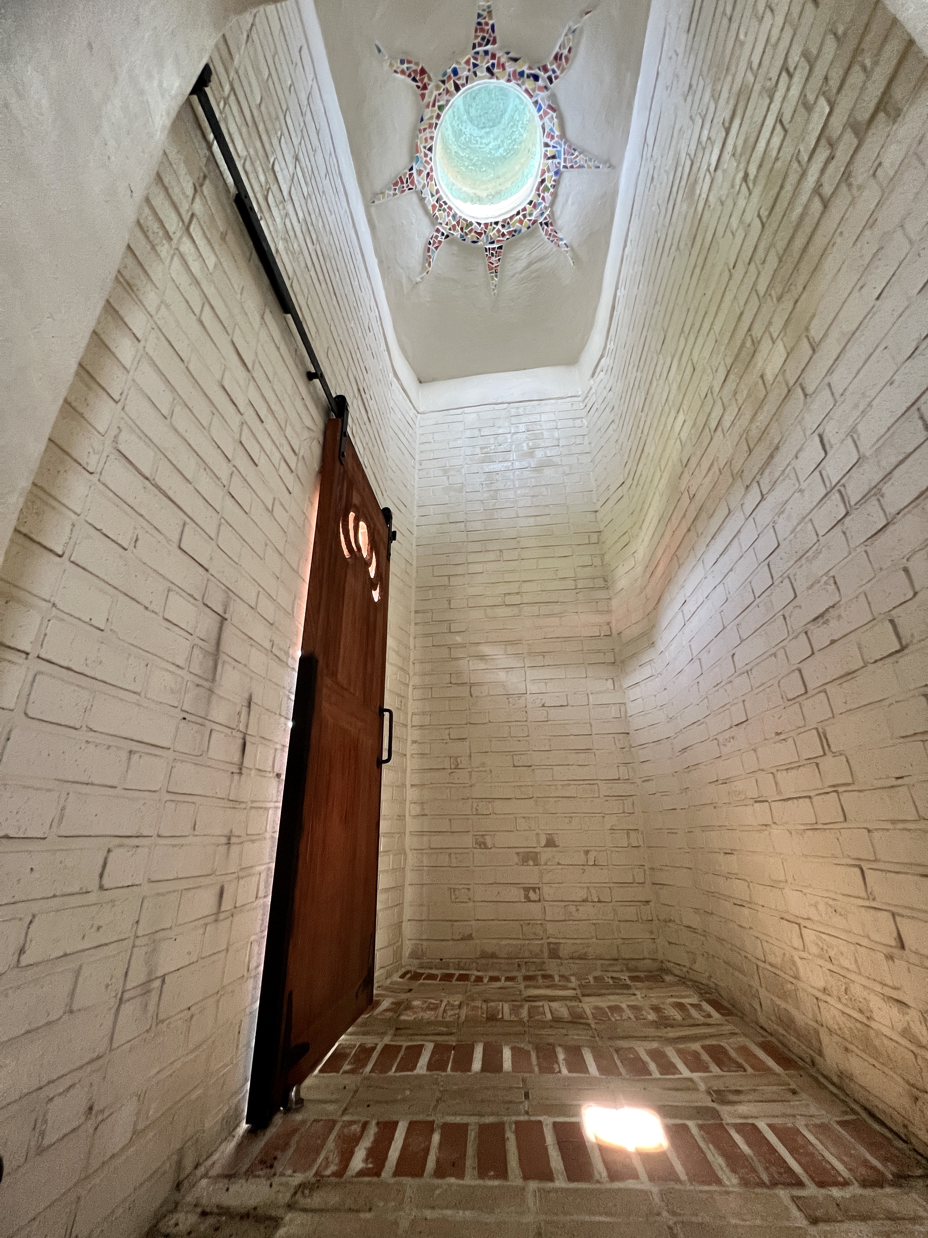 해와 달의 공간이 서로 끌어안고 있는 실내의 독특한 디자인도 아름다워요. 변하는 달 모양 창을 낸 미닫이문을 열고 들어서면 네모진 공간 천정의 해 모양 돔에서 빛이 들어와요.