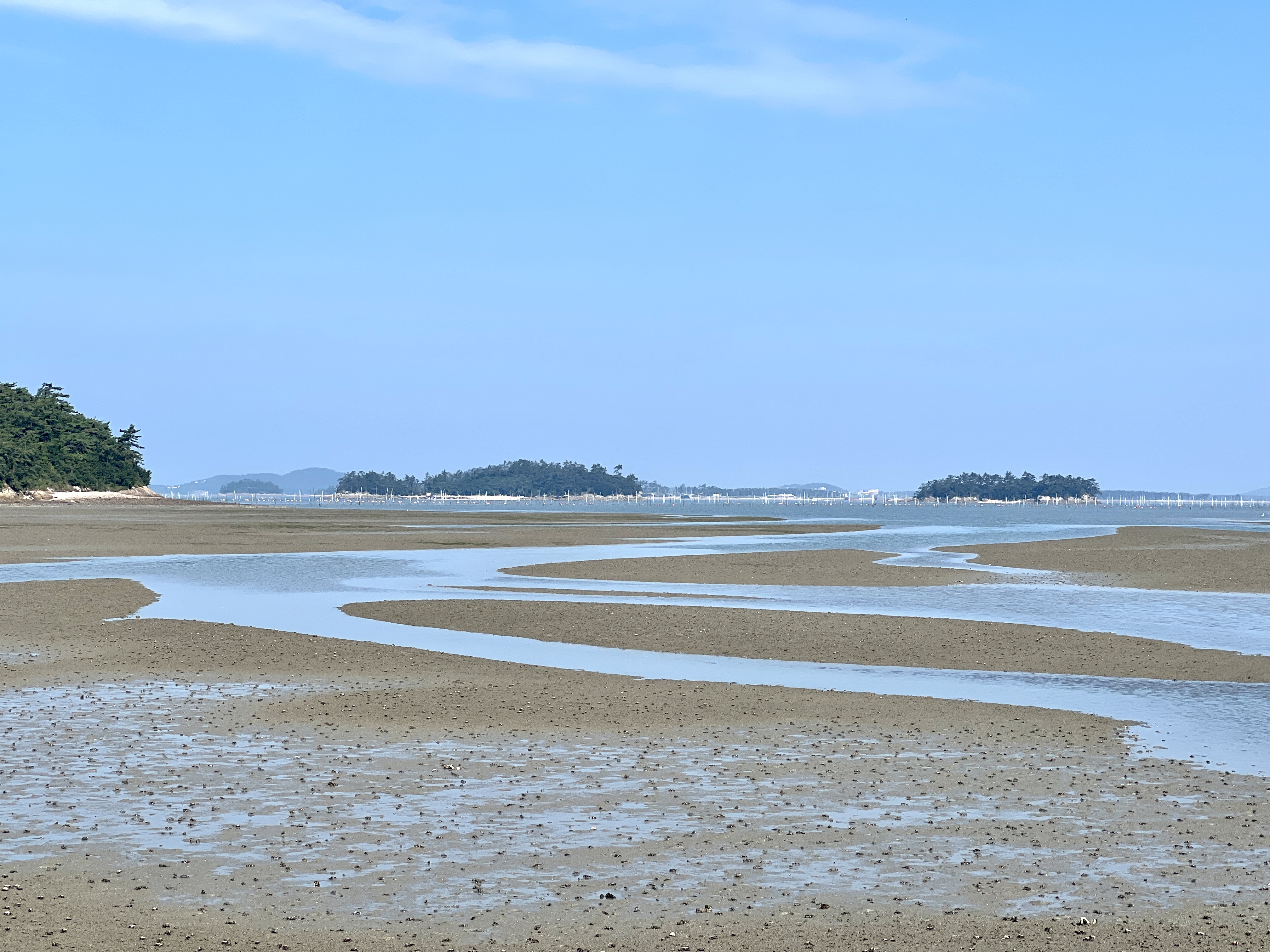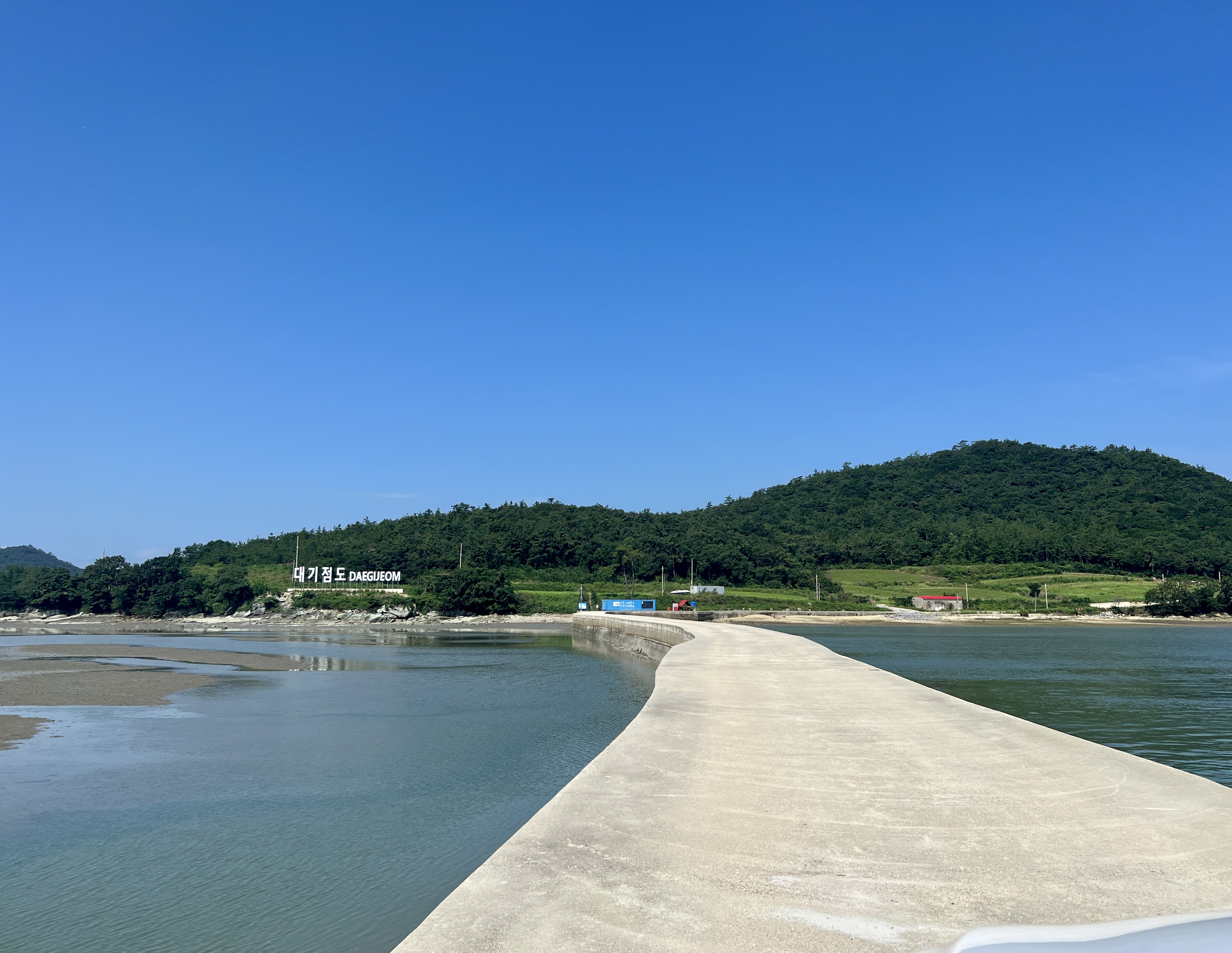 섬과 섬 사이는 애초 징검다리가 있었지만 주민들이 돌로 바다를 메우고 시멘트로 포장해 지금과 같은 노둣길을 만들었어요. 밀물 때는 찰랑거리는 수평선이 되고 썰물 때는 노둣길이 드러나요.