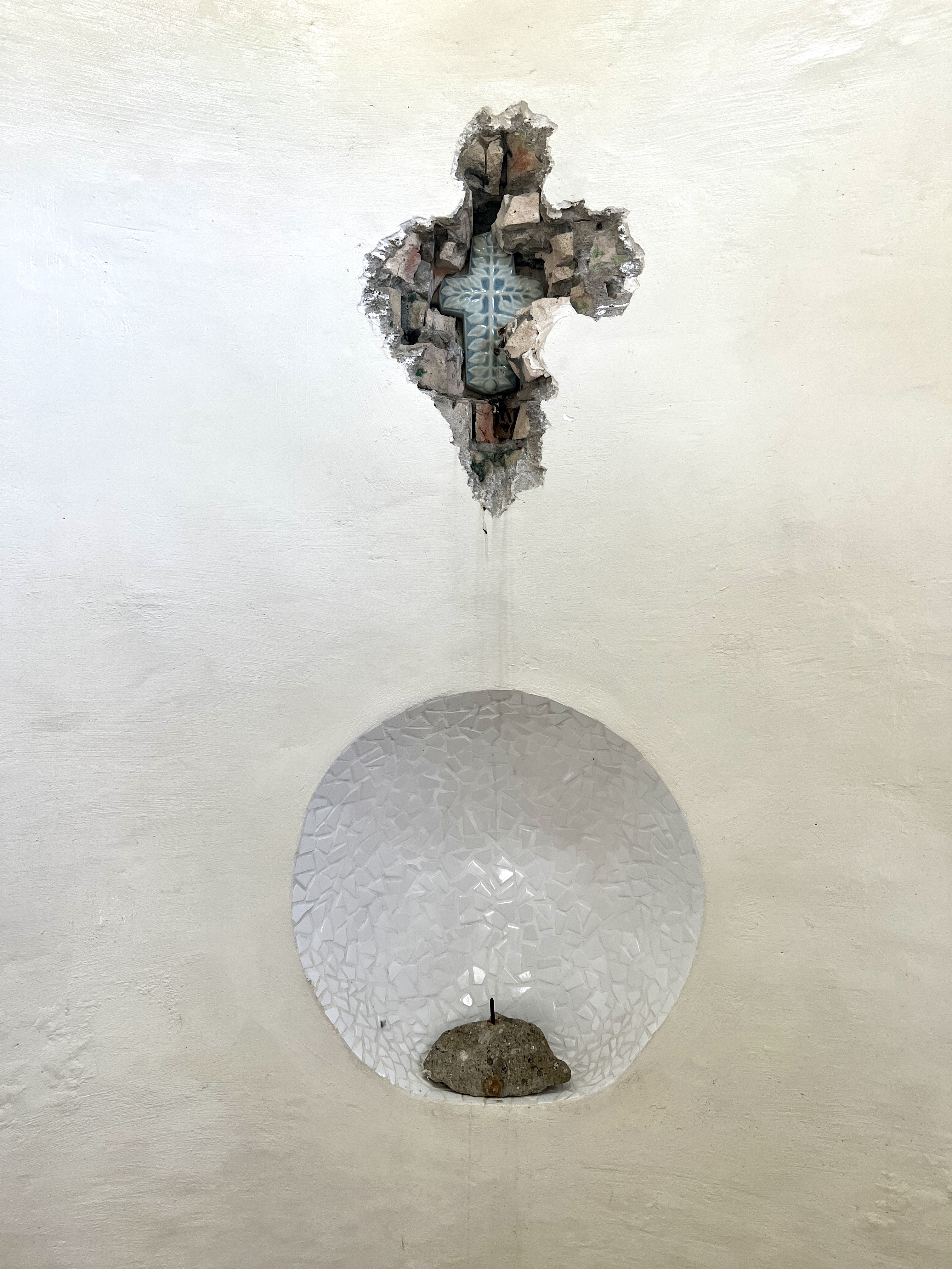 초를 올리는 붙박이 선반을 만든 벽면 위에 발굴한 유물처럼 박힌 십자가가 있어요. 순례길을 걸으며 생각을 그치지 말고 사유 속에서 삶의 실마리를 찾아보라는 말씀 같아요. 작은 사유의 공간에서 평안을 얻고 내 마음에 집중합니다.