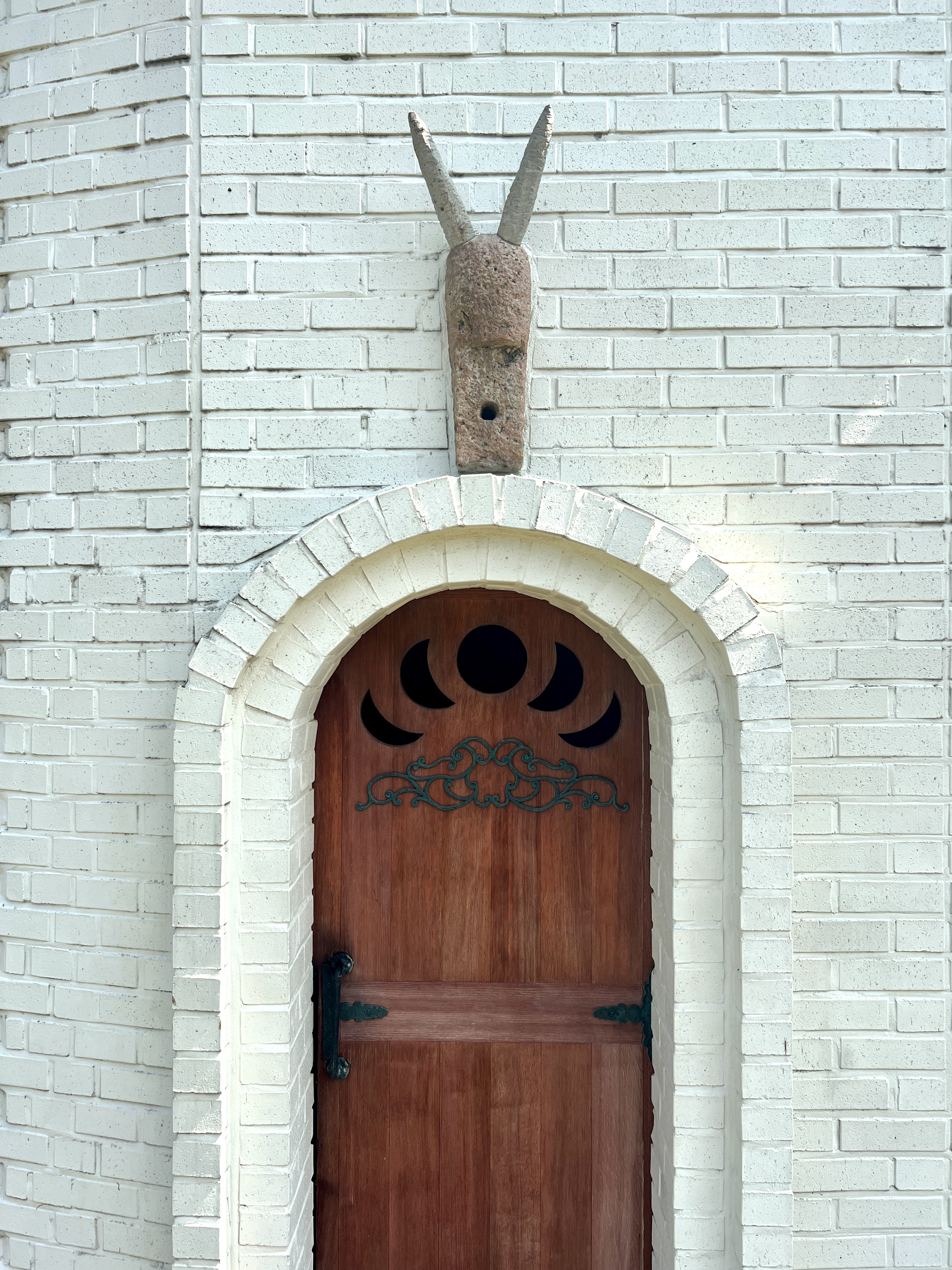 박영균 작가는 차곡차곡 둥글게 벽돌을 쌓아 올리고 그 위를 석회로 마감했어요. 생명을 나타내듯 단정하고 하얀 예배당의 전체 모양은 남성성을, 출입문은 여성성을 상징해요. 외뿔을 단 유니콘이 문지기처럼 한쪽에 서 있답니다.