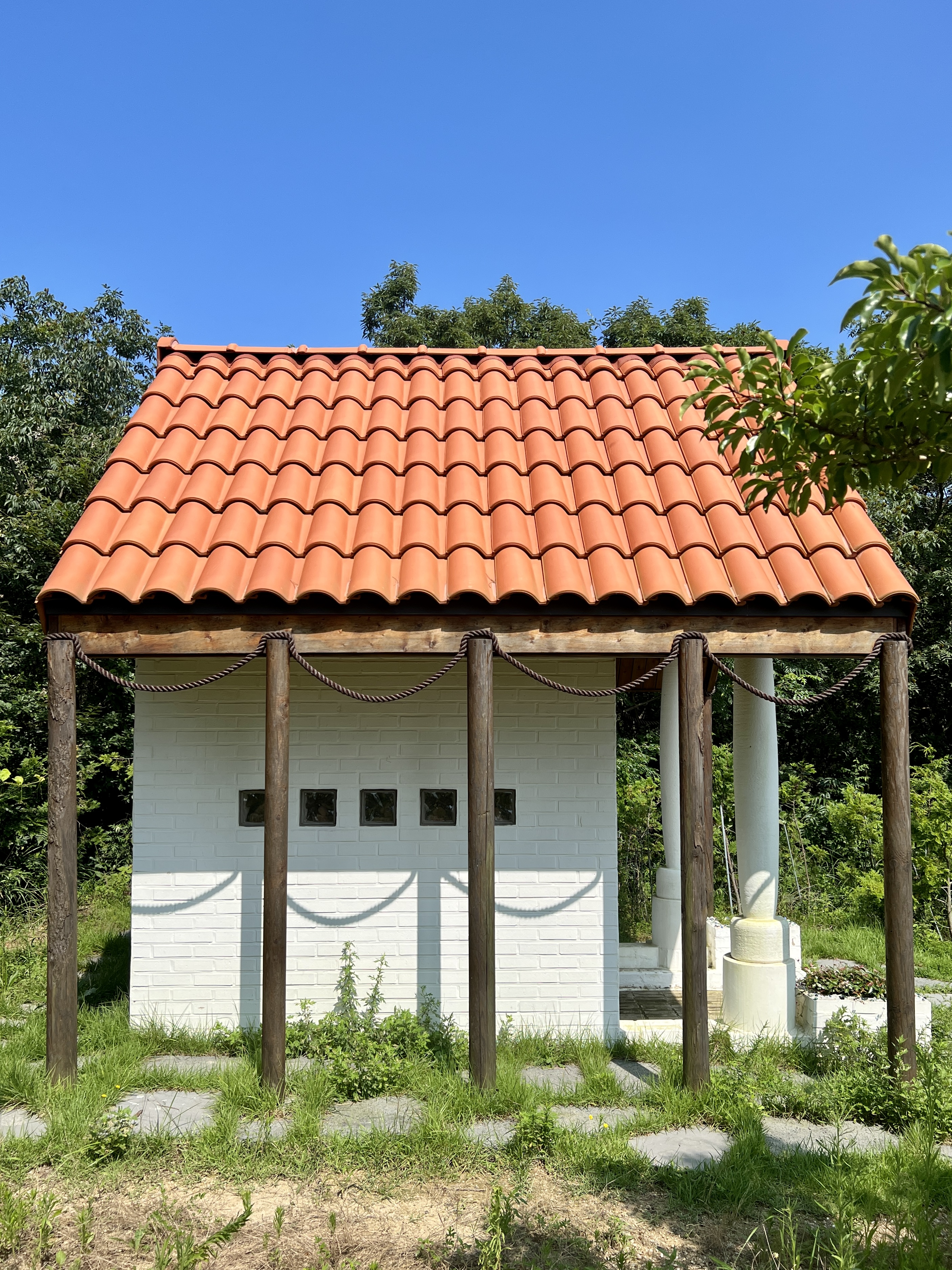 야고보의 예배당은 벽돌를 쌓고 하얀 석회로 마감한 몸체 양옆으로 열 개의 나무 기둥을 세워 처마를 만들고 그 위에 붉은 기와를 얹었어요.