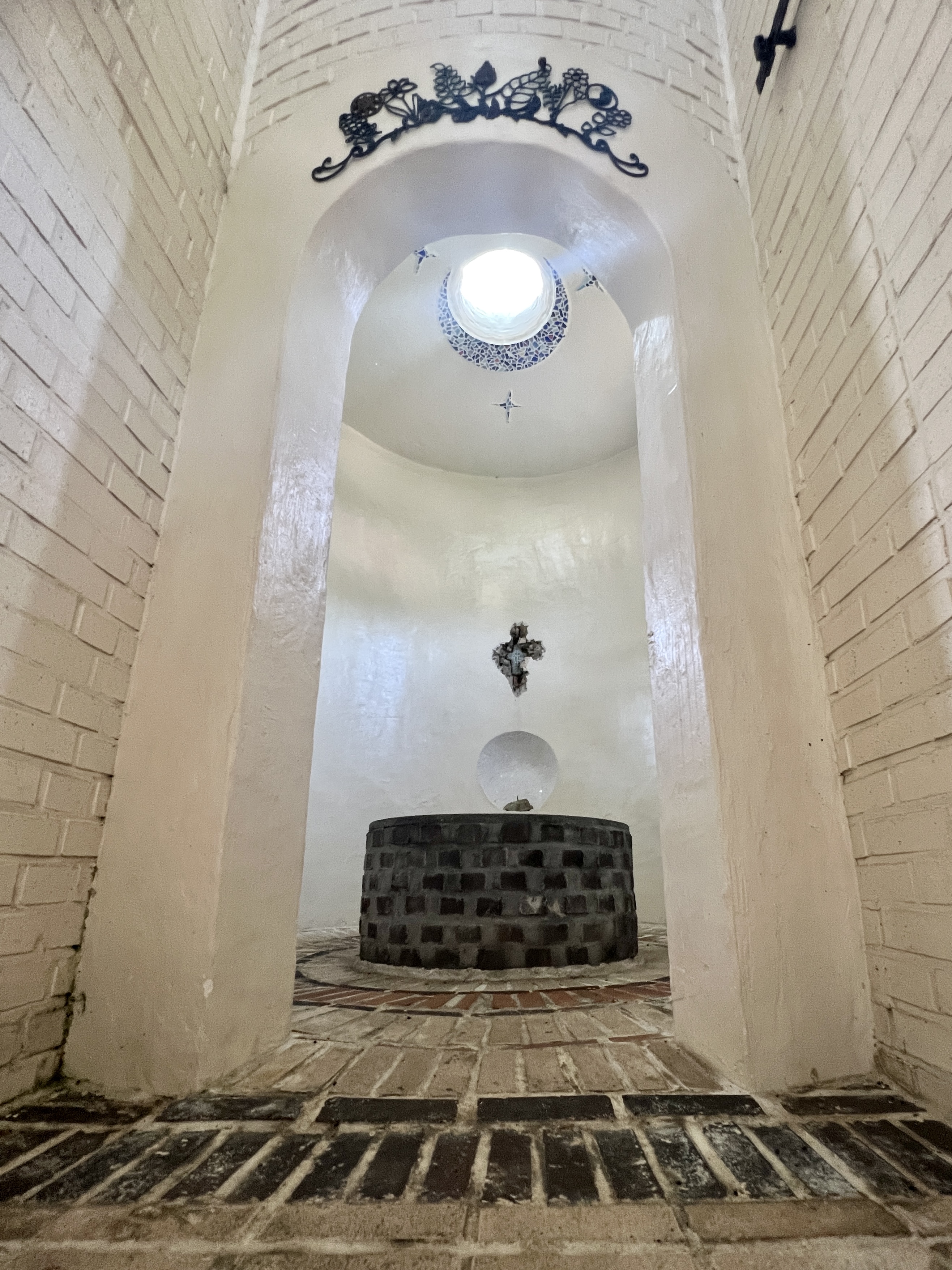 둥근 공간 천정의 달 모양 돔에서도 빛이 들어와 둥근 돌 평상 위에 떨어져요. 예배당 안에는 산란한 빛이 가득하답니다.