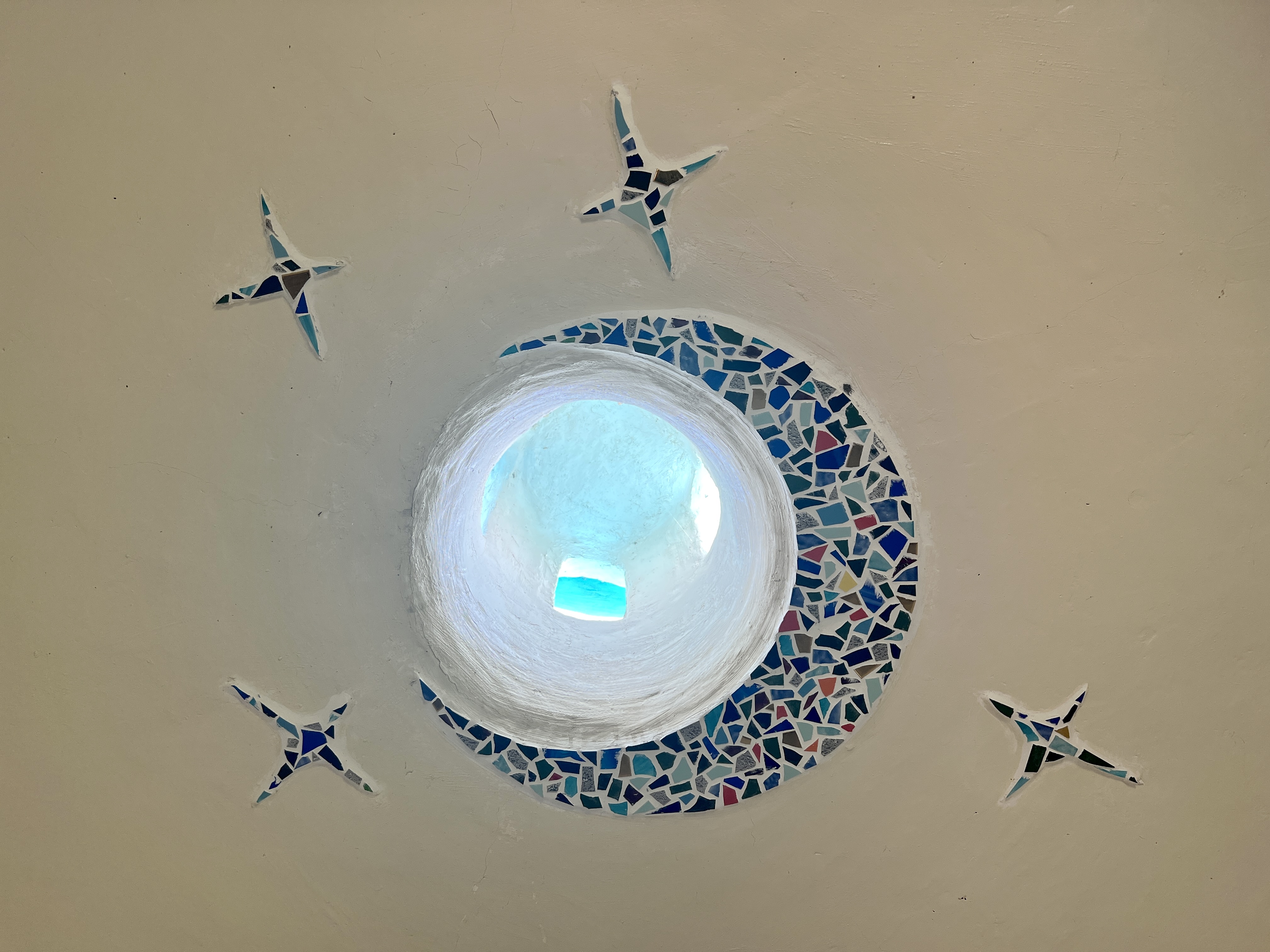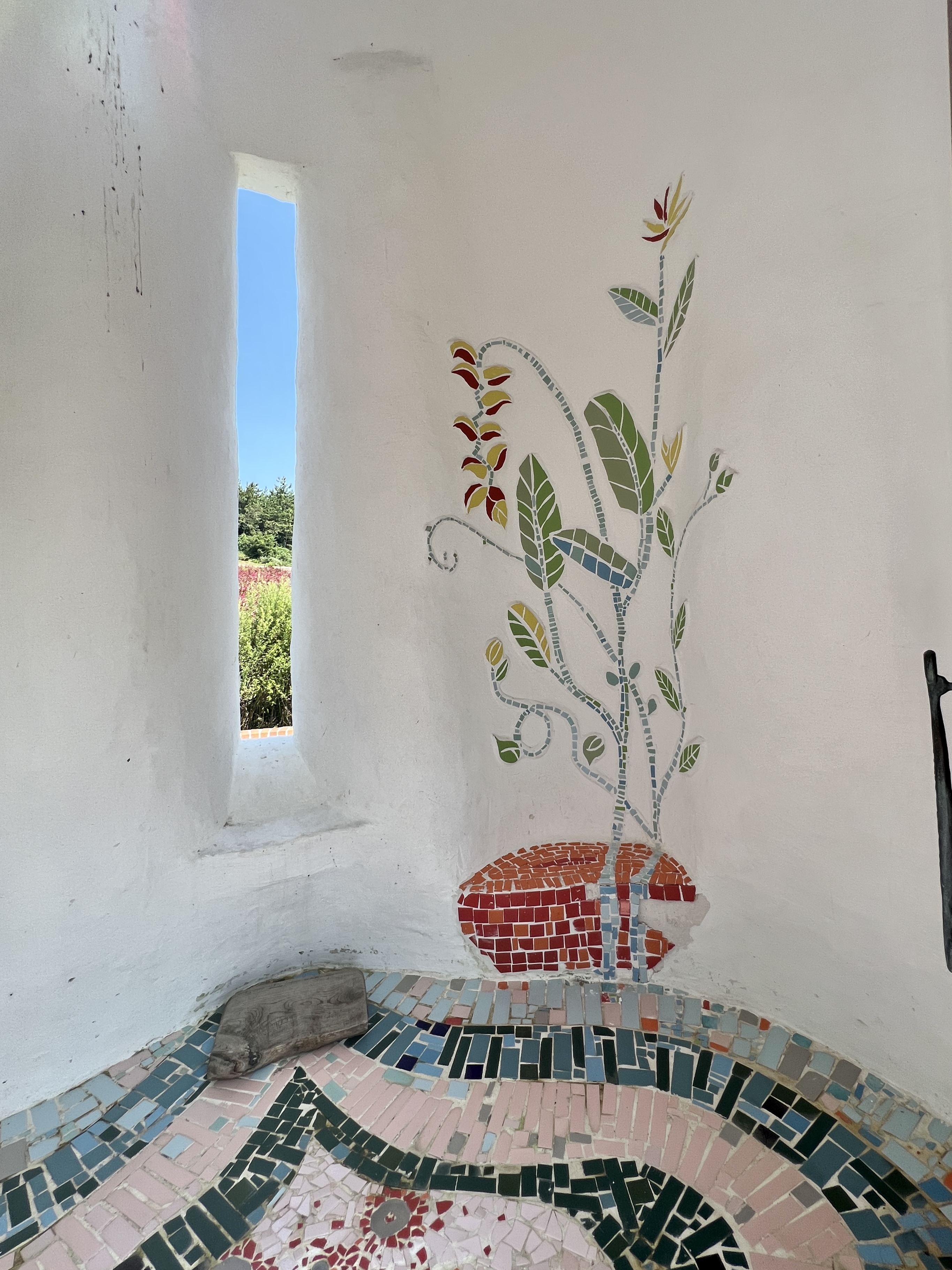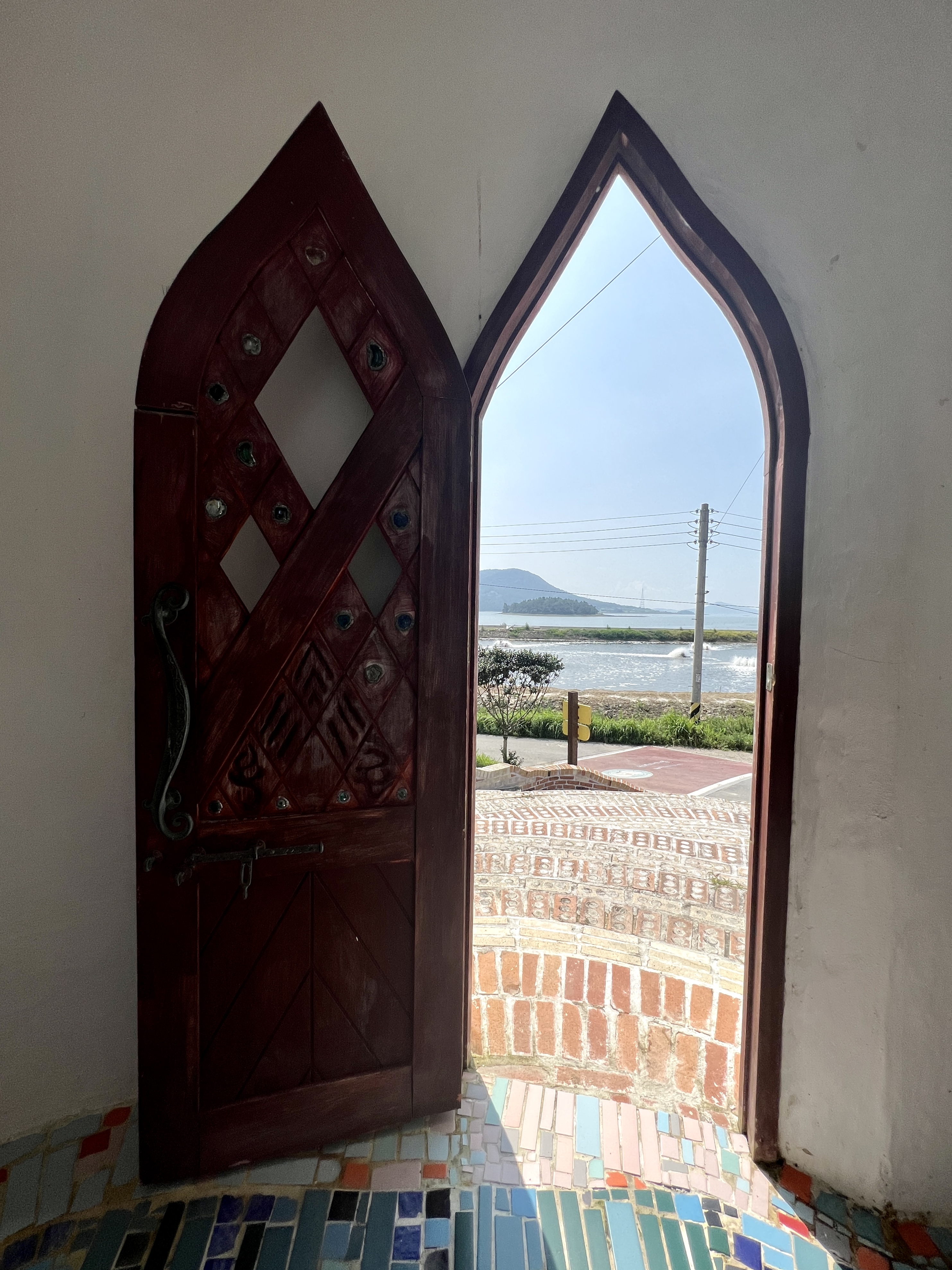 섬사람의 삶과 시간이 담긴 절구통은 입구 벽의 열린 둥근 창문이 되었고, 이 창을 통해 맞은편 벽의 짙푸른 유리블록 십자가를 볼 수 있어요.