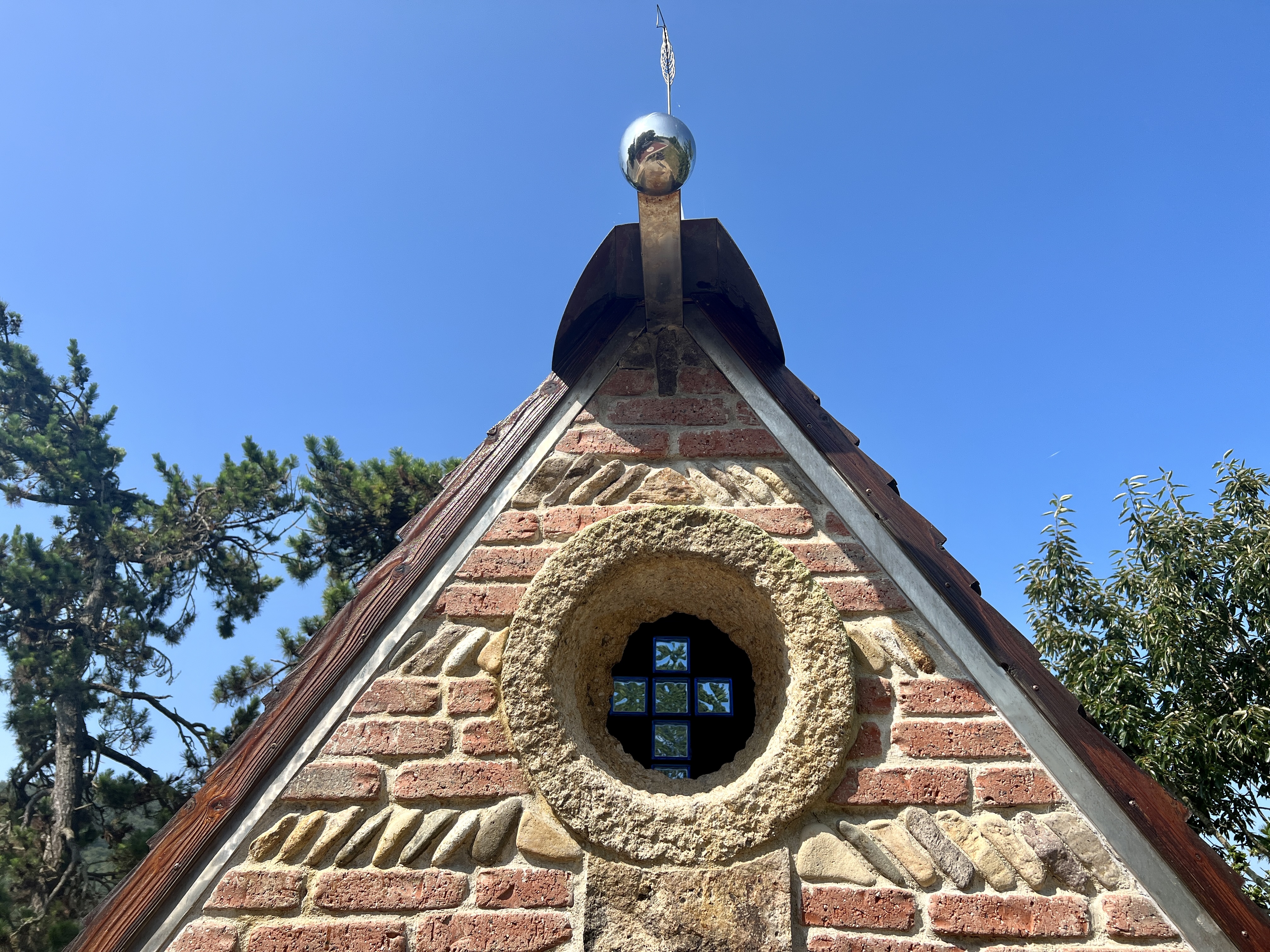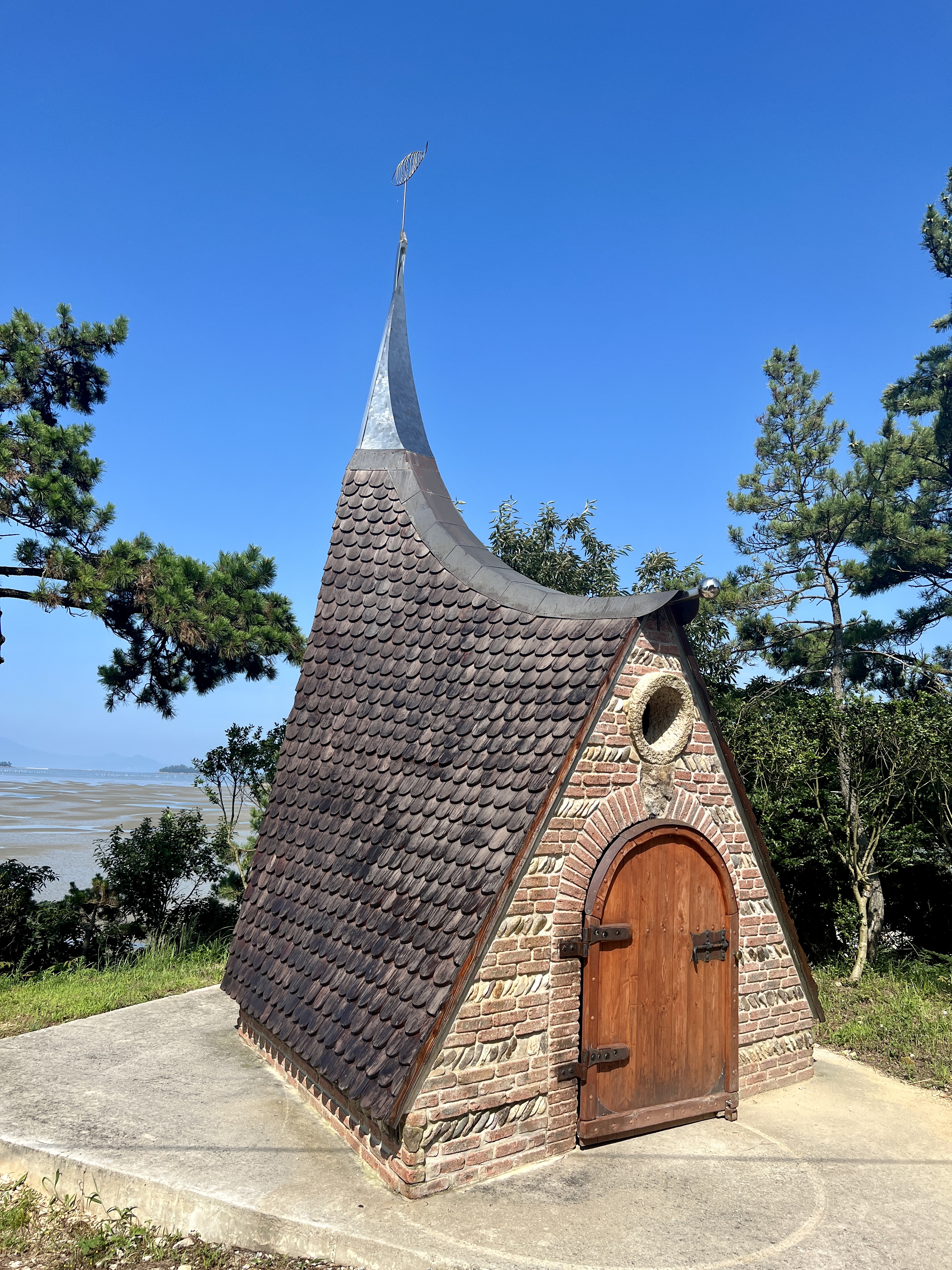 대기점도의 남쪽 끝, 소기점도로 노둣길을 건너기 전 다섯 번째 '행복의 집'이 순례자를 맞이해요. 필립의 예배당입니다. 장미셀, 파코, 브루노 세 명의 프랑스 남부 툴루즈 지방 출신의 예술가들은 고향의 붉은 벽돌과 섬에서 채취한 갯돌을 사용해 섬 언덕 위에 아름다운 예배당을 세웠어요.