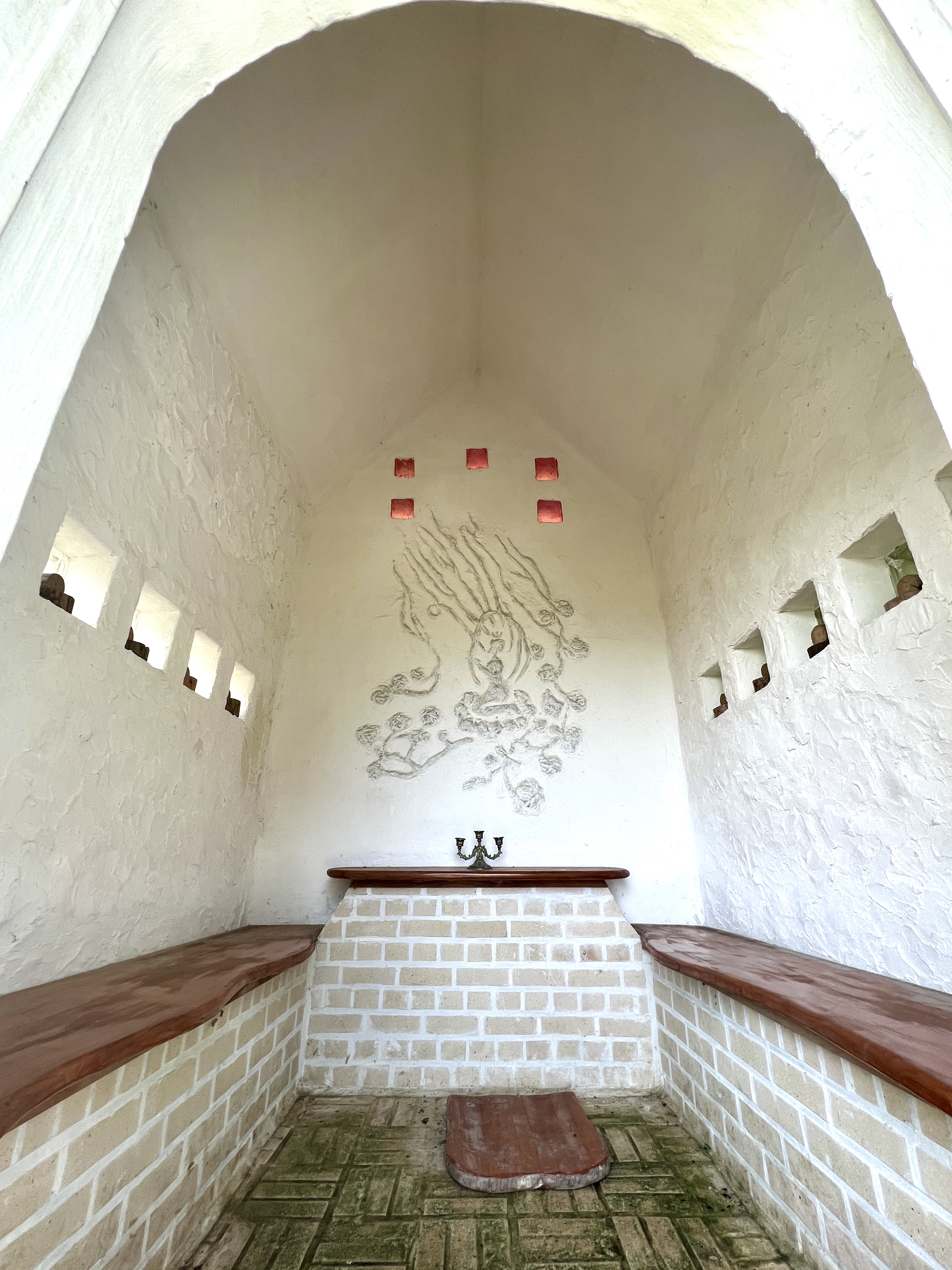예배당 안은 파스텔톤 타일이 깔려 있어 화사하고 따듯해요. 하얀 벽을 따라 생명의 나무가 자라고 있습니다. 성모를 상징하는 스테인드글라스 장미창으로 들어온 빛이 이 생명의 나무를 키우고 있어요. 예배당 전체가 생명을 잉태하고 있는 성스럽고 평화로운 어머니의 마음입니다.