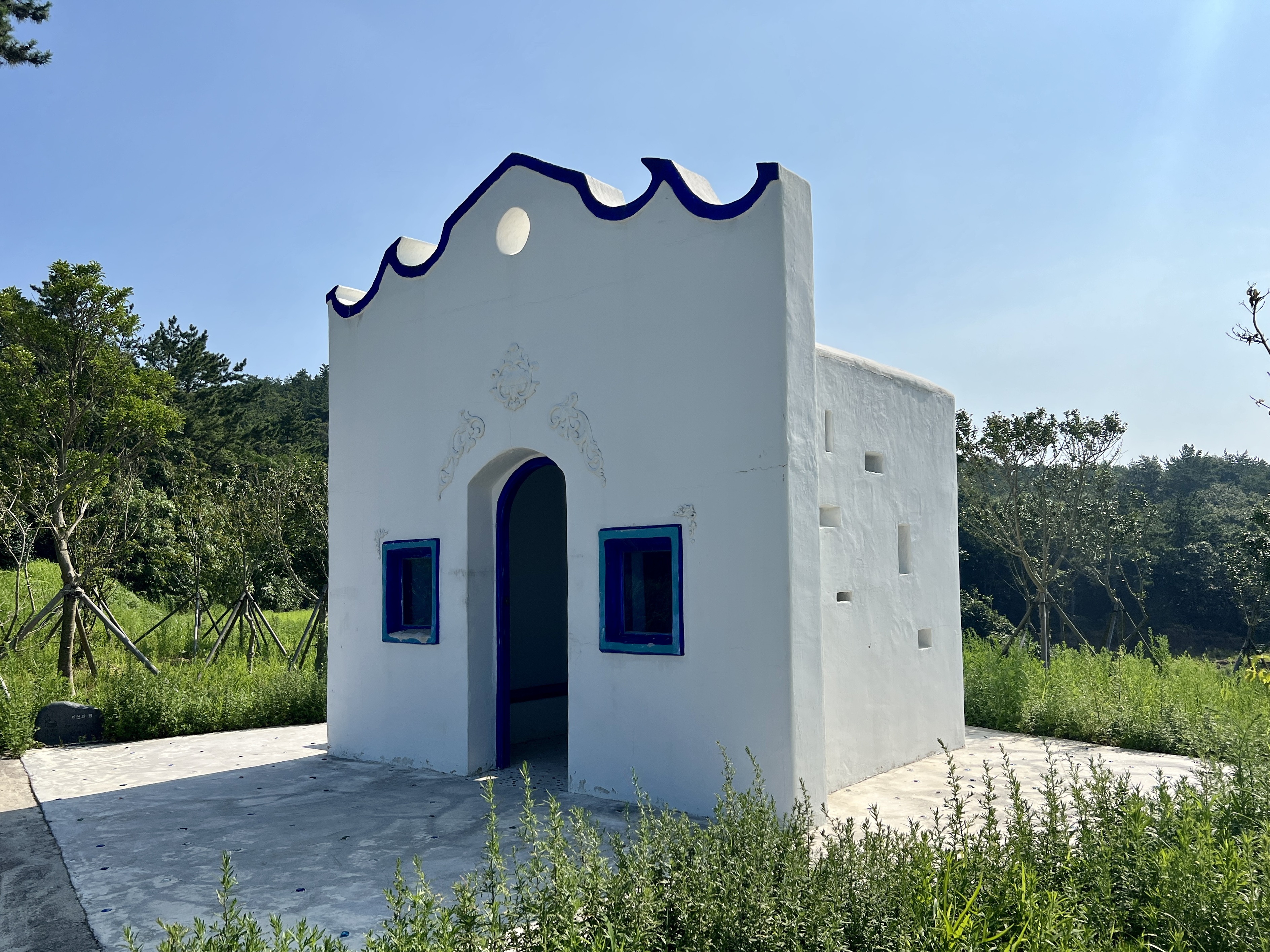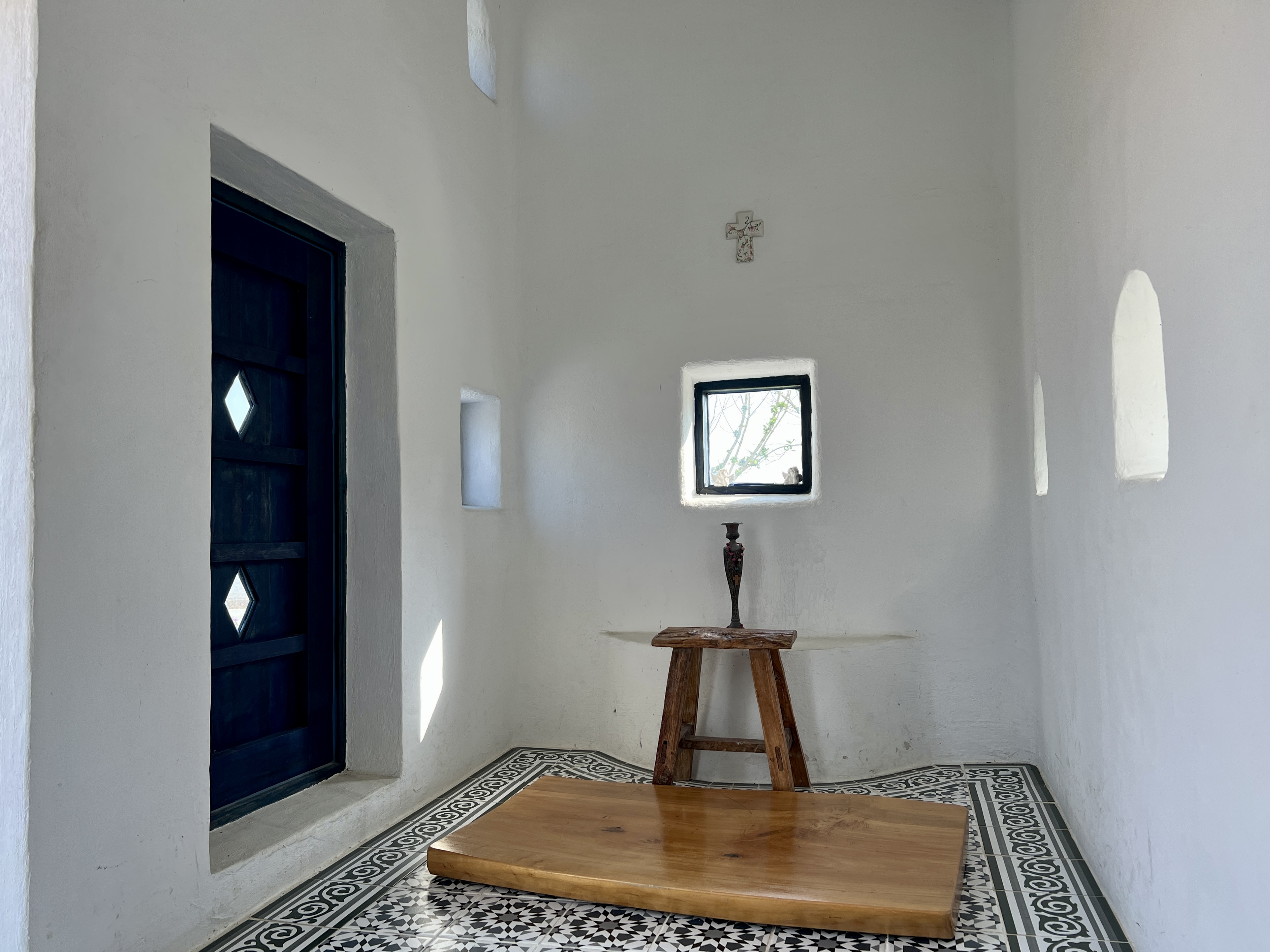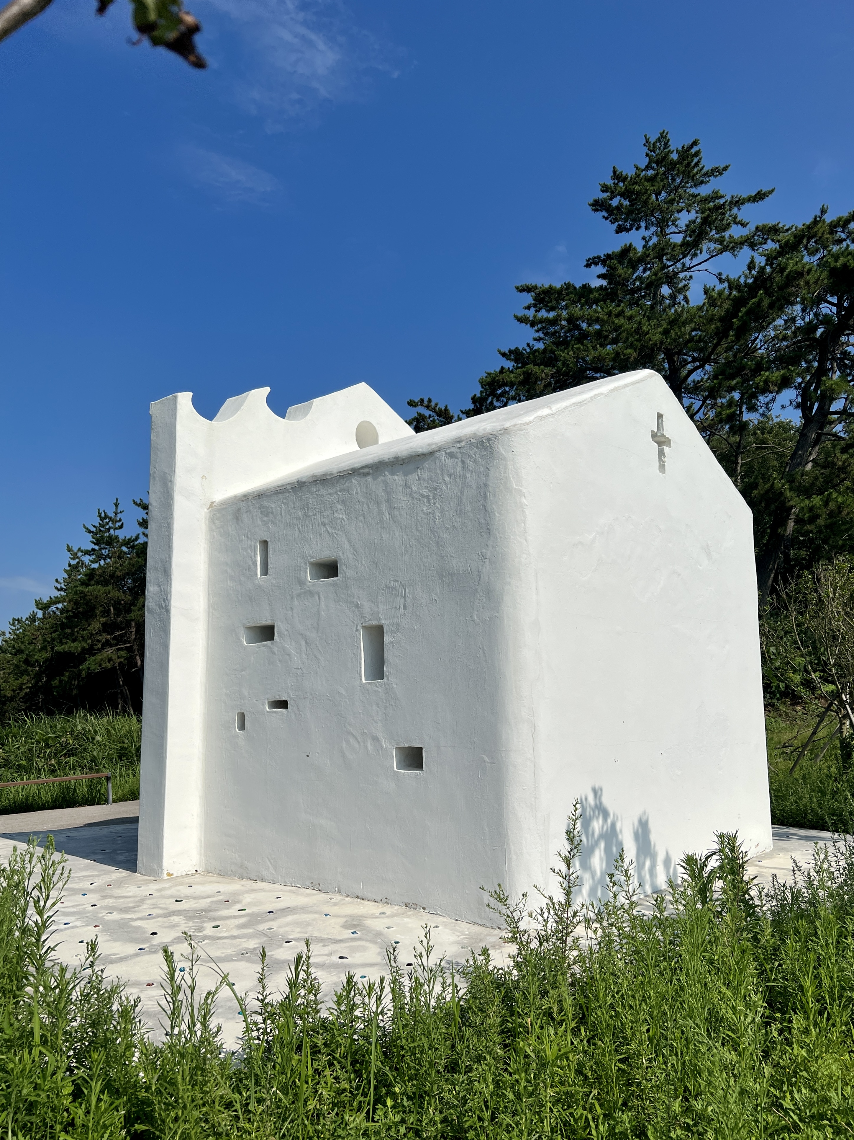 하얀 예배당을 둘러싼 마당은 파란 오리엔탈 타일 카펫이 깔려 있어 기하학적 풍경을 만듭니다. 예배당 안에도 또 다른 문양의 타일 카펫이 깔려 있어요. 작고 푸른 창문이 여러 개 나 있어 앙증맞은 창문으로 요기조기 내다보는 재미가 있습니다.