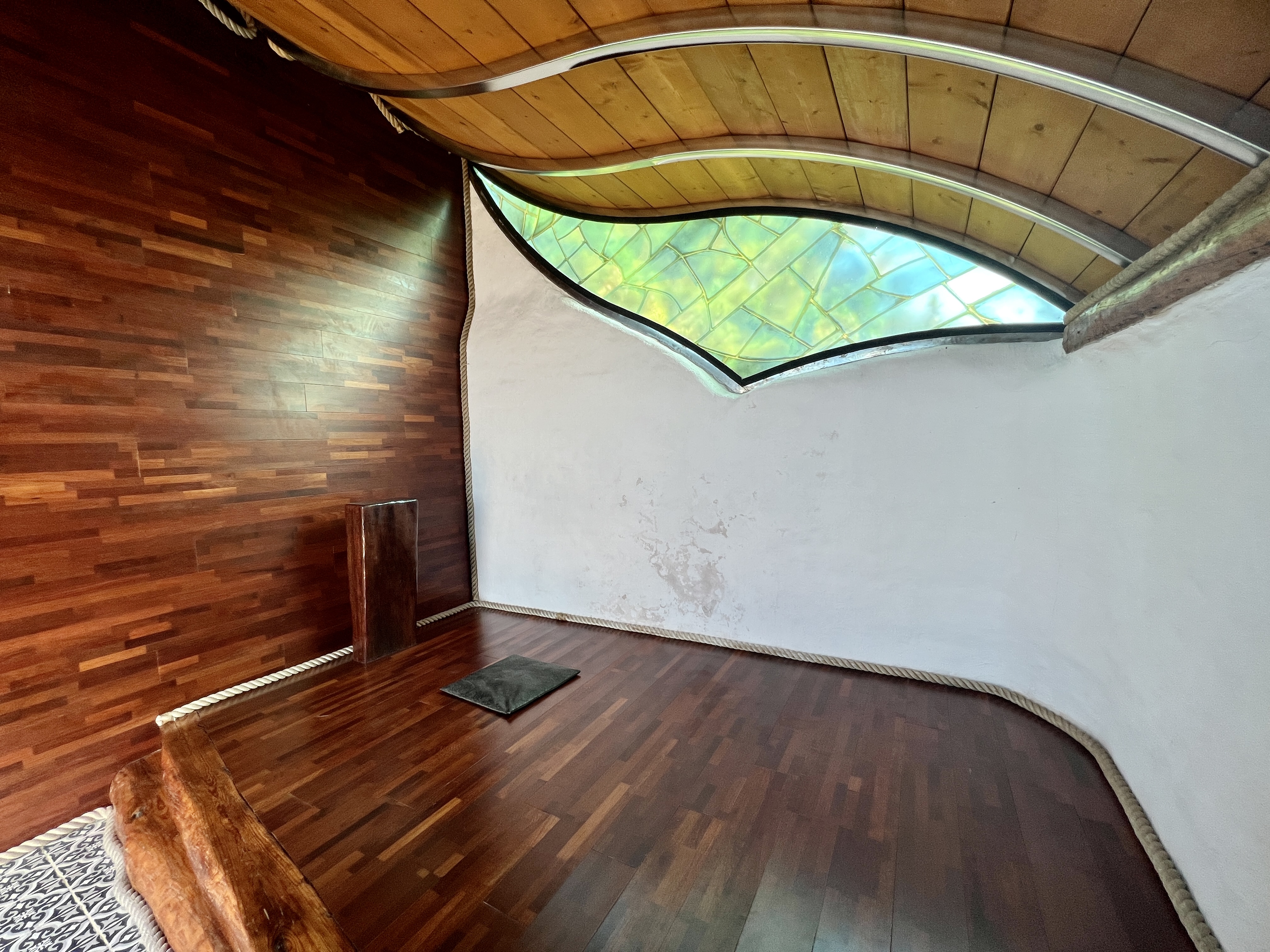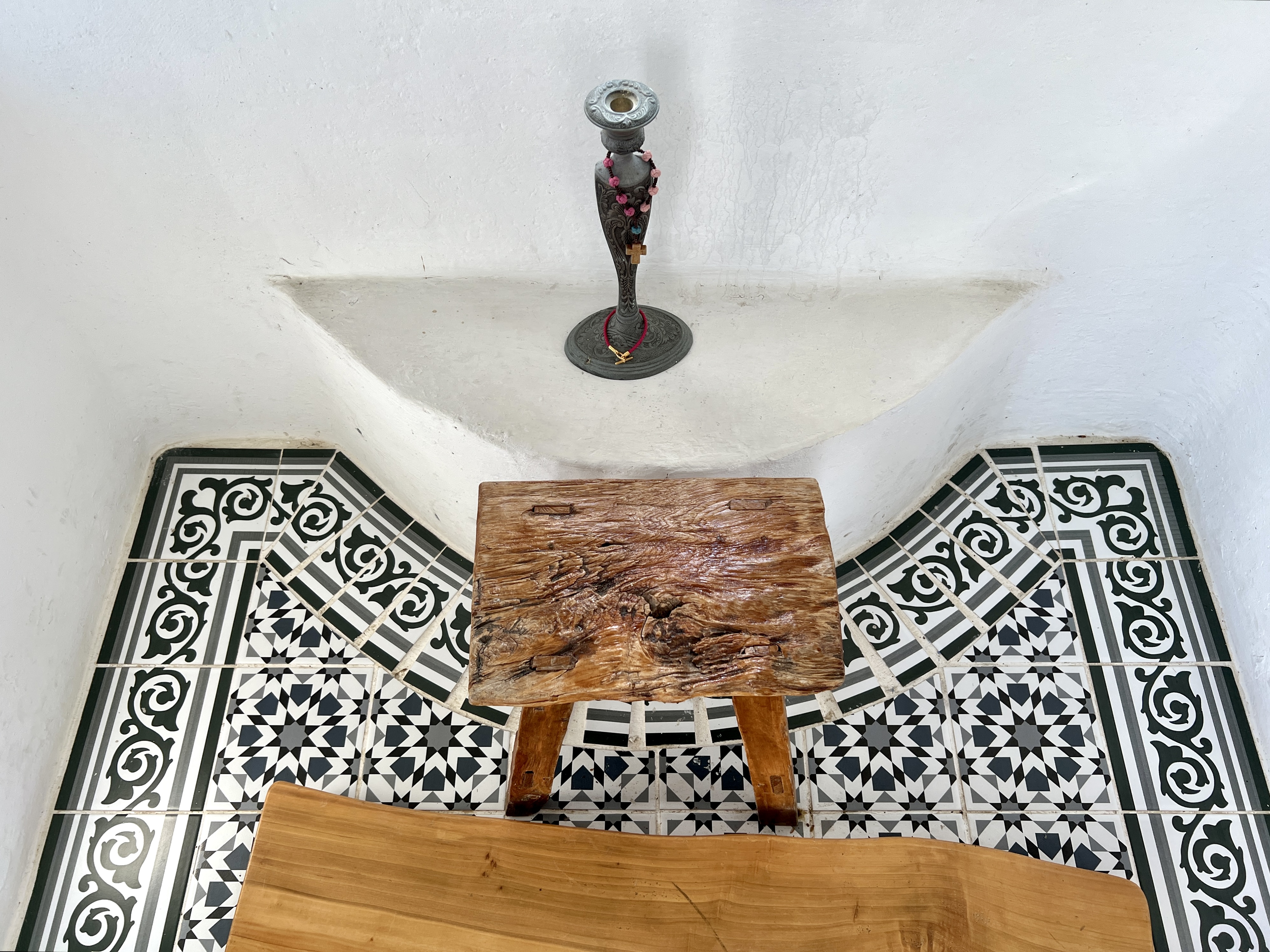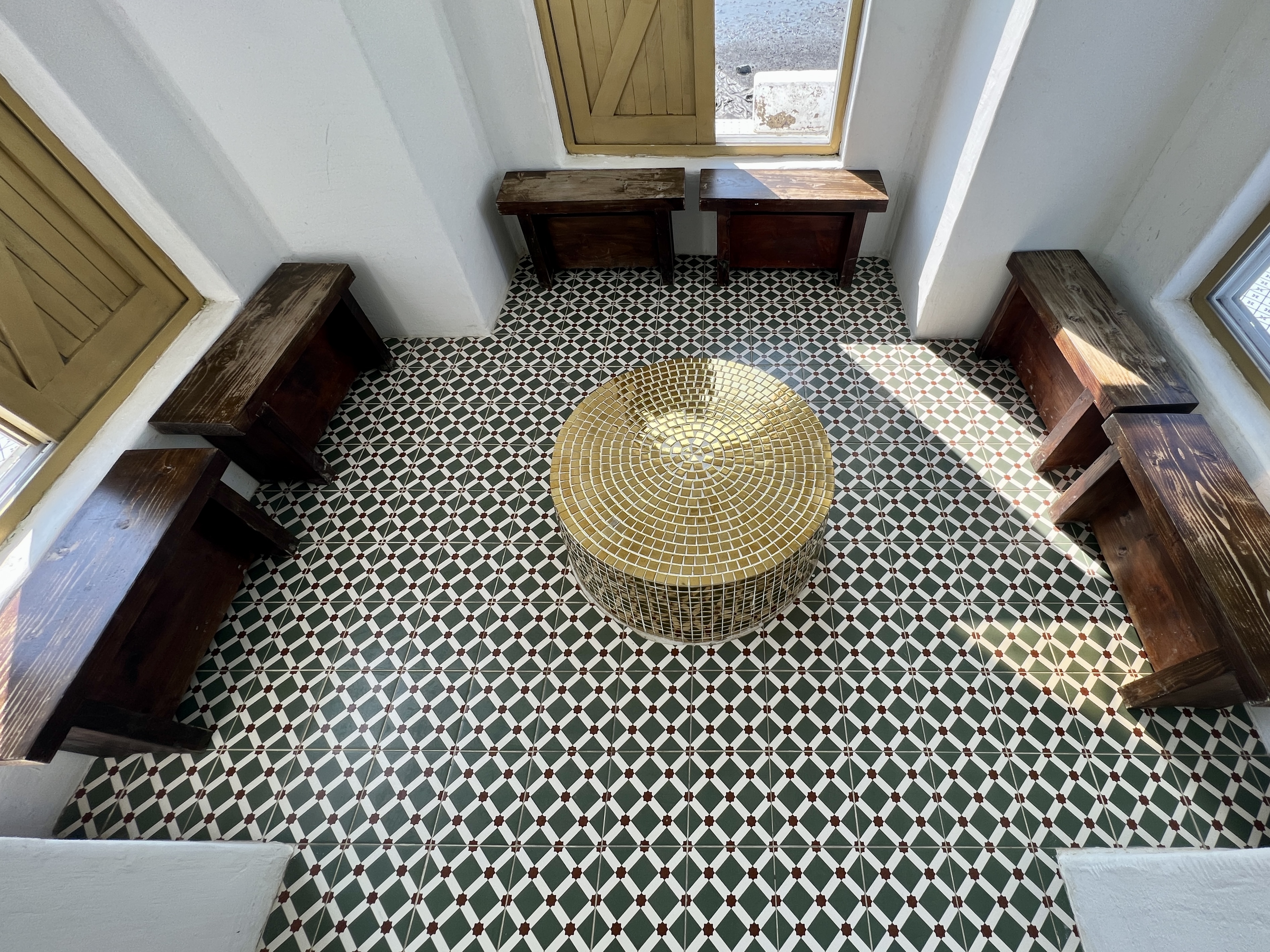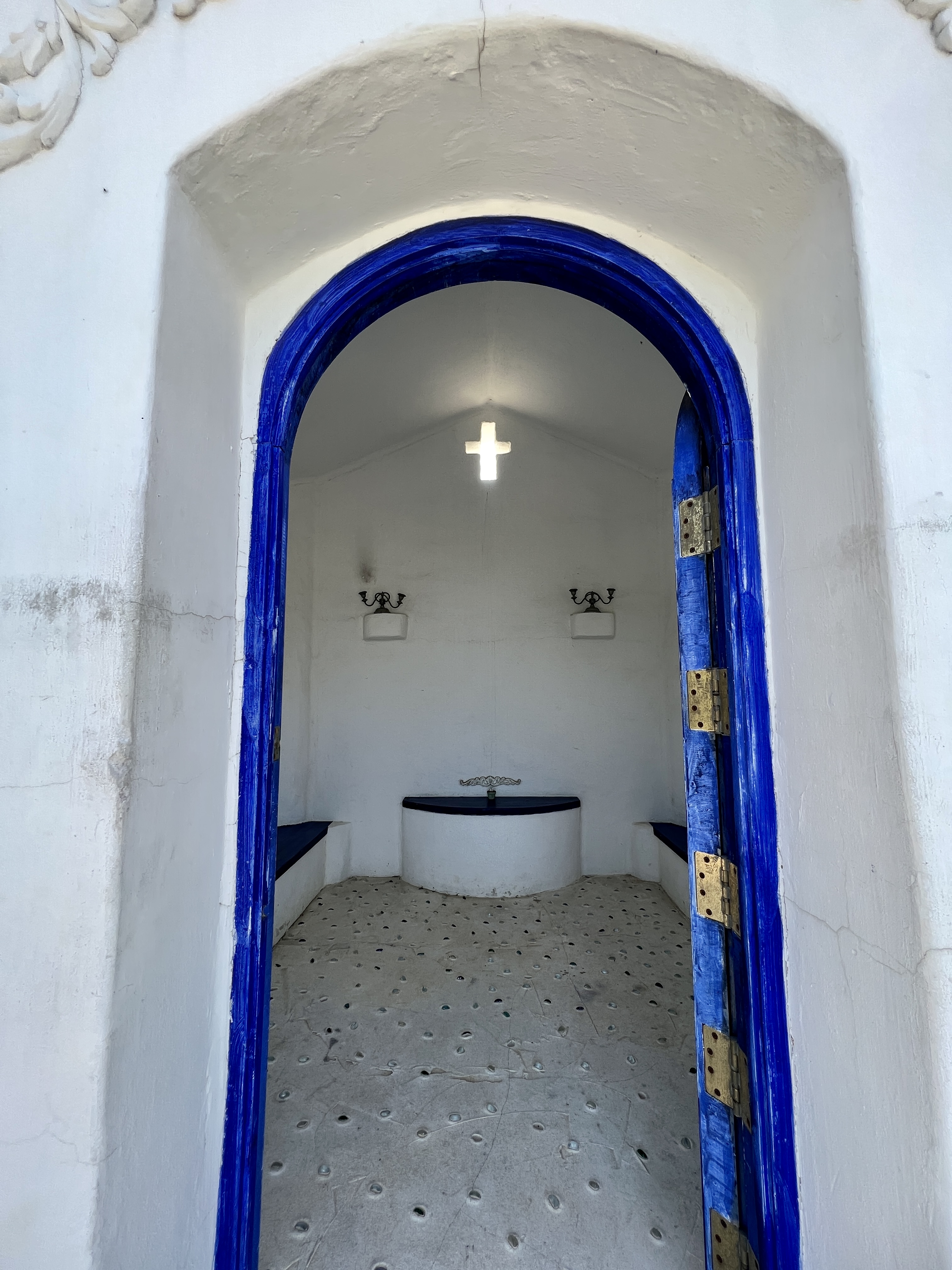 하얀 예배당을 둘러싼 마당은 파란 오리엔탈 타일 카펫이 깔려 있어 기하학적 풍경을 만듭니다. 예배당 안에도 또 다른 문양의 타일 카펫이 깔려 있어요. 작고 푸른 창문이 여러 개 나 있어 앙증맞은 창문으로 요기조기 내다보는 재미가 있습니다.