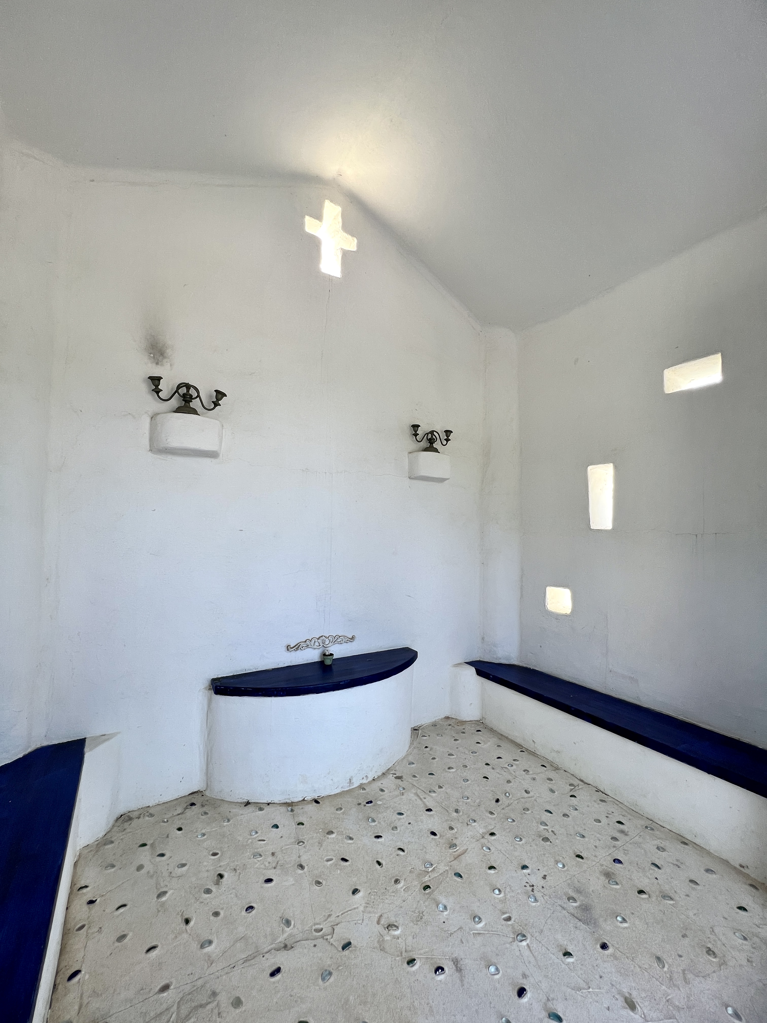 왼쪽 벽면에는 오병이어 상징을 부조로 표현했고, 뒤쪽 벽에는 십자가 모양의 창이 나 있어 고즈넉한 자연광을 예배당 안으로 끌어들여요. 섬에서 보는 수많은 별들이 내려온 듯 예배당 바닥에는 반짝이는 유리구슬이 박혀 있어요.