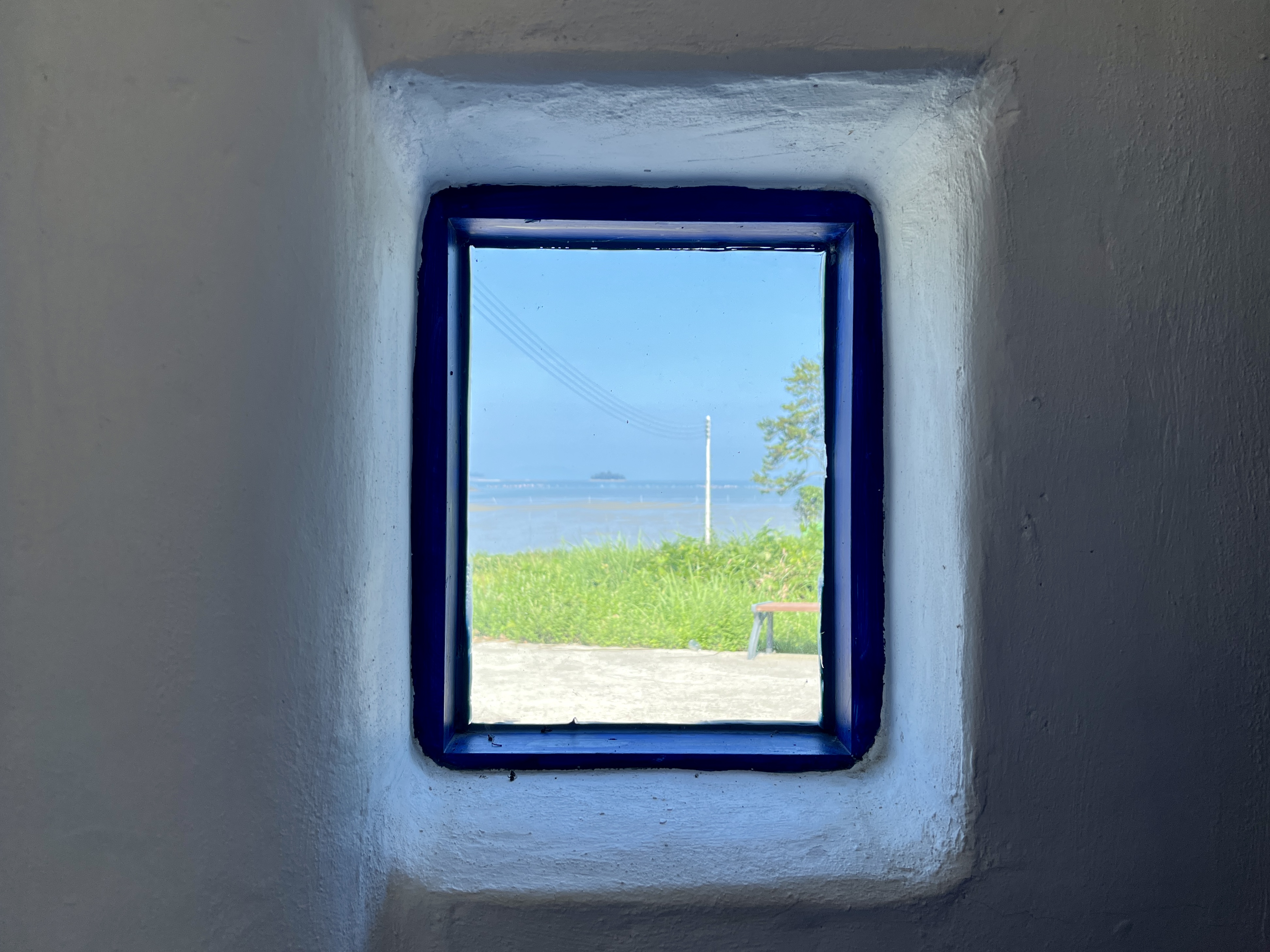 '인연의 집' 안에서는 네이비블루 창 너머로 소기점도 앞바다와 갯벌이 액자 속 그림처럼 내다보입니다.