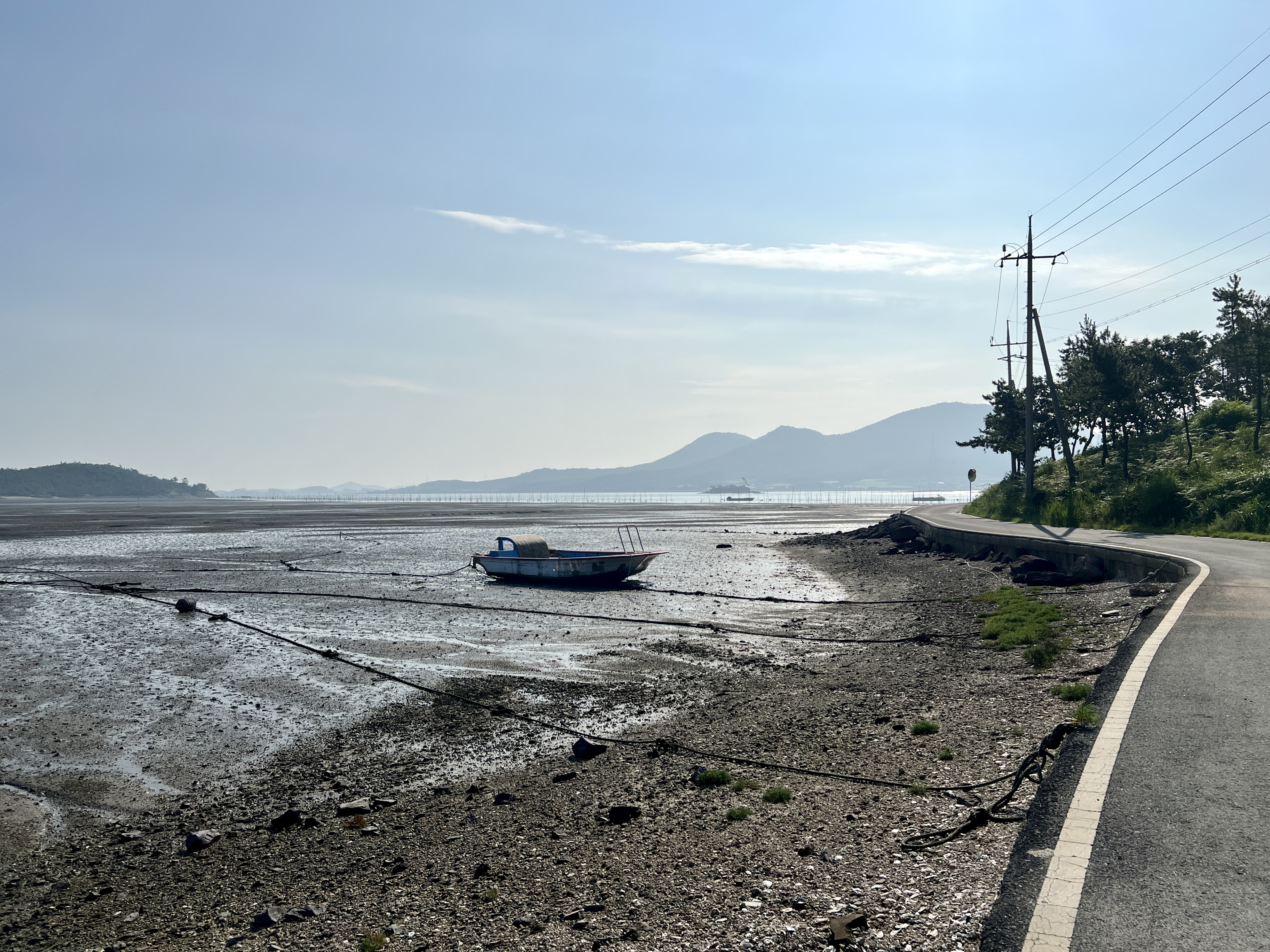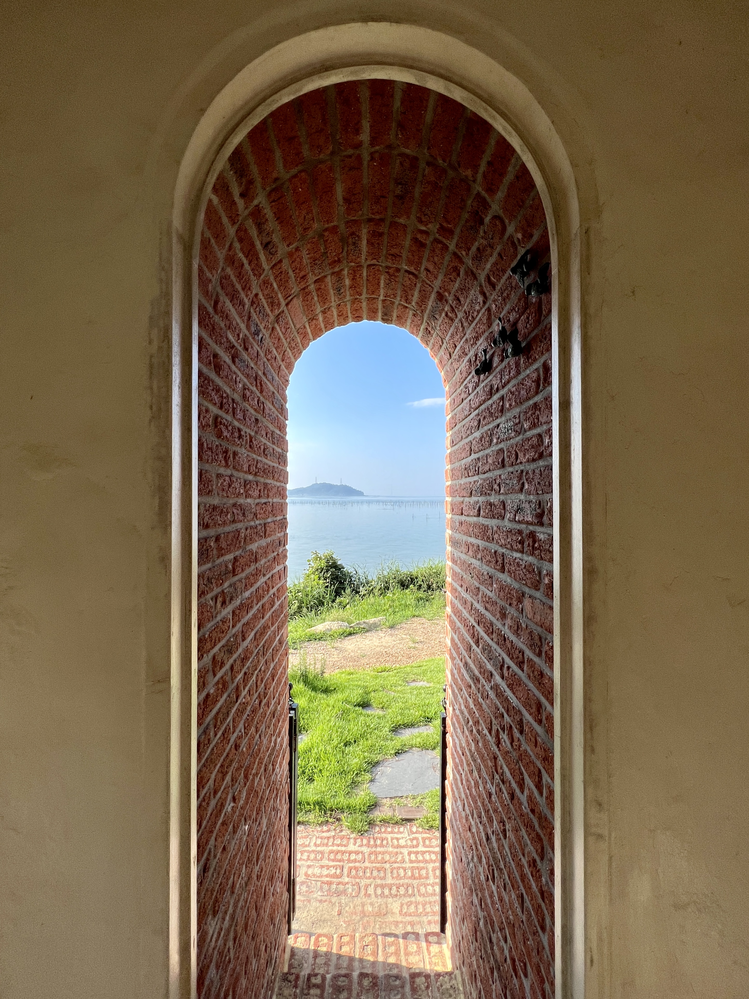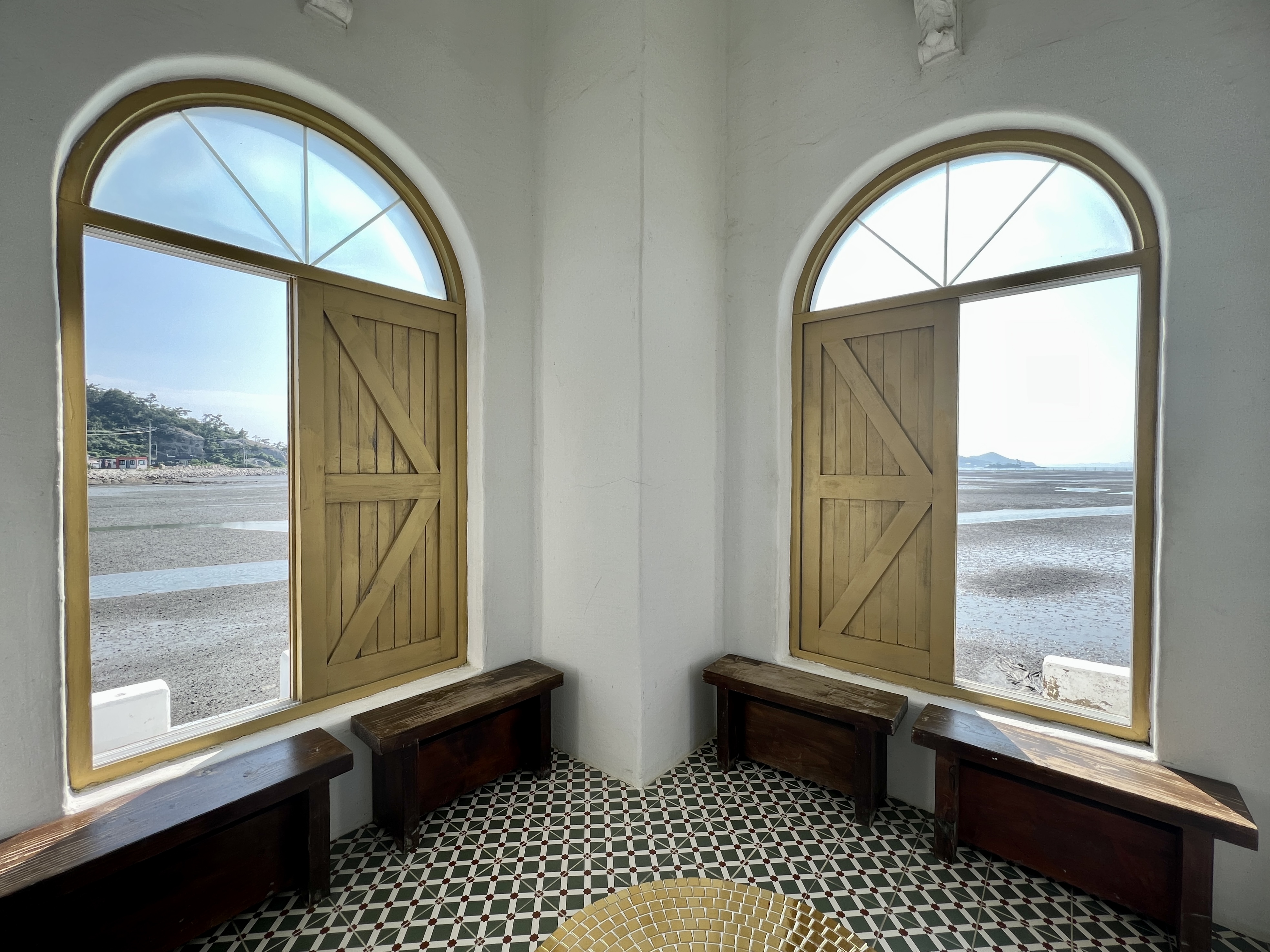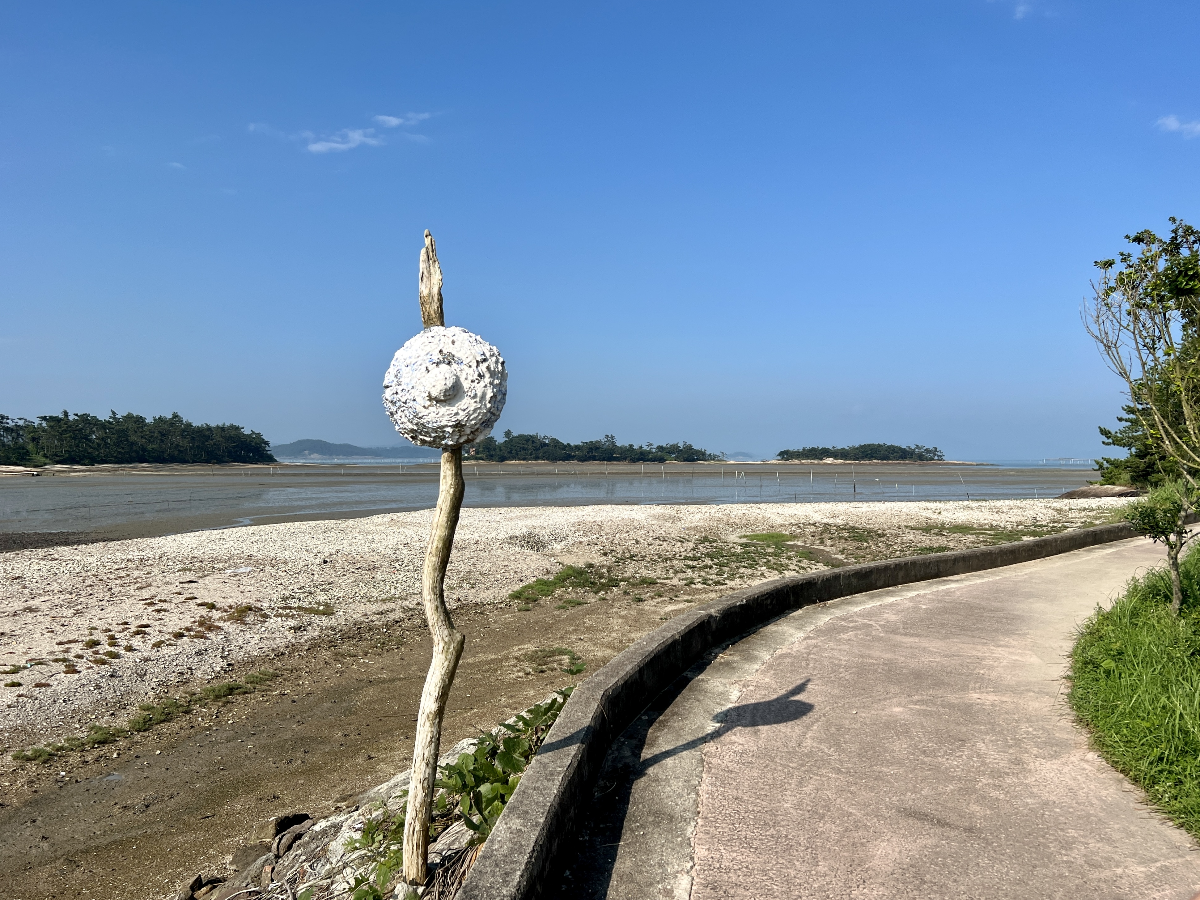 십자형 구조를 가진 이 작품은 세면의 벽에 난 큰 창문 너머로 드넓은 갯벌과 바다가 보여요. 사방에서 들어오는 갯바람에 땀을 식혔어요.