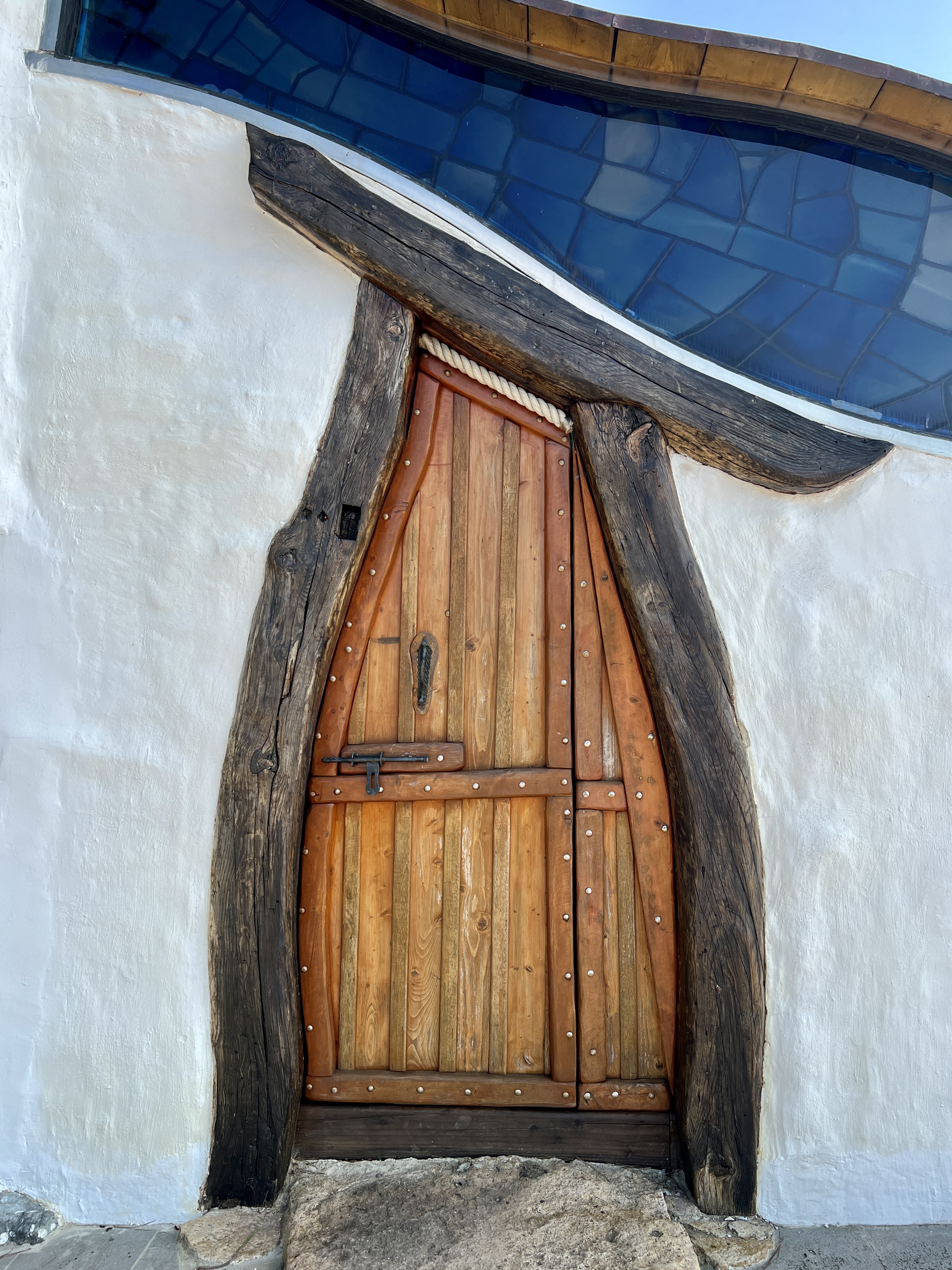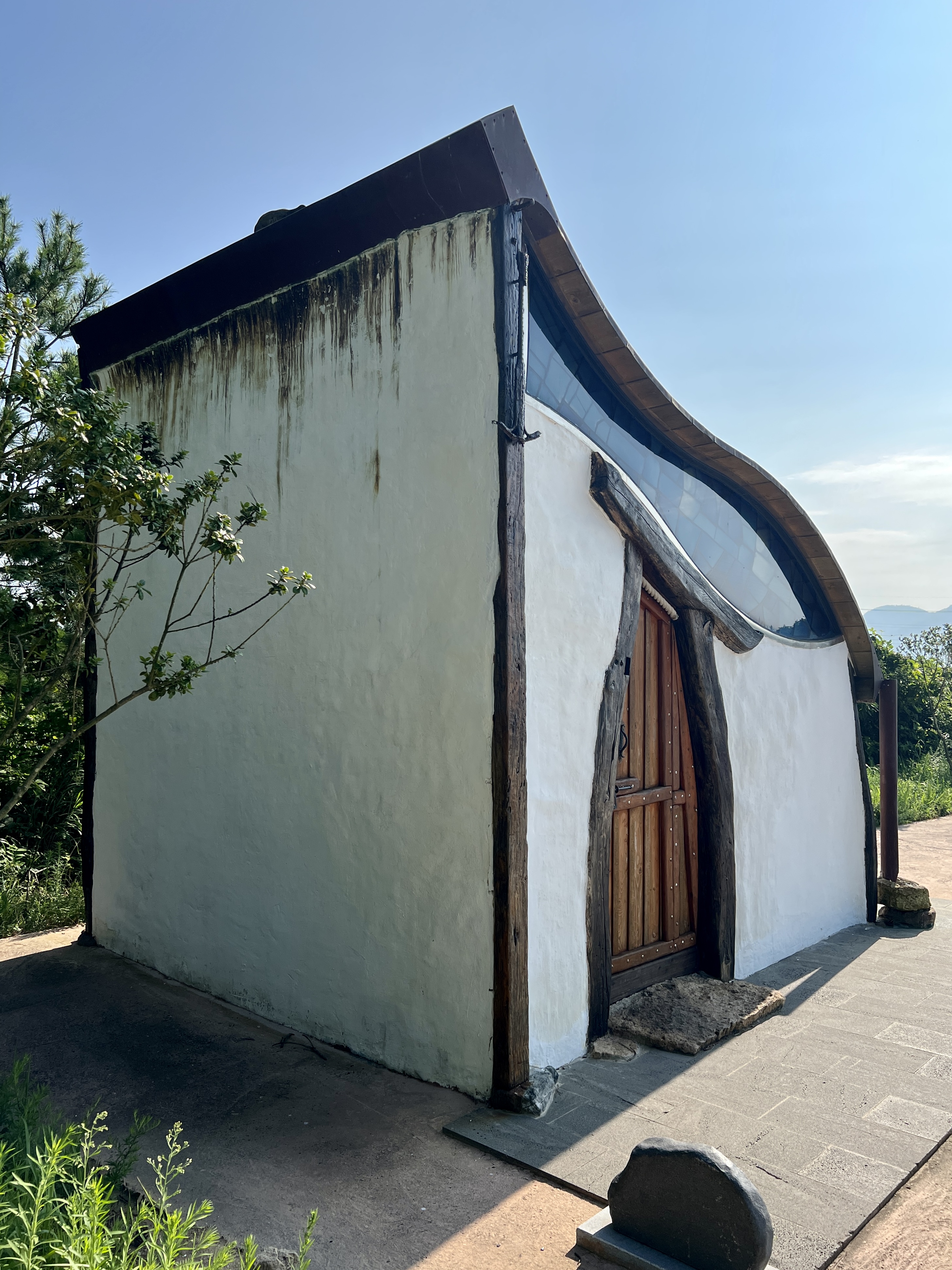 높게 쌓아 올린 정면 입구 벽 꼭대기에는 푸른 파도가 넘실대고, 예배당 지붕은 부드러운 곡선을 이루며 양쪽 끝으로 떨어져요. 직선과 곡선, 입구 면과 지붕면의 구성 대비가 안정적입니다.