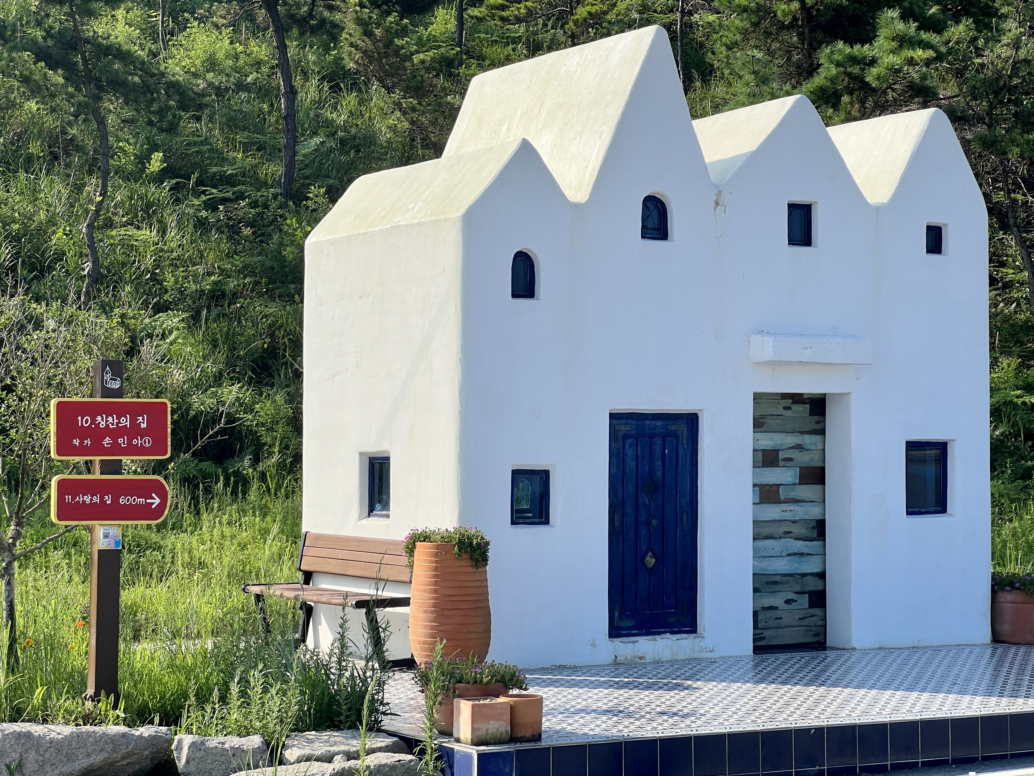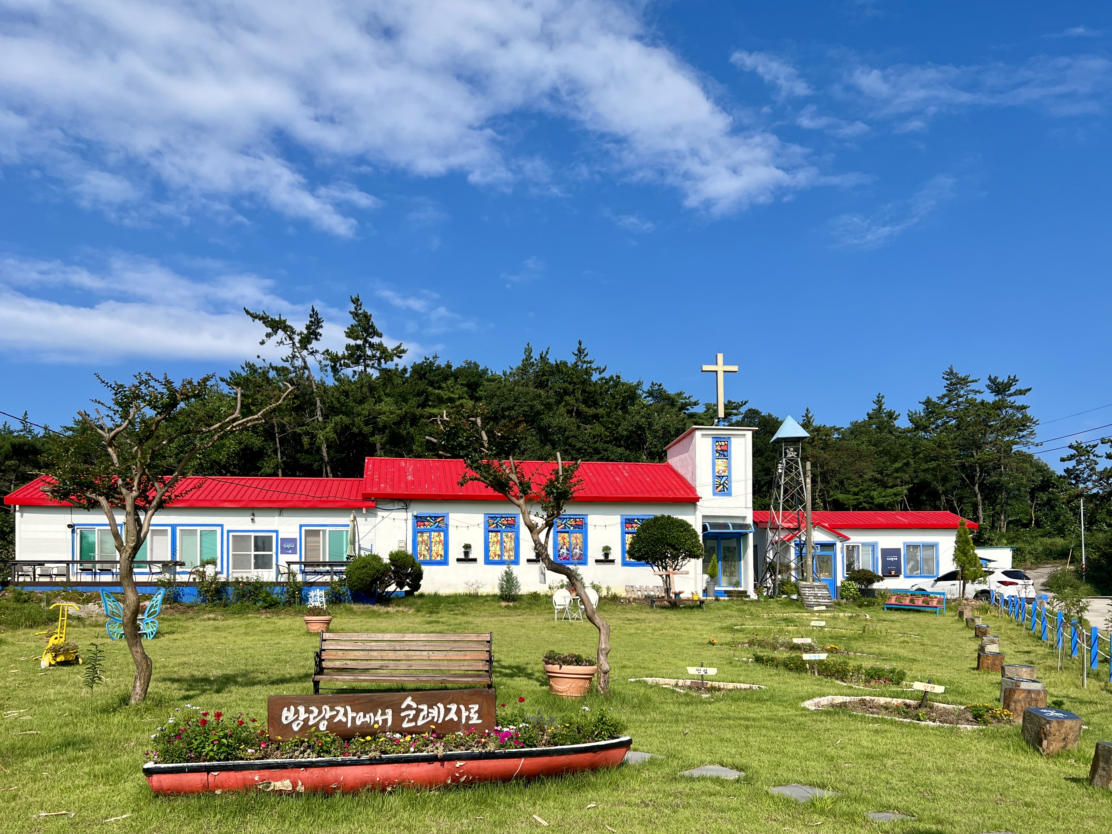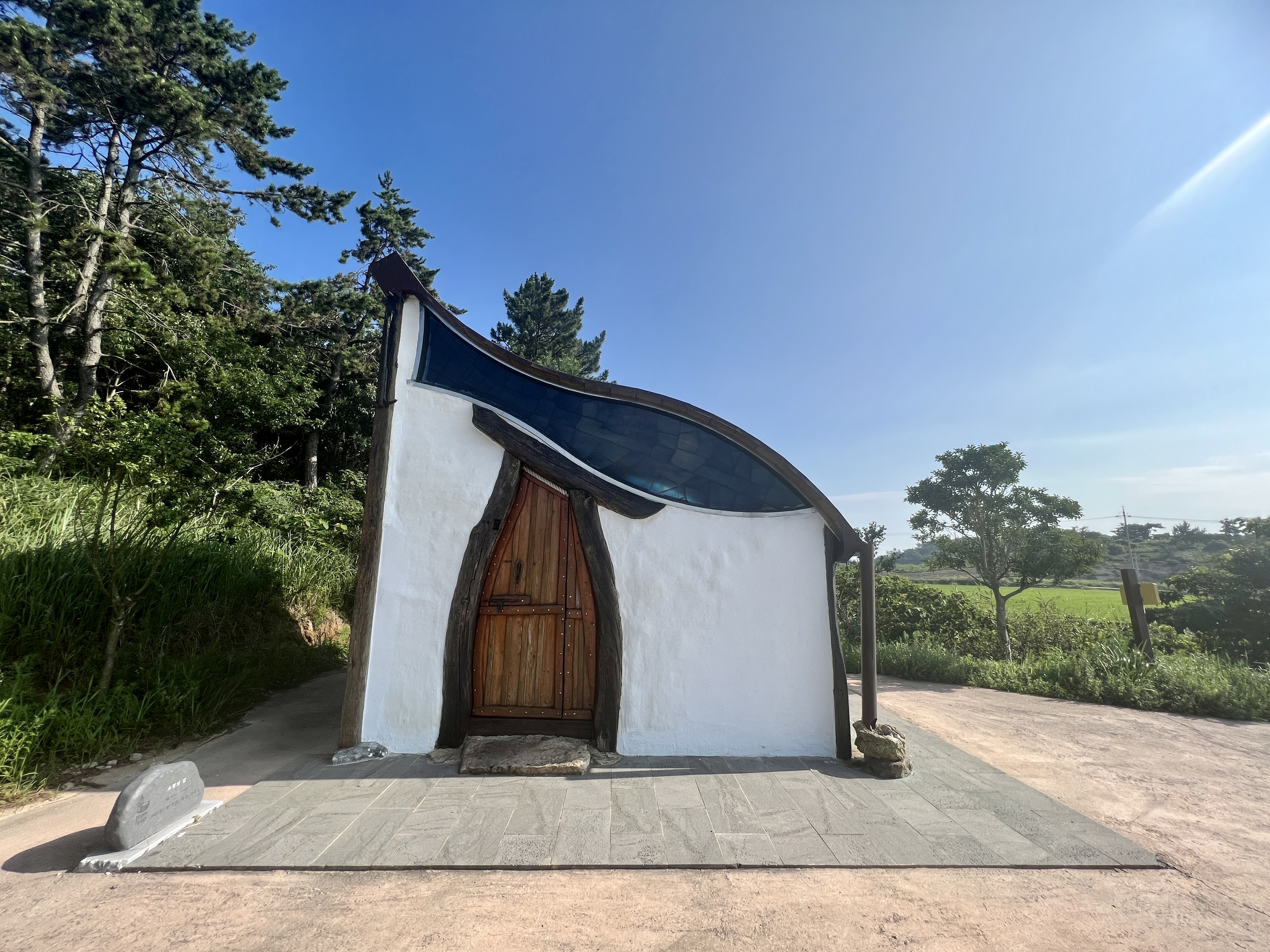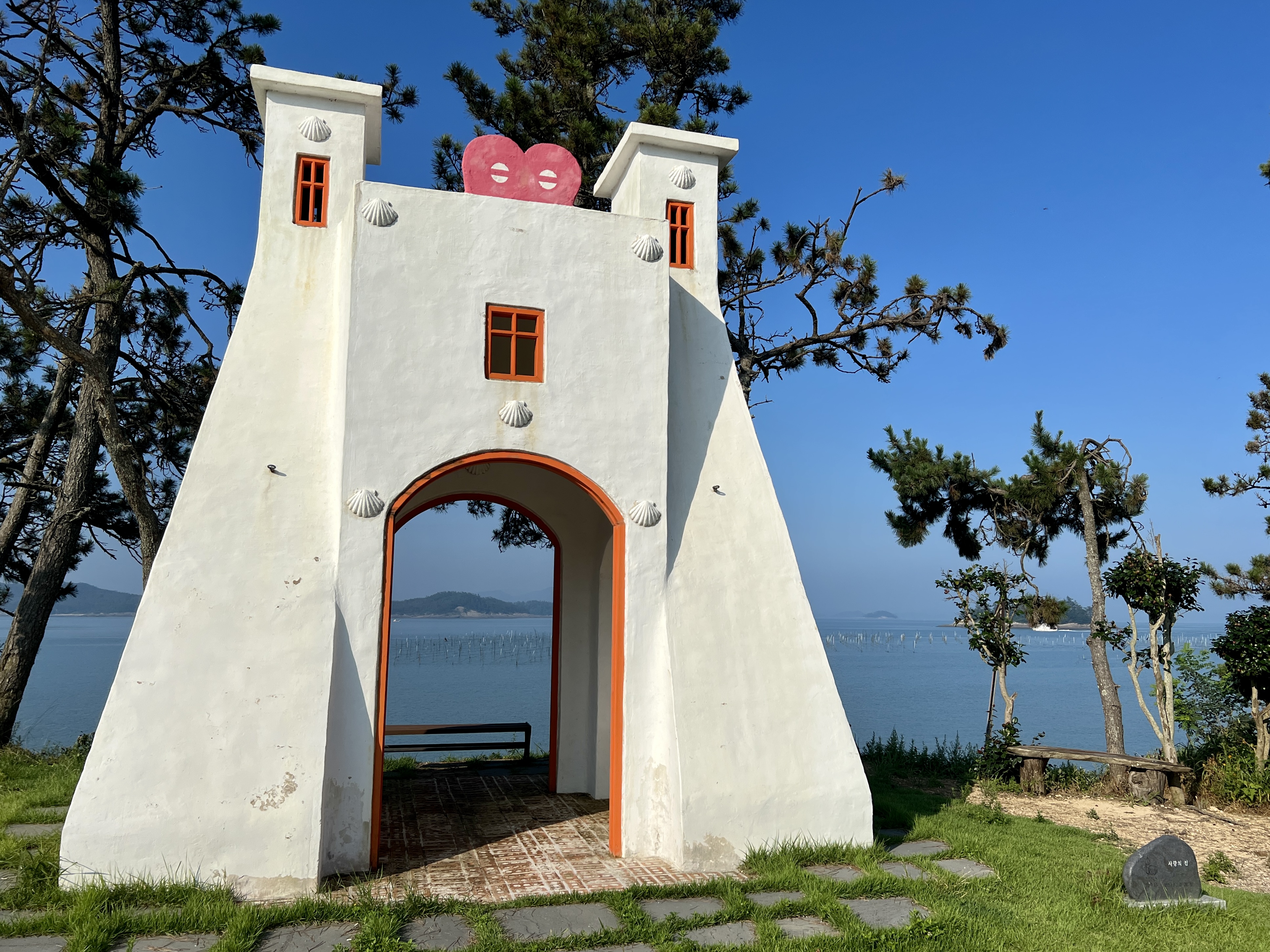 해안가 솔숲 가장자리에 '사랑의 집'이 있어요. 시몬의 예배당입니다. 실내외 공간이 구분되지 않는 개방형 구조로 자연을 예배당 안으로 끌어들인 강영민 작가의 작품이에요.