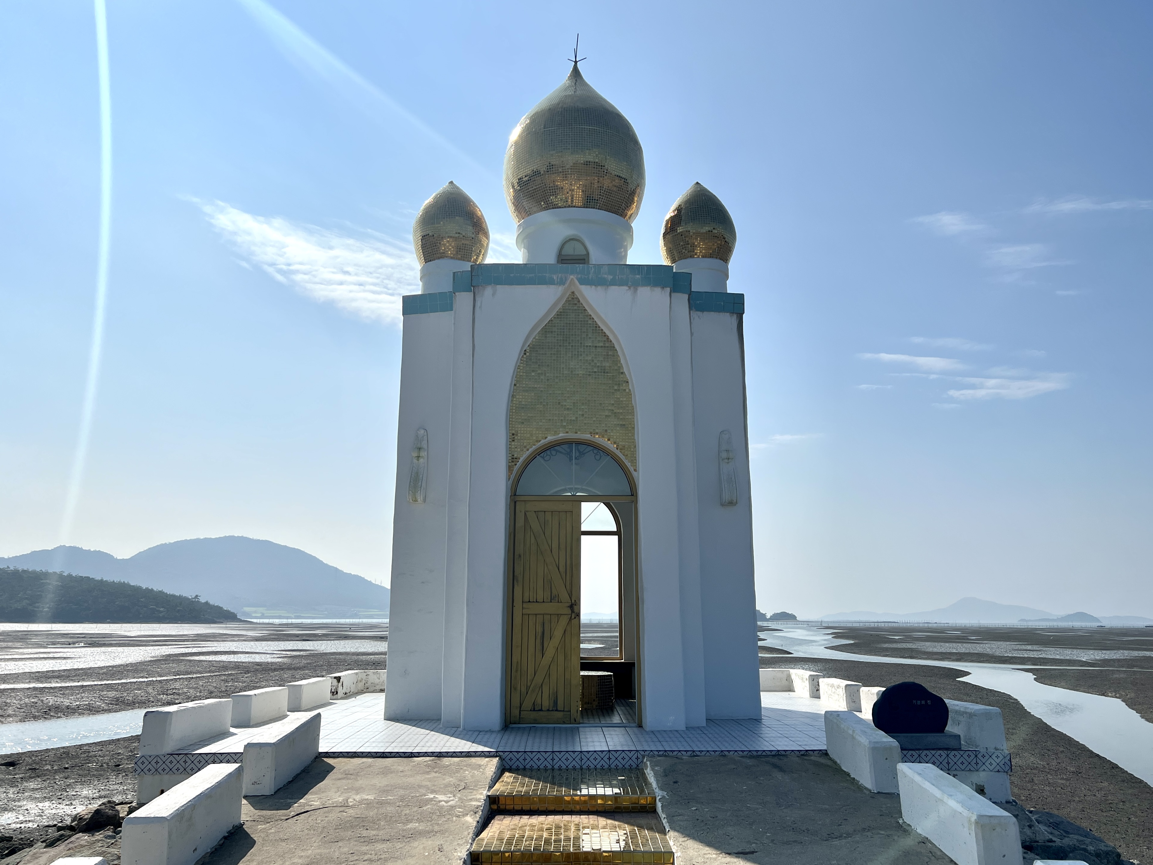 소기점도에서 소악도로 넘어가는 노둣길 갯벌 가운데, 바다를 향해 뻗어나간 계단 끝. 키 큰 예배당이 등대처럼 서 있어요. 세리였던 마태오를 상징하는 '기쁨의 집'입니다.