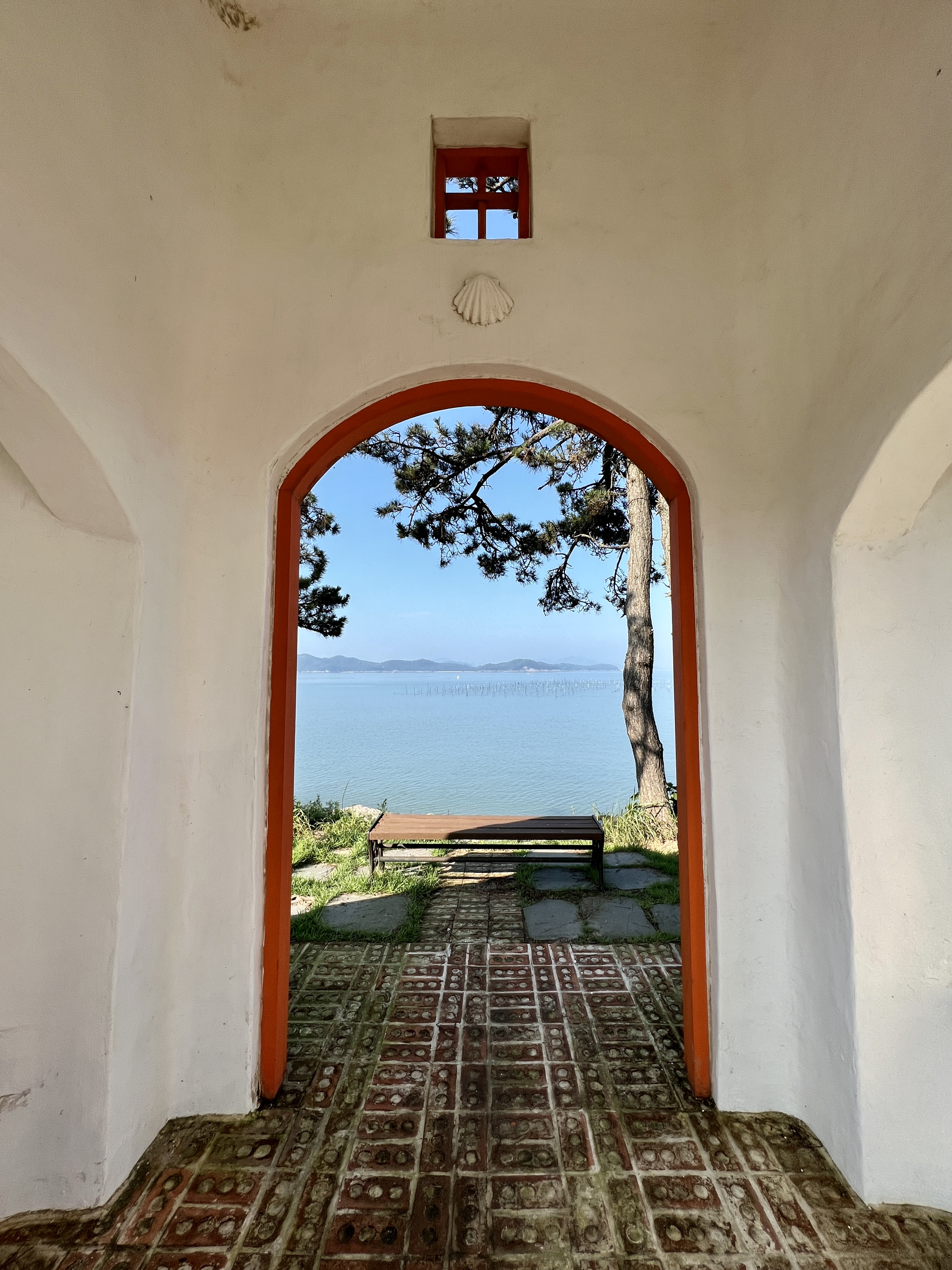 스테인드글라스로 들어온 푸른빛이 흰 석회 벽에 은은히 내려앉아요. 파도와 물고기 모양은 '평화와 풍어'라는 어부들의 소망을 담고 있어요. 우리의 소망도 마찬가지죠. 우리의 기도 목록에는 부귀영화가 아니라 가족, 연인, 친구, 스승, 선후배, 어르신의 안녕이 채워져 있습니다.