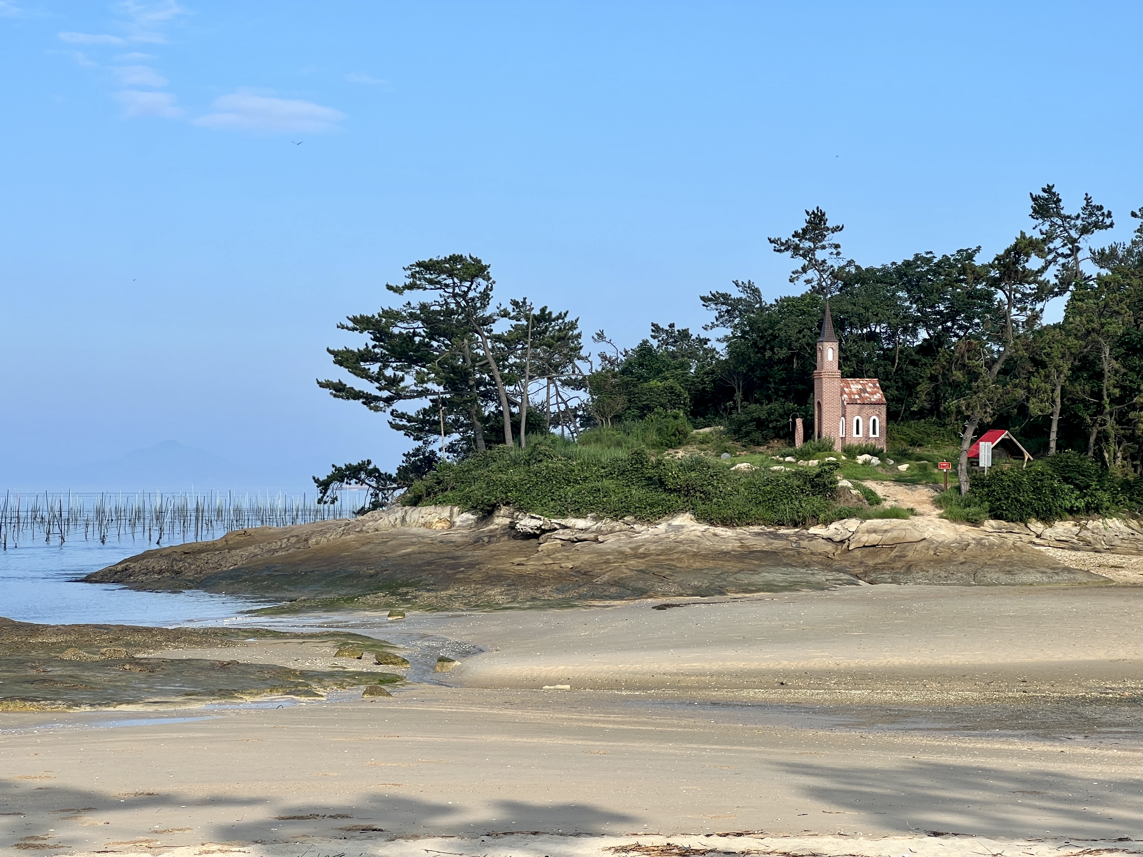 '사랑의 집'에서 대나무 숲길을 헤치고 돌아 들어가면 갑자기 바닷물이 빠진 모래 해변이 나타나요. 갯벌 너머로 그림 같은 딴섬이 보인답니다.
