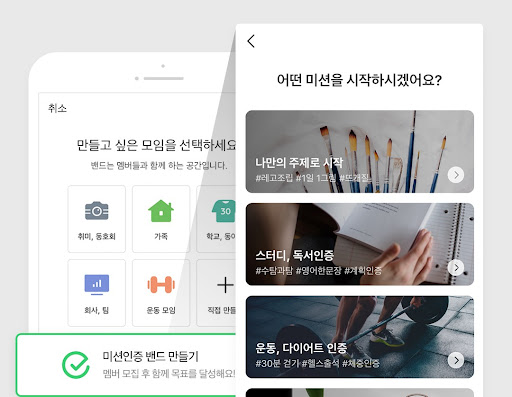 인맥 관리를 위해 밴드에 가입하는 이들도 많아요. 밴드에는 글쓰기, 1만 보 걷기, 그림 그리기 등 다양한 콘셉트의 '주제별 미션 밴드'가 있어서 같은 목표를 가진 이들과 자신의 하루치 목표를 기록하고 공유하며 응원할 수 있어요.