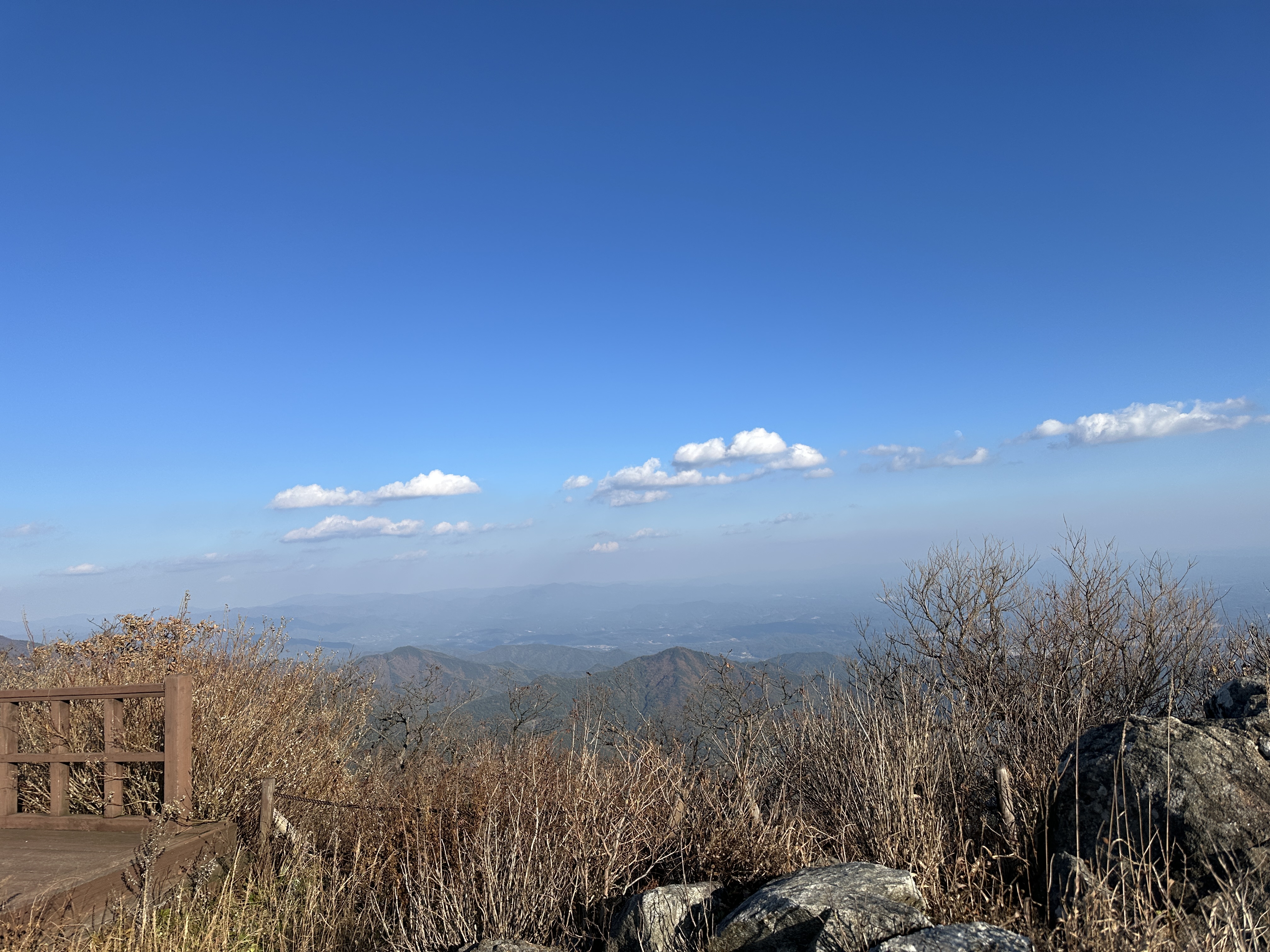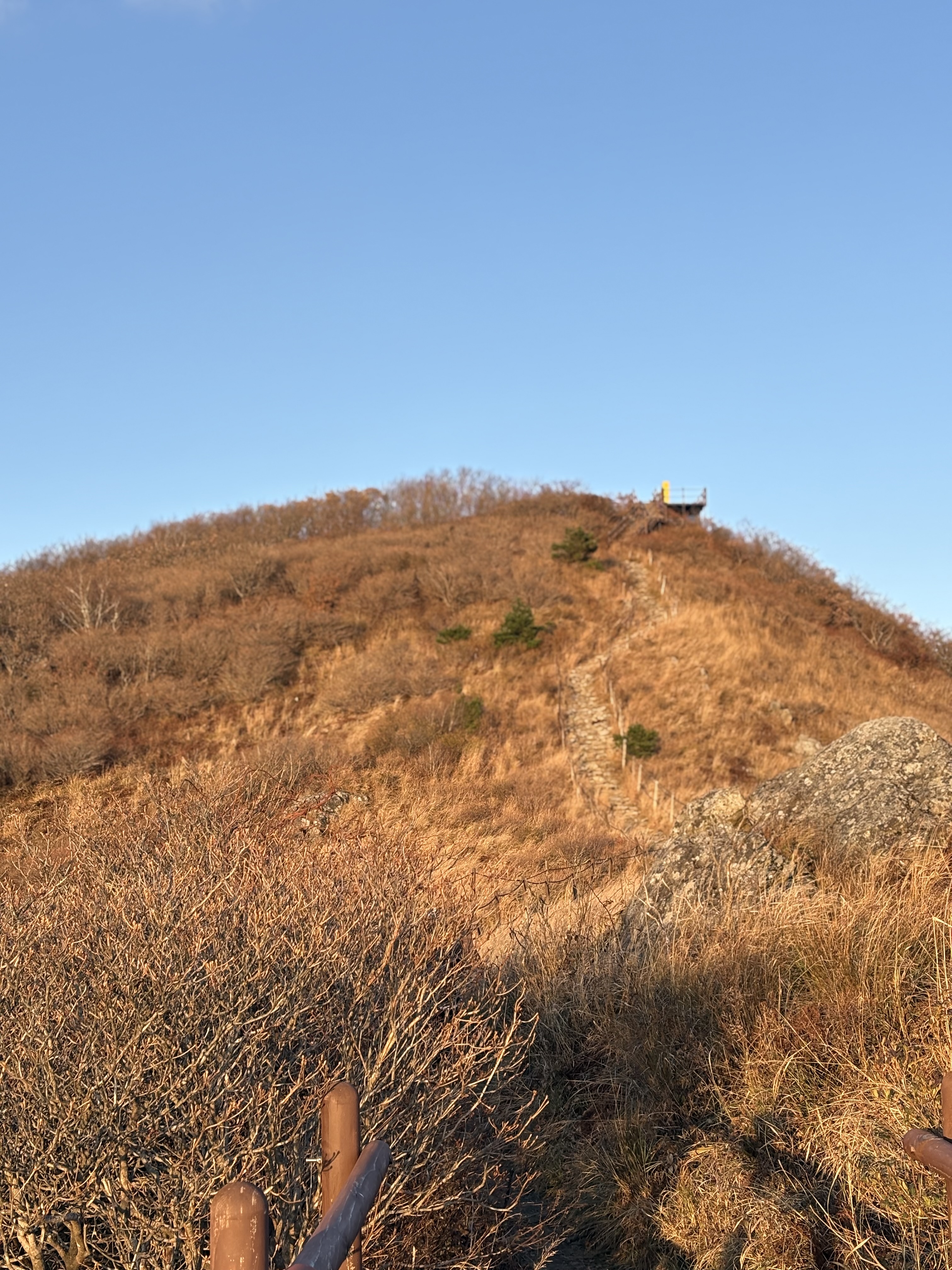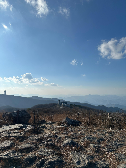 등산의 마지막 구간을 지나 정상에 오르면, 드넓은 하늘 아래 자리한 연화봉 표지석을 마주하게 됩니다. 연화봉은 산의 생김새가 연꽃처럼 생겼다 하여 붙여진 이름이라고 하는데요. 연화봉을 직접 마주했을 땐, 나무가 드물어 시야가 탁 트이고, 발아래 펼쳐진 산맥 덕에 아름다운 꽃의 느낌보다는, 웅장한 느낌이 가장 먼저 와닿았습니다. 하지만, 그것도 잠시, 매섭게 불어오는 칼바람이 얼굴을 세차게 때려오기 시작했는데, 다행스럽게도 쭉 뻗어져 있는 능선길과 끝없이 펼쳐져 있는 맑은 하늘 덕분에 얼마 안 가, 그 아픔으로부터 무뎌지게 되었습니다.