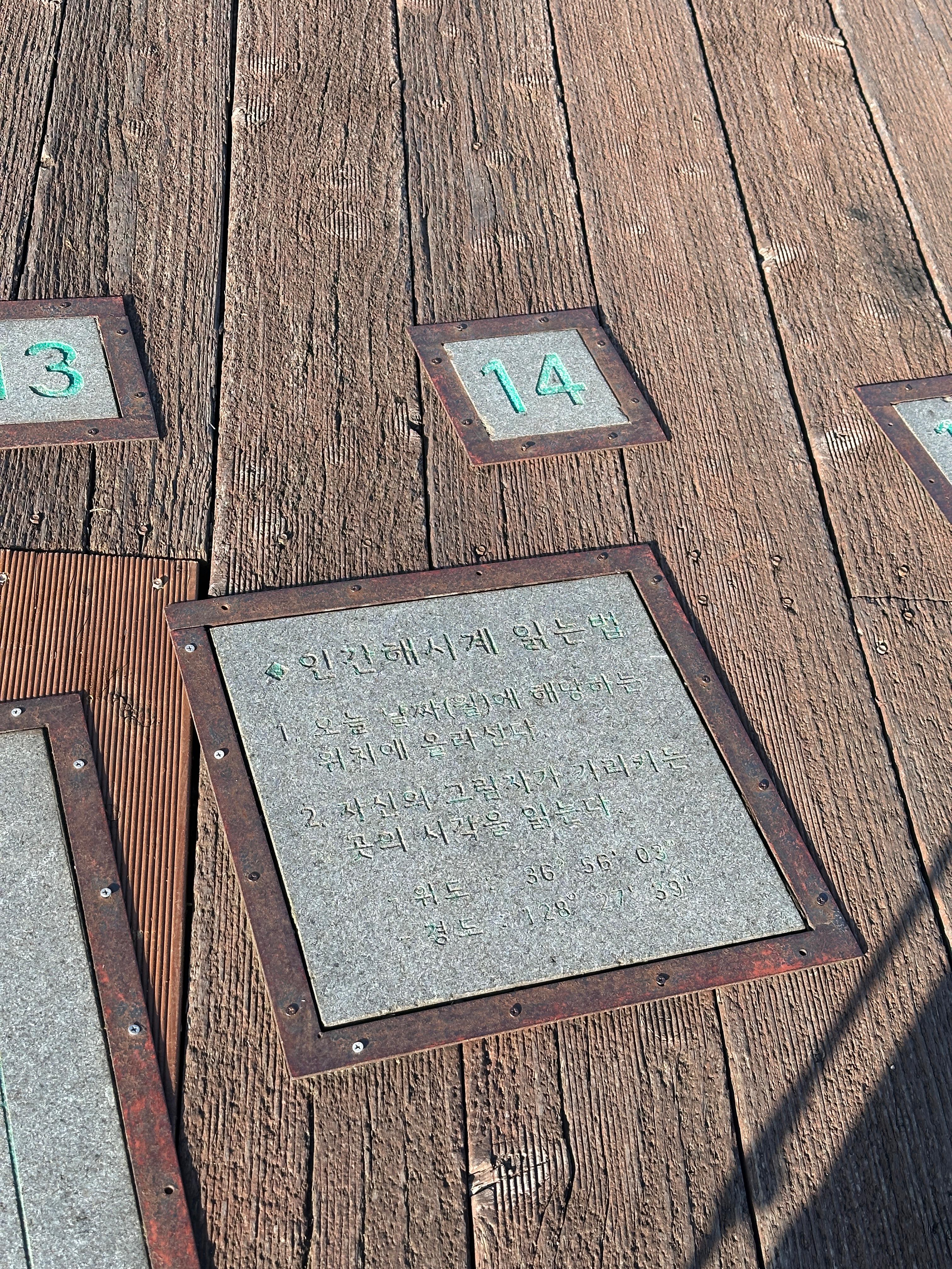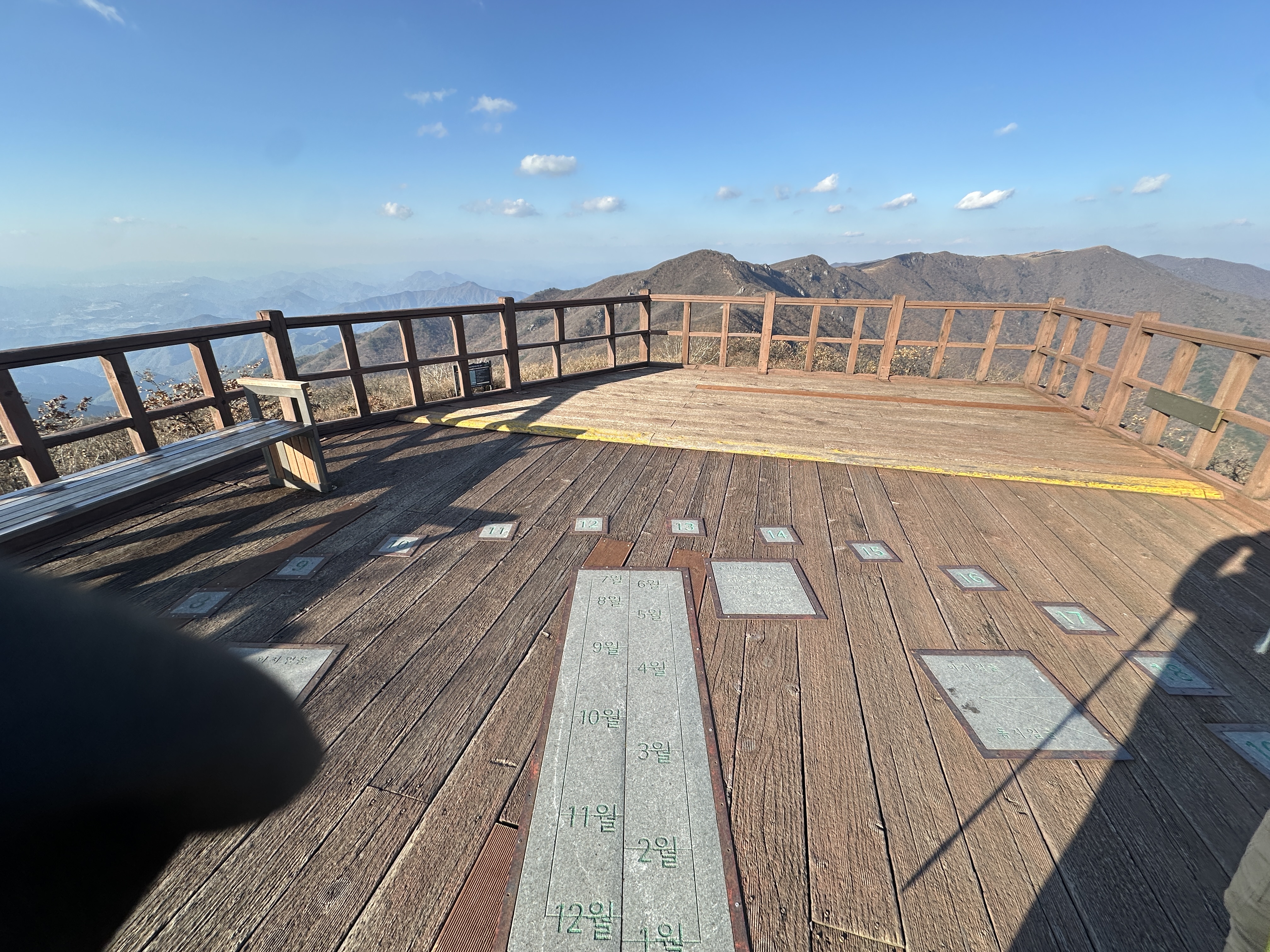 연화봉 표지석에서 옆으로 눈길을 돌리면, 인간 해시계가 되어보는 재미있는 체험까지 해볼 수 있도록 나무 데크가 마련되어 있는데, 사용법은 아주 간단합니다. 방문한 달이 표시된 돌 위치에 올라서면 그림자가 시침이 되어 시간을 표시해 줍니다. 과연 시간이 맞을까 반신반의하며 스마트폰 시간과 비교해 보았는데 약간의 오차가 있었지만 얼추 맞아 신기할 따름이었습니다. 연화봉 정상에 머물렀던 순간은 산의 조망을 감상하는 순간과 더불어 옛 선조들의 과학적 지식에 감탄하게 되는 순간이었습니다.