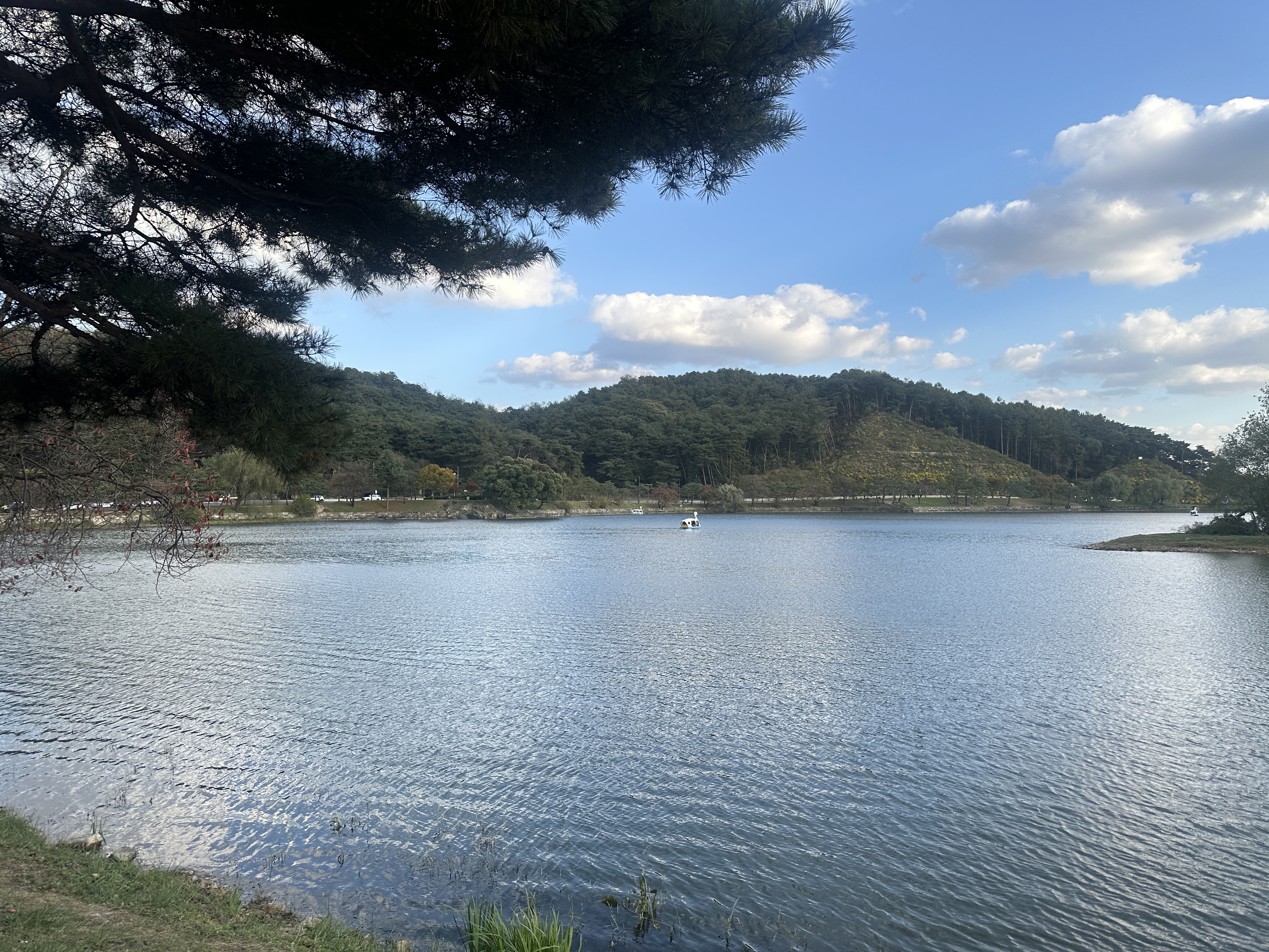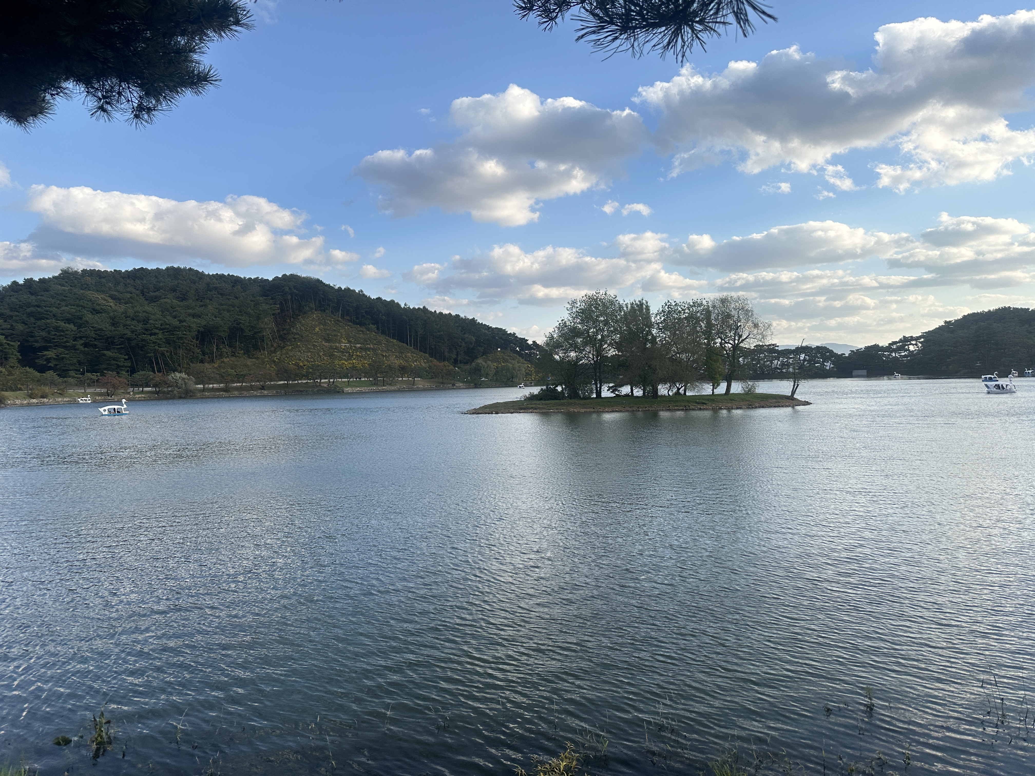 잔잔한 호수 위에 묵묵히 자리 잡고 있는 작은 섬 같은 것이 그 특유의 고요함을 한껏 더해주는 듯하였습니다. 게다가 호수에 내리쬐는 햇살과 반짝이는 윤슬, 호수 위를 노닐고 있는 오리 배들까지.