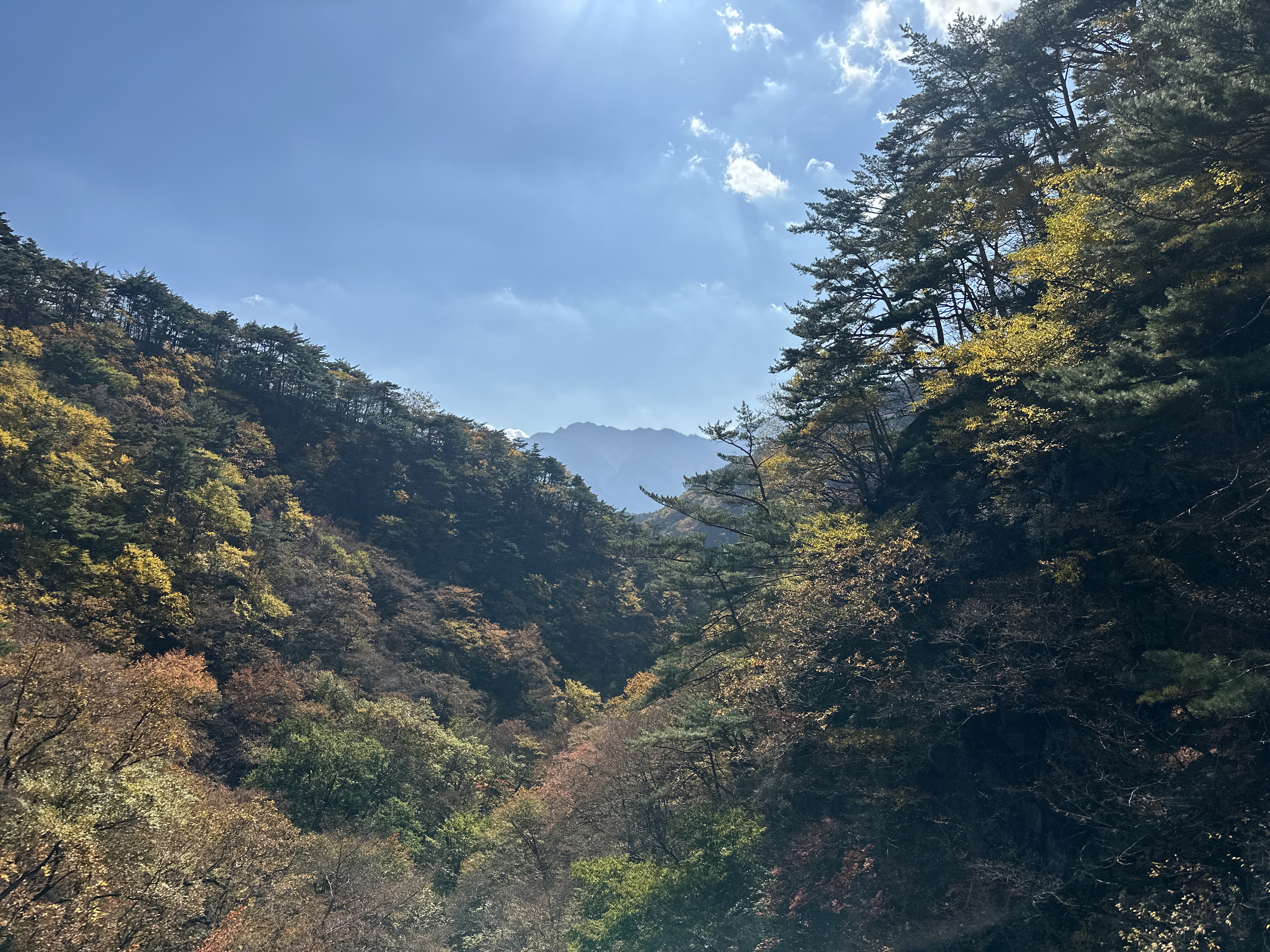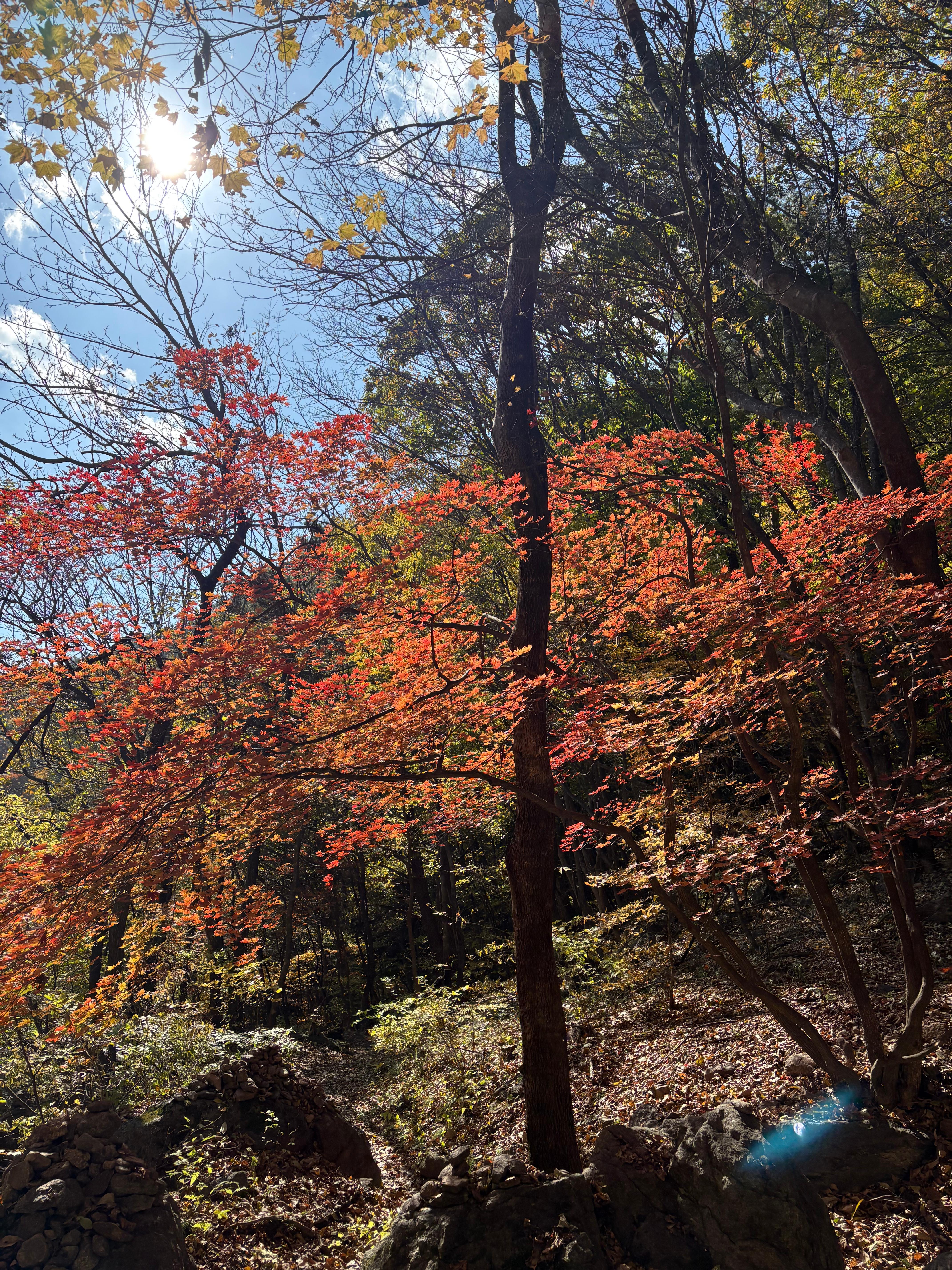 빛이 스치면 나뭇잎이 반짝이고, 바람이 불면 그 빛이 흩날리는 덕에 숲 속은 마치 붉은 빛과 노란빛이 뒤섞인 살아 있는 그림처럼 느껴졌고, 발자국을 옮길 때마다 들려오는 낙엽의 바스락거림이 발걸음에 리듬감을 실어주었습니다. 중간중간 나무 사이로 들어오는 햇살이 만들어내는 빛의 터널은 사진으로는 다 담을 수 없었던, 그래서 온몸으로 음미하게 됐던 특별한 광경이었습니다.