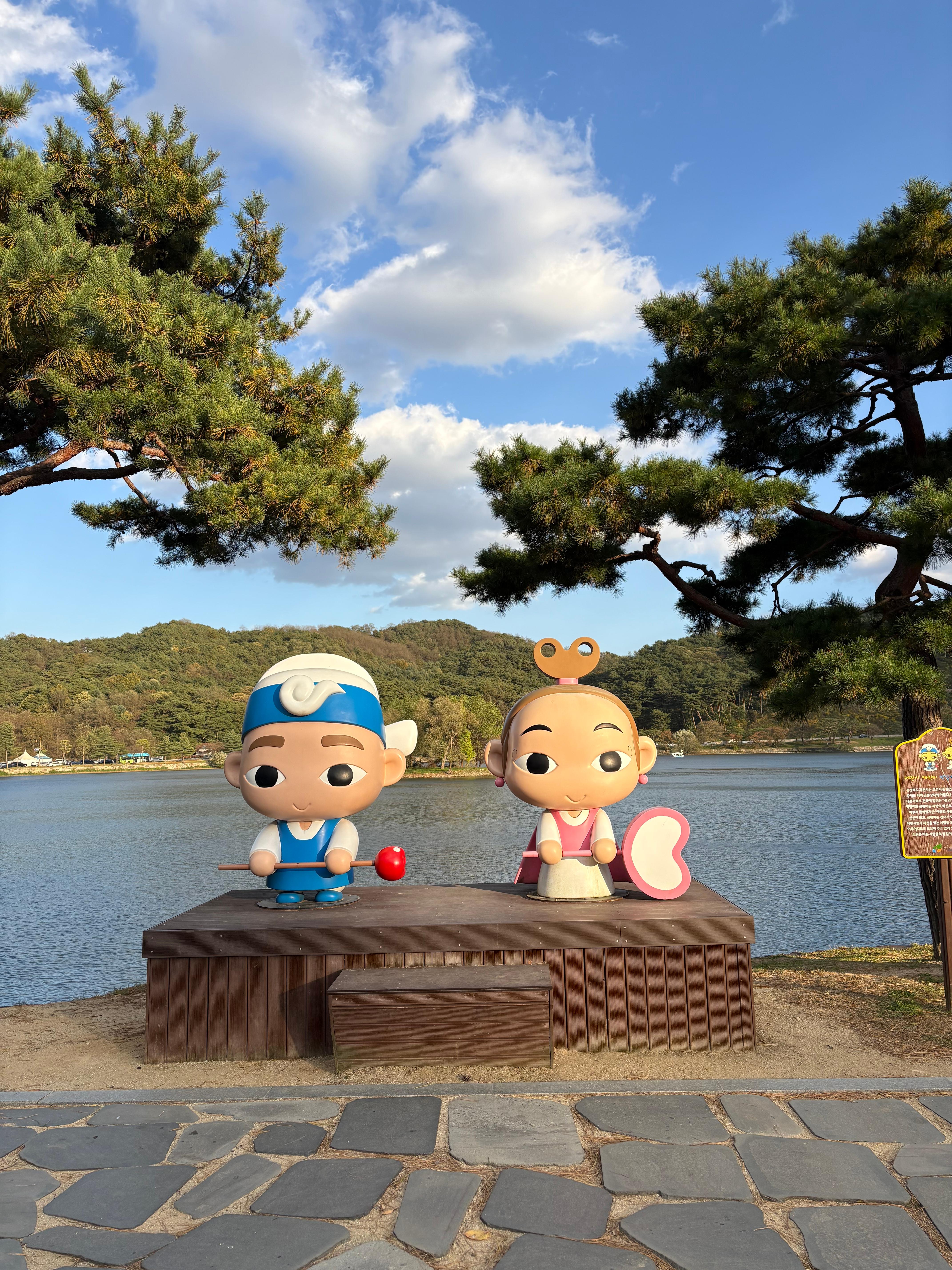 의림지 입구에 다다르자, 수줍은 표정으로 사람들을 환영하고 있던 제천시의 마스코트, 박달신선과 금봉선녀를 만나볼 수 있었는데요. 이 둘의 설화를 알아보니, 귀여운 생김새와는 다르게 서로를 그리워하다 끝내 엇갈린 채 비극적으로 끝을 맺게 된 애절한 사랑 이야기가 얽혀 있었습니다. 하지만, 제천시는 이 설화의 끝을 제천에서 다시 만나 행복하게 살아간다는 해피엔딩으로 재구성하여, 이 둘을 제천시의 마스코트로 삼았다고 합니다.