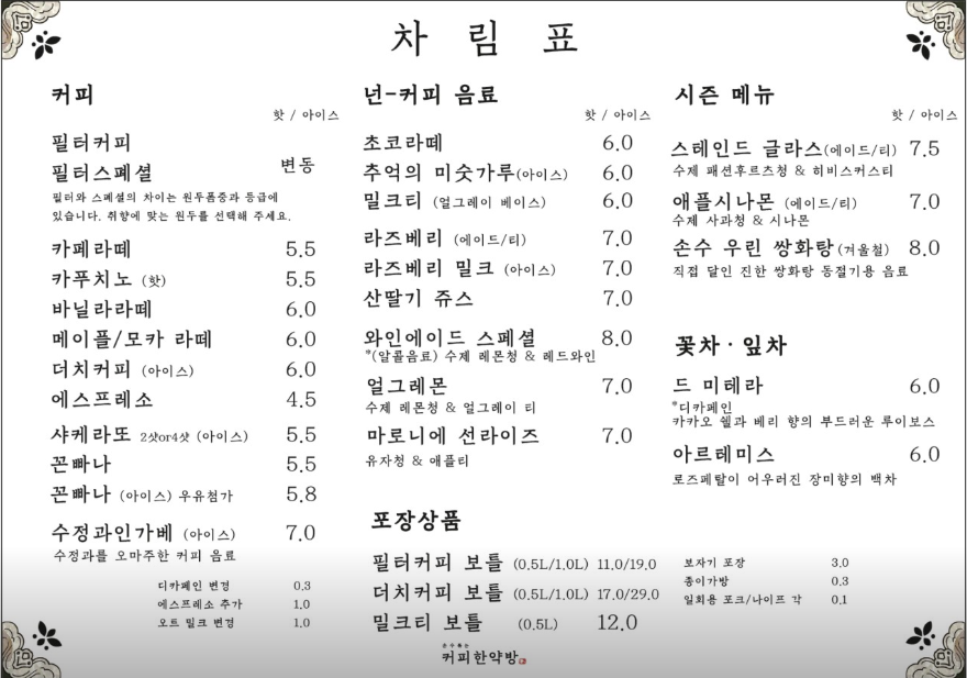 실내로 들어가면 과거 실제로 사용되던 약장과 나무 진열대가 그대로 벽면을 채우고 있었고, 테이블과 의자, 조명까지 과하게 꾸며낸 느낌이 아니라 원래 있던 구조 위에 최소한의 인테리어 변경만 더한 모습이었어요. 카페라기보다 오래된 한약방 안에 잠시 머무는 기분이 들 정도로 공간 자체가 주는 특별함이 있었습니다. 재치 있다고 느꼈었던 부분은, 간판에 '저희는 한약조제는 모릅니다.'라고 적혀있는 부분이었습니다.