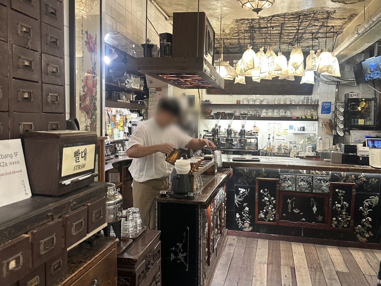 을지로3가 골목 안쪽에 자리한 커피한약방은 실제 한약방 건물을 최소한의 보수만 거쳐 그대로 활용한 공간이라고 합니다. 해방 전후에 지어진 건물 특유의 질감과 구조가 남아 있어서 복고풍 인테리어가 아니라 시간 자체가 만든 분위기라는 점이 가장 먼저 눈에 들어왔어요. 입구는 생각보다 좁고, 혜민당과 서로 마주 보고 있는 골목 사이로 로스팅 커피 향이 가득 퍼졌습니다. 오래된 건물 외벽은 군데군데 페인트가 벗겨져 있고, 복잡한 전선들이 위쪽을 채우고 있어서 을지로가 지닌 시간의 층위가 그대로 드러나 보였습니다.