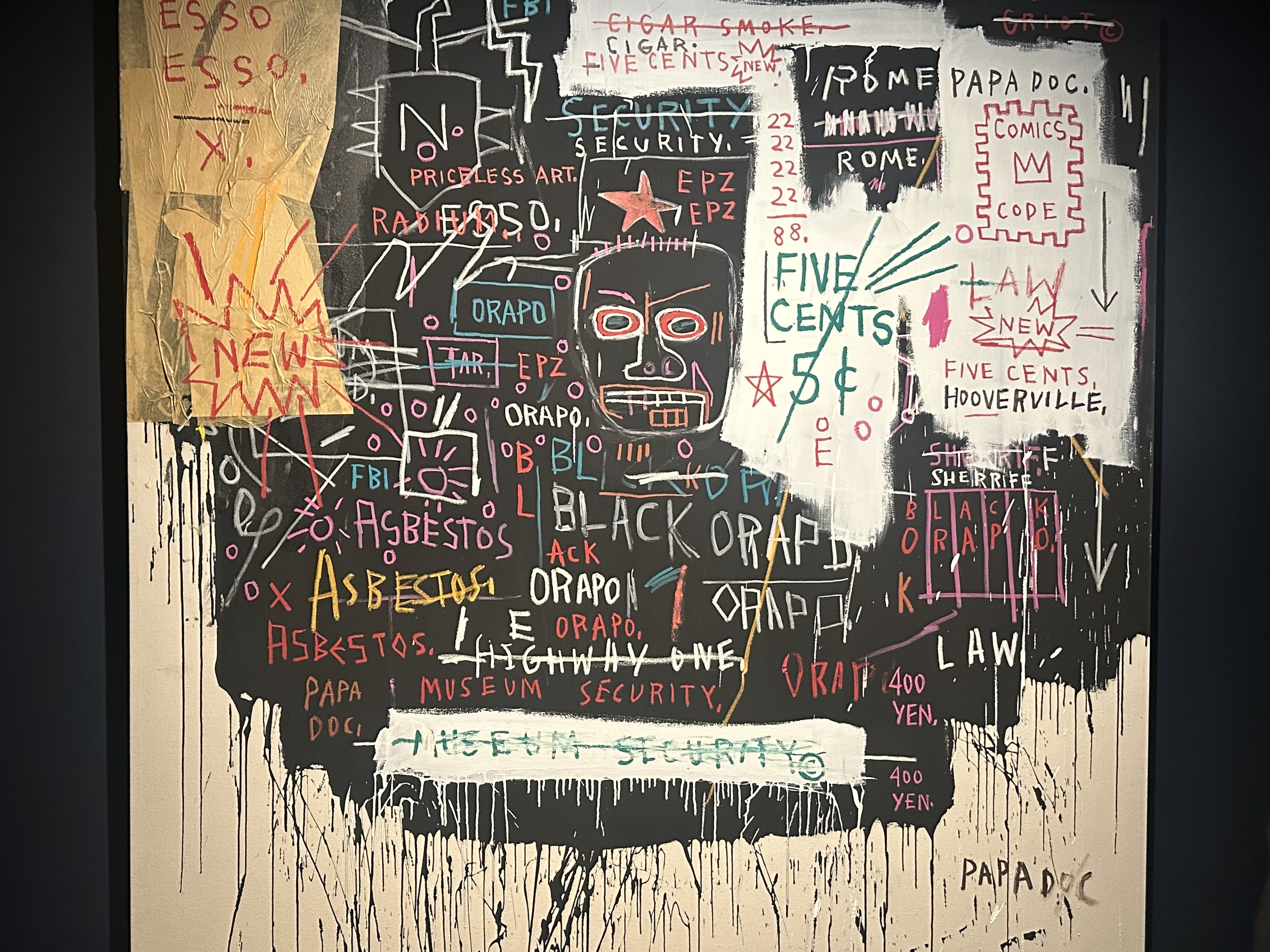 대표적으로 소개된 작품이 'Phooey'였는데, 일본의 경제·기술적 영향력을 암시하는 문장이 적혀 있는 작품이었어요. 바스키아가 뉴욕이라는 도시 안에서 미국, 일본, 아프리카, 카리브 문화까지 한 화면에 뒤섞어 놓는 방식이 어떤 모습인지 보여주는 예시처럼 느껴졌습니다.