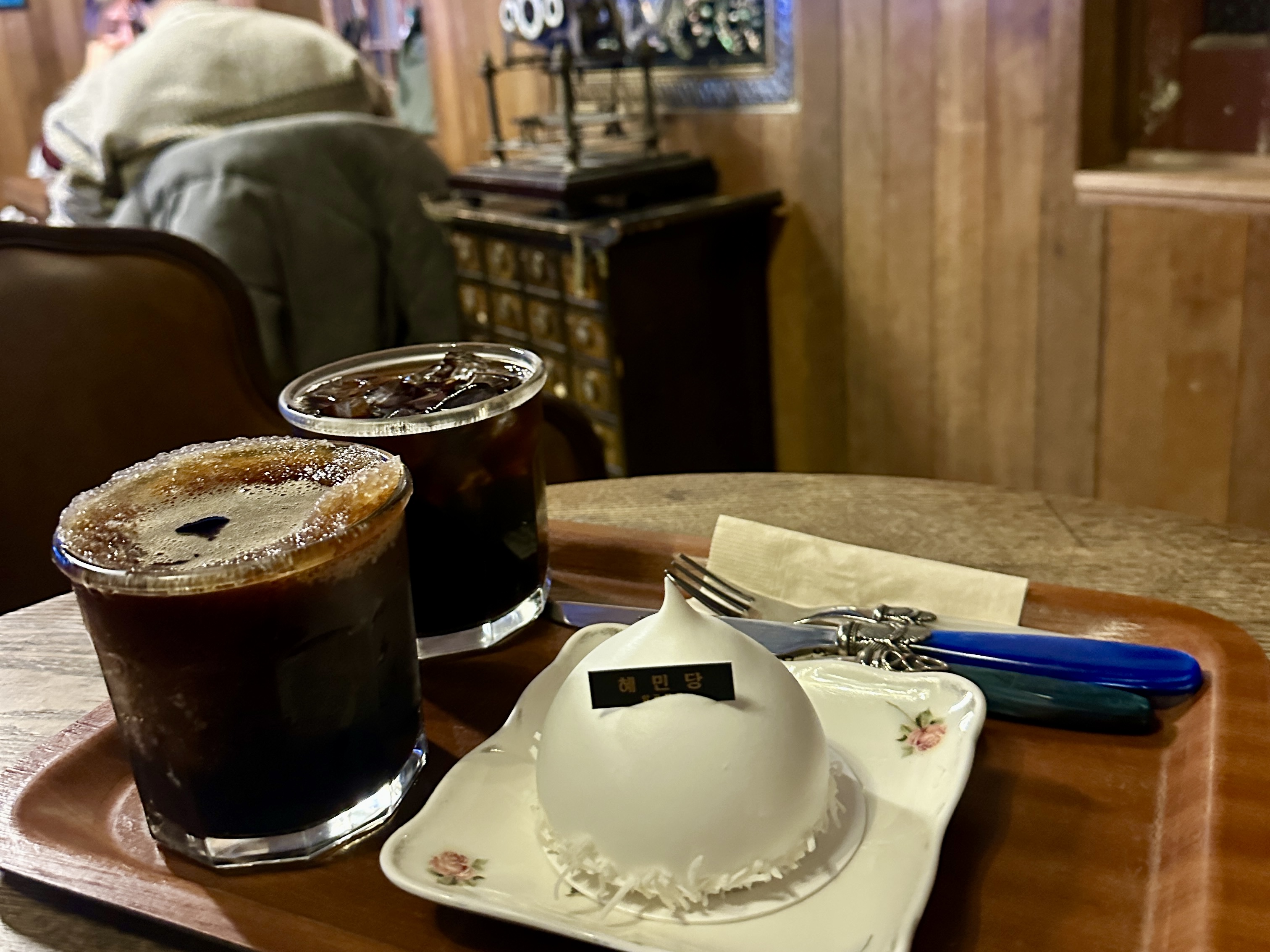 메뉴는 필터 커피와 에스프레소 기반이 중심이었고, 산미가 살아 있는 원두부터 묵직하고 고소한 블렌드까지 선택 폭이 다양했어요. 혜민당에서 매일 아침 직접 구워내는 케이크와 구움 과자류도 인기가 많아서, 커피와 함께 주문하는 손님들이 자연스럽게 눈에 띄었습니다.