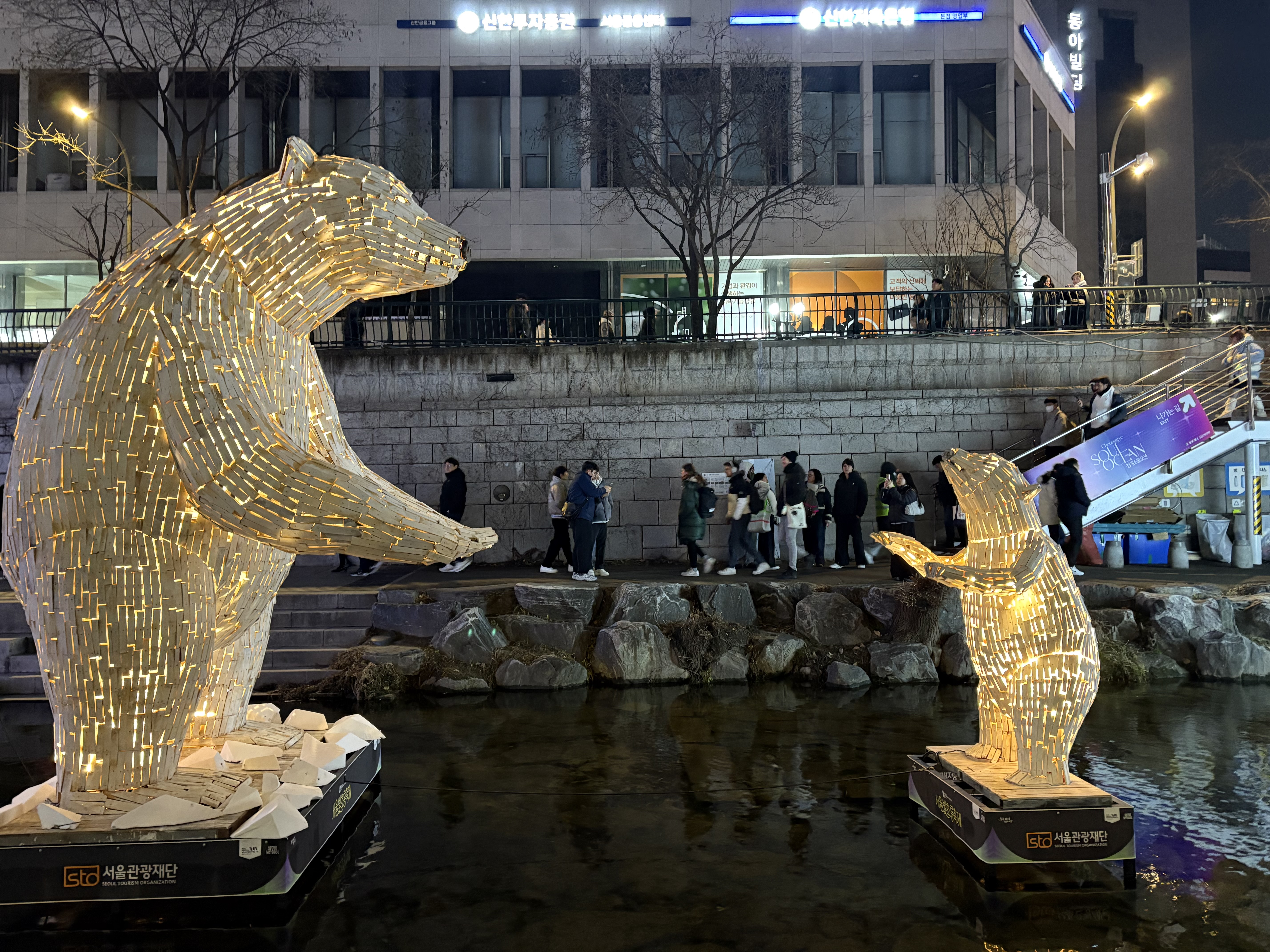 먼저, 청계 광장에 들어서면 크리스마스가 다가옴을 한껏 느낄 수 있도록 크리스마스와 연관된 조형물들이 전시되어 있었습니다. 크리스마스 트리부터 북극곰, 루돌프, 산타 등 어느새 크리스마스도 머지않았음을 실감하게 되었죠. 조형물만큼이나 제 시선을 빼앗았던 것은 이곳의 분위기를 동심 가득한 표정으로 즐기고 있었던 아이들의 모습이었고, 그런 아이들의 밝은 모습을 사진으로 기록하고 함께 즐기고 있던 어른들의 모습이었습니다.